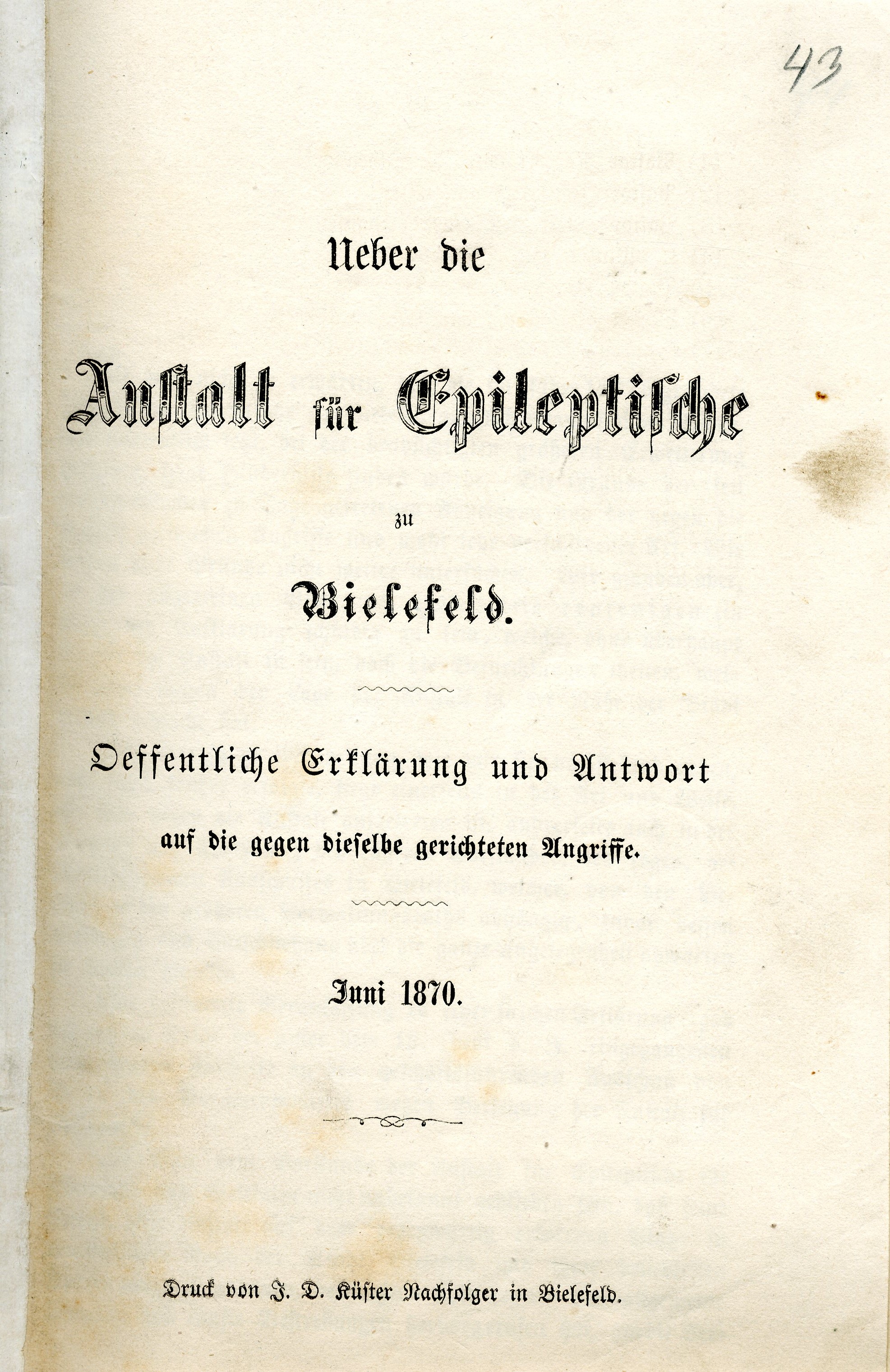 - Stadtarchiv Bielefeld, Bestand 300,7/Kleine Erwerbungen, Nr. 136: Bemühungen um eine Verlegung der Anstalt für Epileptische, 1870