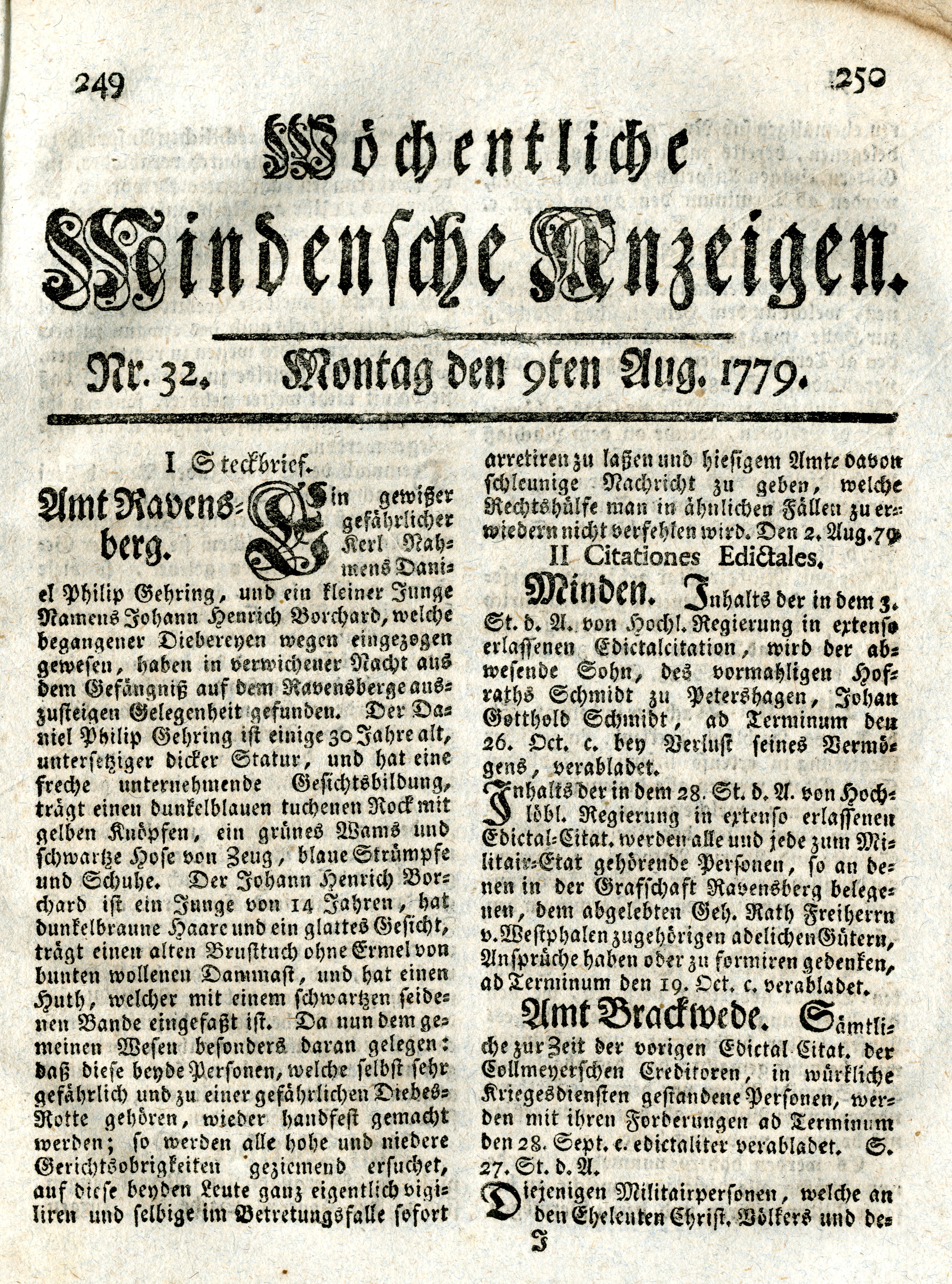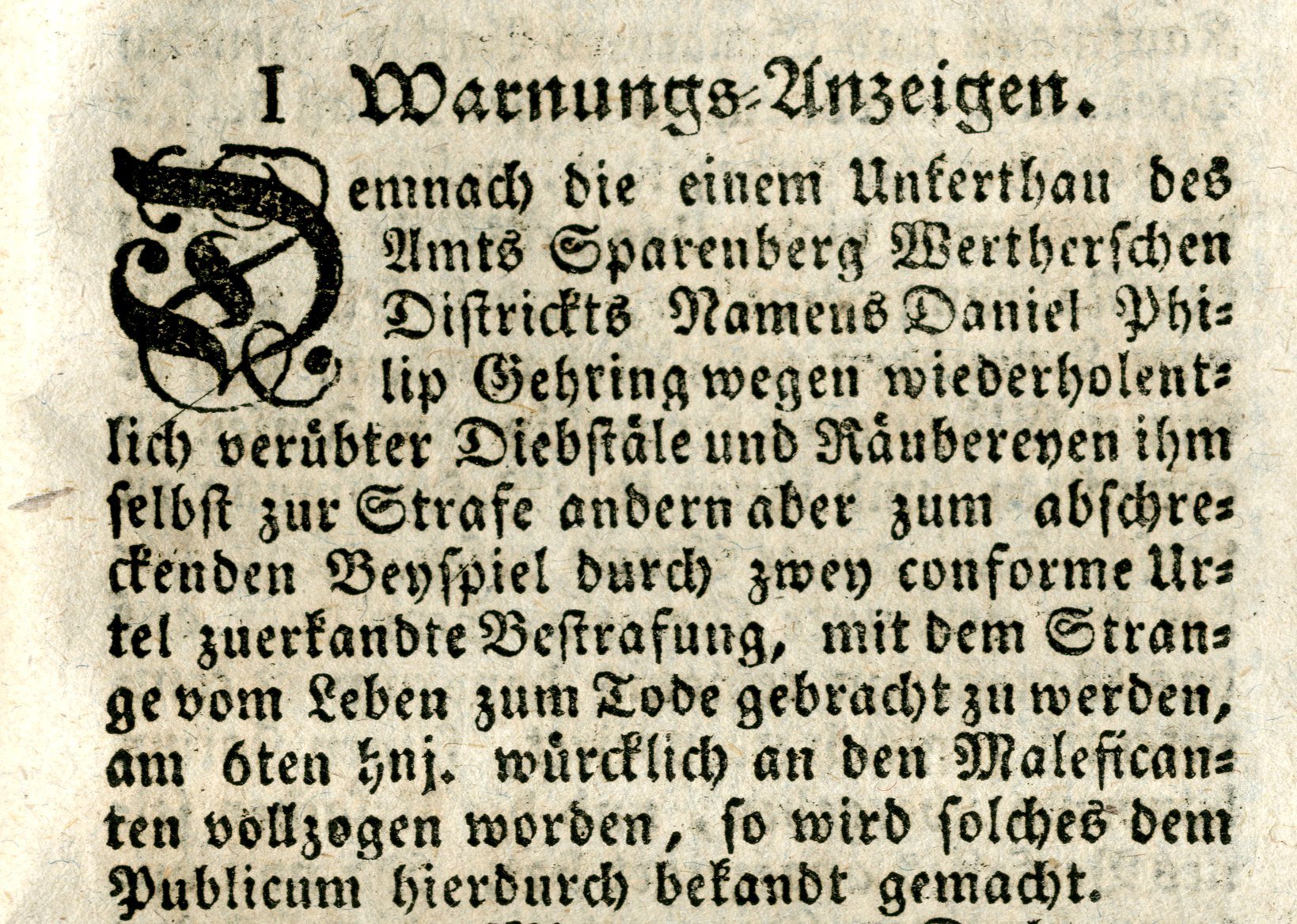 Der Gerichtshalter Johann Ernst Tiemann (1736-1799) setzte die – bereits vor Jahren verhängte – Hinrichtung Gerings auf den 6. Dezember 1782 an, traf hierfür detaillierte Absprachen mit dem Garnisonskommandeur Generalmajor Sylvius Ferdinand von Stwolinsky (1717-1787), der erst im Vorjahr Chef des Infanterieregiments Nr. 10 geworden war, das mit je 6 Kompanien in Bielefeld und Herford lag. 300 Mann sollten exakt 8.30 Uhr antreten und den Delinquenten von der Sparrenburg zur Galgenheide eskortieren – mit im Zug vier Prediger und ein Schülerchor. Was Tiemann jedoch nicht ahnen konnte, war die Empörung der Stadt Bielefeld über seine Vorbereitungen und vor allem die befürchteten Wirkungen. Der Magistrat hatte naturgemäß von der Ansetzung der Hinrichtung erfahren, aber auch vom geplanten Ablauf. Und hier entwickelte sich der eigentliche Streit, der aus heutiger Sicht seltsam erscheinen mag, aber einen typischen Diskurs reflektiert, der in der Frühen Neuzeit als Epoche zwischen Mittelalter und Moderne immer wieder stattfand. Tiemann beabsichtigte nämlich den zum Tode Verurteilten direkt von der Sparrenburg auf die Richtstätte zu führen. Dem widersprach die Stadt, die ein Privileg ins Feld führte, dem zufolge zusätzlich auf dem Rathaus das Todesurteil zu verlesen war. Der scharfe Protest des Magistrats an Tiemann blieb unbeantwortet, so dass er sich am 4. Dezember 1782 mit einer Beschwerde an das Obergericht zu Minden wandte und nicht nur auf das im Rathaus-Archiv aufbewahrte Privileg von 1647 rekurrierte, sondern sogar auf einen Druck eben dieses Dokuments in Ernst Albrecht Friedrich Culemanns „Ravensbergischen Merckwürdigkeiten“ von 1752. Darüber hinaus rekurrierte der Magistrat auf die anlässlich verschiedener Hinrichtungen vermeintlich geübte Praxis, so bei der „Justification“ des Asholzschen Diebesbande 1751, bei der Enthauptung Brüggehorsts im Amt Enger und der Hinrichtung Pierre Arcinées 1764.
