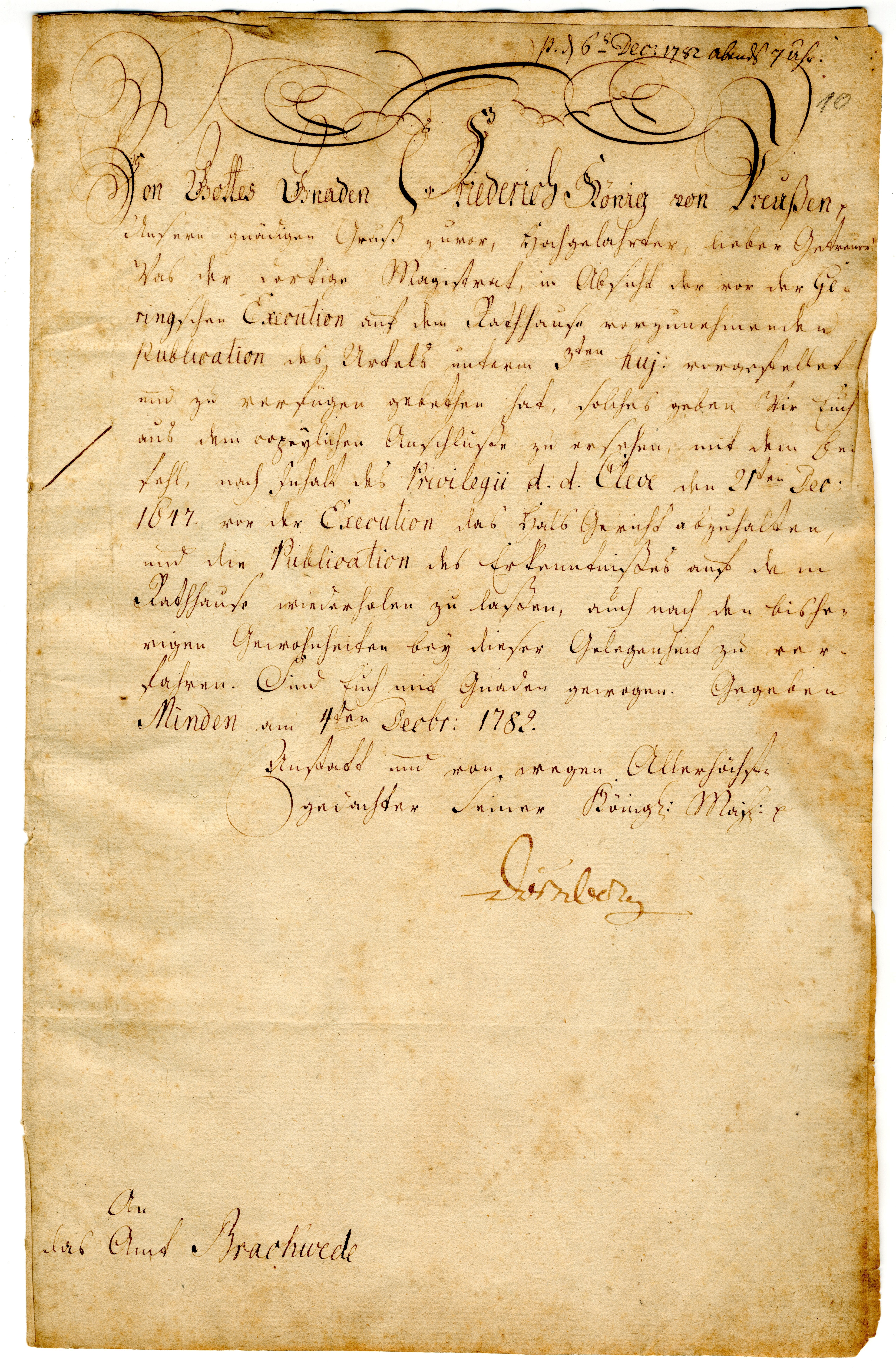 Die Beschwerde der Bielefelder war allerdings dennoch nicht so einfach von der Hand zu weisen. Zwar hatte Tiemann mehrfach bedeutet, dass ein derartiges Dokument in den Amtsregistraturen nicht feststellbar sei („das gerümte Privilegium, welches ich noch niemalen gelesen“), ja sogar ganz offensichtlich grundsätzliche Zweifel an dessen Existenz durchscheinen lassen. Allerdings handelte es sich bei dem vom Magistrat ins Feld geführten Dokument um die am 21. Dezember 1647 von Kurfürst Friedrich Wilhelm ausgestellte Privilegienbestätigung für die Stadt, der zufolge Delinquenten auf dem Rathaus tatsächlich das Todesurteil erneut zu verlesen war. Das zunächst einzige nachweisbare Verfahren, bei dem das Privileg zu Anwendung kann, hatten die Stadtoberen 1782 allerdings übersehen. Bei der Hinrichtung der Gebrüder Rennebaum 1727 auf der Schildescher Heide waren die Delinquenten, wie eine zeitgenössische Druckschrift festhielt, vom Sparenberg „auf das Bielefeldische Raht-Haus […] gefüret“ worden, „woselbst man, gewöhnlicher Massen, das peinliche Hals-Gericht spannete, und ihnen sämtliche die wider sie abgesprochene, und von Sr. Königl. Majest. Allerhöchst confirmirete Todes-Urthel publicirete“. Das unscheinbare „gewöhnlicher Massen“ belegt die offensichtlich regelmäßige Anwendung und hätte den Beschwerdeführern als schlagender und auch schnell greifbarer Nachweis dienen können.