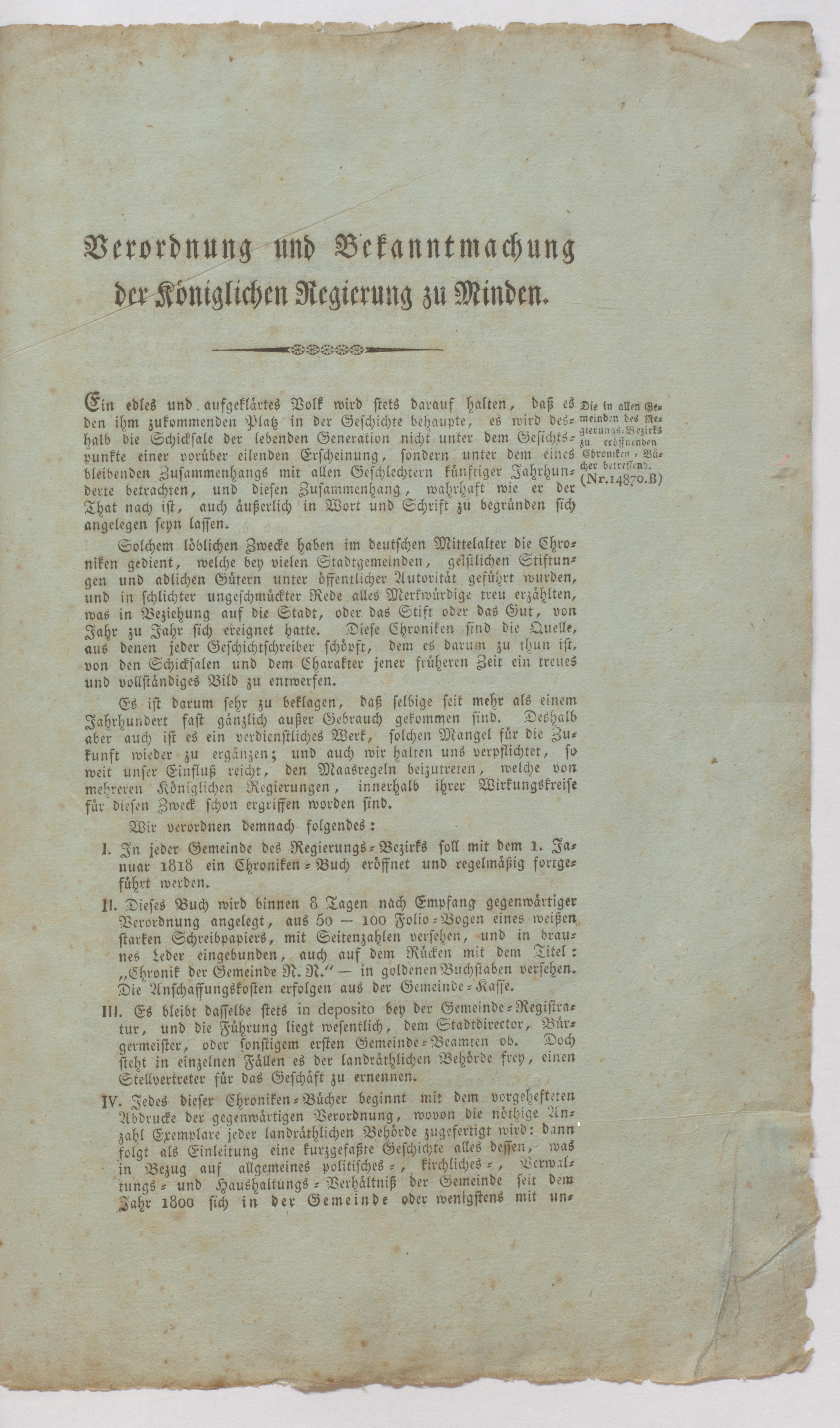 Das hatte den örtlichen Verwaltungschefs kurz vor Jahresende 1817 noch gefehlt: Eine Anweisung des Regierungspräsidenten in Minden, die innerhalb von acht Tagen umzusetzen war. Alle Städte und Ämter im Regierungsbezirk waren aufgefordert, in dieser kurzen Frist ein Chronikbuch zu beschaffen und ab dem 1. Januar 1818 jährlich mit Inhalten zu den örtlichen Verhältnissen zu füllen, dazu einen Vorspann der Ereignisse von 1800 bis 1817 inklusive Statistikteil zu liefern, der den erkennbar höchsten Rechercheaufwand erforderte. Mit verhaltenem Elan gingen die meisten Beamten deshalb an die neue Aufgabe und kein Verwaltungsleiter des Kreises Bielefeld sollte die engen Terminvorgaben erfüllen. Die Chroniken von Schildesche und Dornberg wurden 1826 gemeinsam eingereicht, Heepen und Jöllenbeck folgten jeweils separat gar erst 1842, Bielefeld legte, trotz mehrfacher Mahnungen, die den Bürgermeistern gelegentlich peinlich gewesen zu sein schienen, eine Chronik in der geforderten Form sogar niemals vor. Die regelmäßigen Aufforderungen waren, so Bürgermeister Ernst Friedrich Delius (1790-1831) 1829, „seit Jahr und Tag […] im höchsten Grade unangenehm und ein wahrer Schrecken“. Heinrich Mumperow (17??-1832), der zwischen 1813 und 1832 in Brackwede amtierte, wird als erster (und vielleicht sogar fristgerecht) eine ausgedehnte Chronik vorgelegt haben.