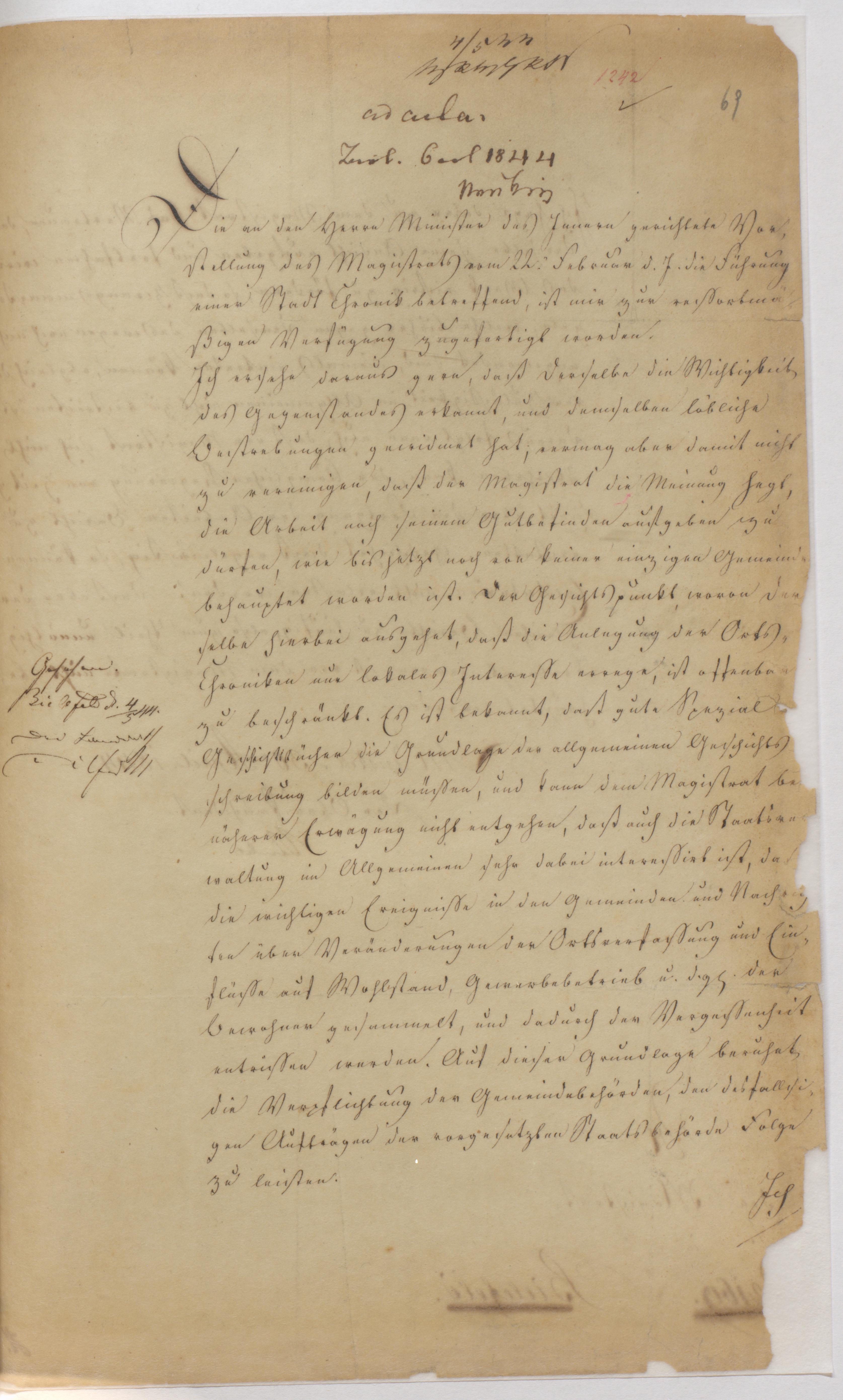 Immerhin hatten die Heeper überhaupt mit einer Chronik begonnen, während Bielefeld weiterhin inaktiv blieb. 1843 platzte angesichts der Bielefelder Ausflüchte zunächst dem Landrat der Kragen: Nach einer Auflistung früherer Anweisungen lehnte der Landrat einen mit „Entschuldigungen so allgemeiner Natur“ begründeten Antrag auf Fristverlängerung ab und forderte eine Erklärung, was der Magistrat in den vergangenen zwei Jahre unternommen habe und „wann und auf welche Weise derselbe gedenkt, die städtische Chronik fertig zu bringen“. Den ständigen Zusicherungen geleisteter Vorarbeiten misstraute er ganz offensichtlich, da er auch verlangte, diese vorbereitenden Sammlungen einzureichen. Überraschenderweise legte der Magistrat tatsächlich Materialien vor, die den Landrat für den Moment beruhigten. Als Bürgermeister Friedrich Körner und der Magistratsvorsitzende Kreisrichter Ignatz Neukirch jedoch eine erneute Aufforderung mit dem Hinweis an den Innenminister konterten, dass an der Chronik allenfalls ein lokales Interesse bestünde und dauernde Erinnerungen der Aufsichtsbehörden unnötig seien, ja sogar eine gesetzliche Verpflichtung zur Chronikführung in Frage stellten, hatten sie sich mit dem Falschen angelegt. Oberpräsident Ludwig Freiherr von Vincke (1874-1844) machte die Angelegenheit noch in seinem letzten Dienst- und Lebensjahr zur Chefsache und belehrte die Bielefelder am 30. April 1844 über den allgemeinen Wert der Chroniken für das Staatswesen und drohte „Zwangsmaaßregeln“ an. Unerhört fand er geradezu, dass der Magistrat „die Meinung hegt, die Arbeit nach seinem Gutbefinden aufgeben zu dürfen, wie bis jetzt noch von keiner einzigen Gemeinde behauptet worden ist“. Diese scharfe Zurechtweisung verpuffte indes ebenso folgenlos wie die weiteren Erinnerungen bis 1847. Bielefeld blieb ohne Chronik und war bald stärker mit der 1848´er Revolution beschäftigt als über eben jene Ereignisse Zeugnis abzulegen, wofür gerade die Chronik der geeignete Ort gewesen wäre.
