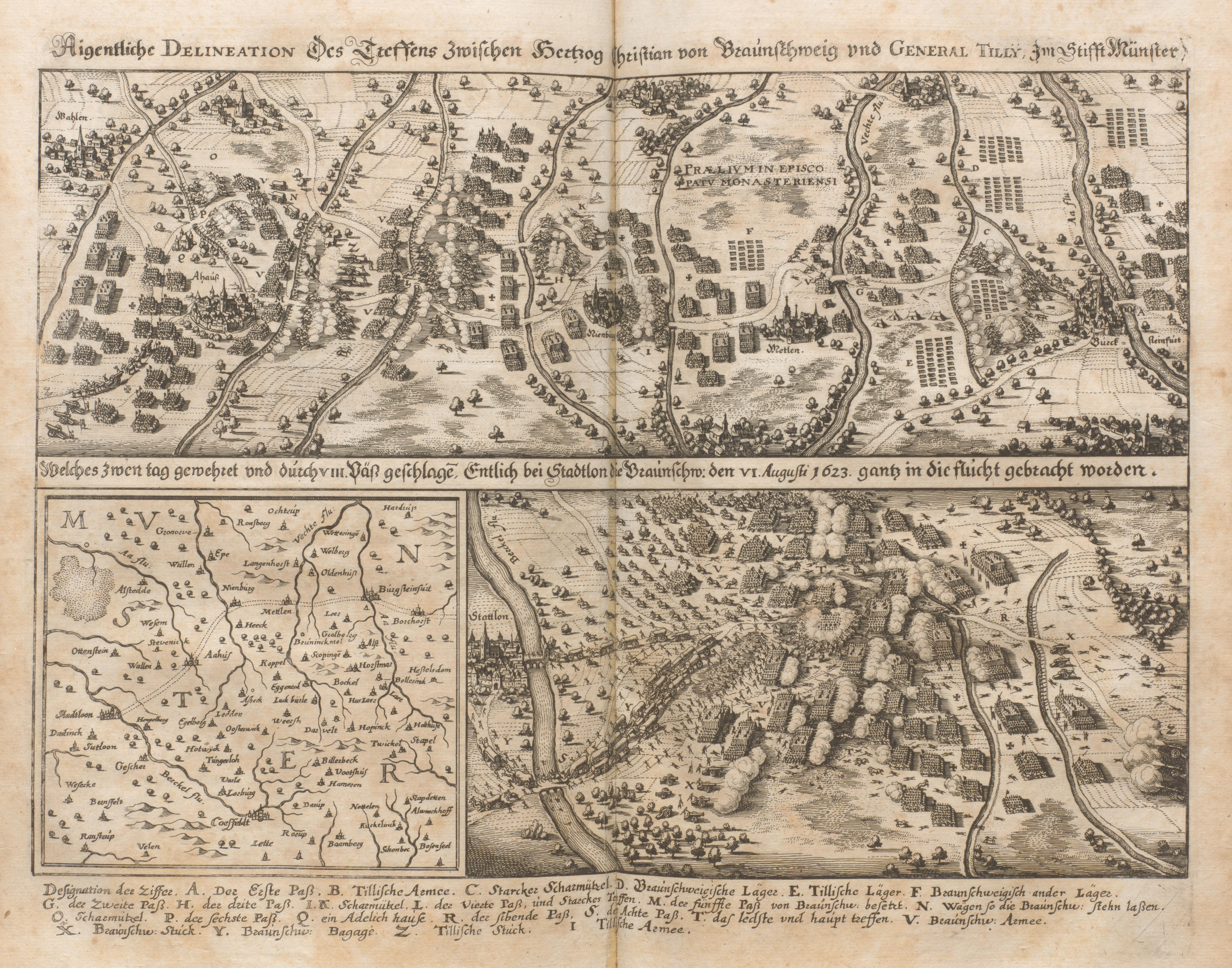 Anfang 1623 fanden die ersten größeren Truppendurchzüge in Ravensberg statt. Der „Tolle“ Christian (II.) von Braunschweig-Wolfenbüttel (1599-1626), der seinen Beinamen nicht aus ehrlicher Bewunderung heraus erhielt, sondern wohl aus einer Mischung zugeschriebener Wildheit und Tollkühnheit, erschien auf seinem Weg in die Niederlande mit einem protestantischen Heer bei Vlotho und erhob massive Kontributionen von den Ämtern und Städten, darunter Bielefeld. Ergänzt wurden diese Geldzahlungen bis in den Sommer hinein durch Plünderungen von Feldern und Vieh. Vor dem heranrückenden Liga-Generalissimus Johann T’Serclaes von Tilly (1559-1632) wich Christian wie geplant Richtung Niederlande aus, wurde aber kurz vor der Grenze bei Stadtlohn mit 15.000 Mann von der stärkeren Armee Tillys gestellt und, trotz strategisch günstiger Position, am 6. August 1623 vernichtend geschlagen. Tillys Truppen hatten zuvor die Grafschaft Ravensberg kaum besser behandelt.