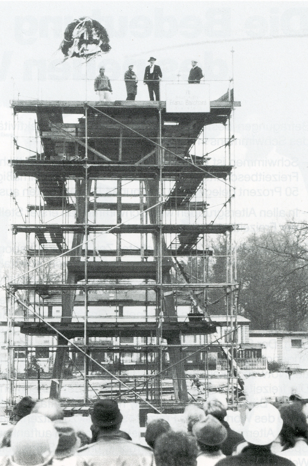 Das Richtfest wurde am 17. Dezember 1987 gefeiert, auch wenn es kein klassisches Dach für eine Richtkrone gab. Das Fest diente als Dank und als Anerkennung für den überdurchschnittlichen Einsatz der Bauarbeiter, die „bei jedem ‚Hundewetter‘ voll dabei“ waren. Der Richtkranz wurde auf der Plattform des 10-Meter-Sprungturms errichtet. Die CDU-Ratsfraktion blieb dem Fest fern, sie hielten das „Millionengrab Wiesenbad […] aus wirtschaftlichen und sportlichen Erwägungen für unerträglich“. Die CDU befürwortete sogar im Nachhinein noch die Privatisierung des Bades, auch wenn das vielleicht zu einem „Freizeitbad für Reiche“ und zum Verlust von Arbeitsplätzen bei der Stadt geführt hätte.