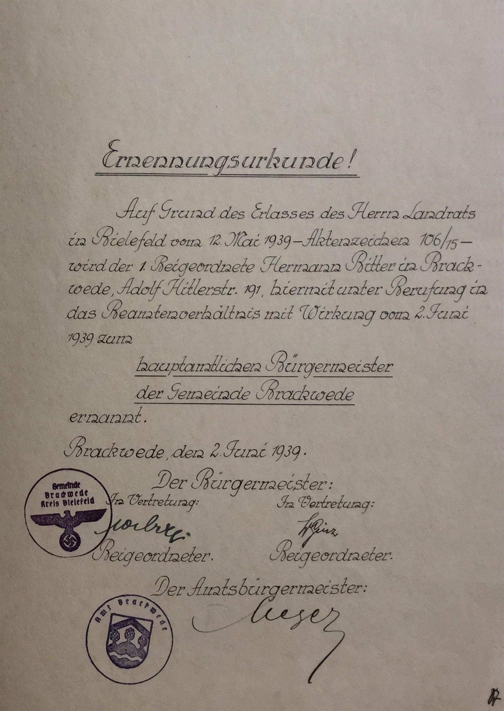 Nach verändertem Recht wurde 1934 die Amtsbezeichnung „Gemeindevorsteher” in „Gemeindeschulze” umbenannt und die bisher ehrenamtliche Tätigkeit in eine besoldete geändert. Die NSDAP beantragte im November 1934, Hermann Bitter zum hauptamtlichen 1. Amtsbeigeordneten und ein Jahr später zum hauptamtlichen 1. Gemeindebeigeordneten von Brackwede zu ernennen. Dieses Amt hatte es vorher nicht gegeben, die damit verbundenen Aufgaben mussten also erst im Stellenplan neu ausgewiesen werden. Auf Vorschlag des Bielefelder NSDAP-Kreisleiters Gustav Reineking (1900-1945) berief der Regierungspräsident Bitter im Juni 1939 zum hauptamtlichen Gemeindebürgermeister von Brackwede. Nach der Deutschen Gemeindeordnung vom 30. Januar 1935 wurde das Amt des Bürgermeisters nicht mehr von den Mitgliedern der Gemeindeversammlung frei gewählt, sondern auf Vorschlag des Beauftragten der NSDAP von der Aufsichtsbehörde berufen. Das gleiche traf auch im Dezember 1940 zu, als der amtierende Bürgermeister des Amtes Brackwede Richard Meyer zur Wehrmacht eingezogen wurde und Bitter nun auch dieses Amt bekleidete.