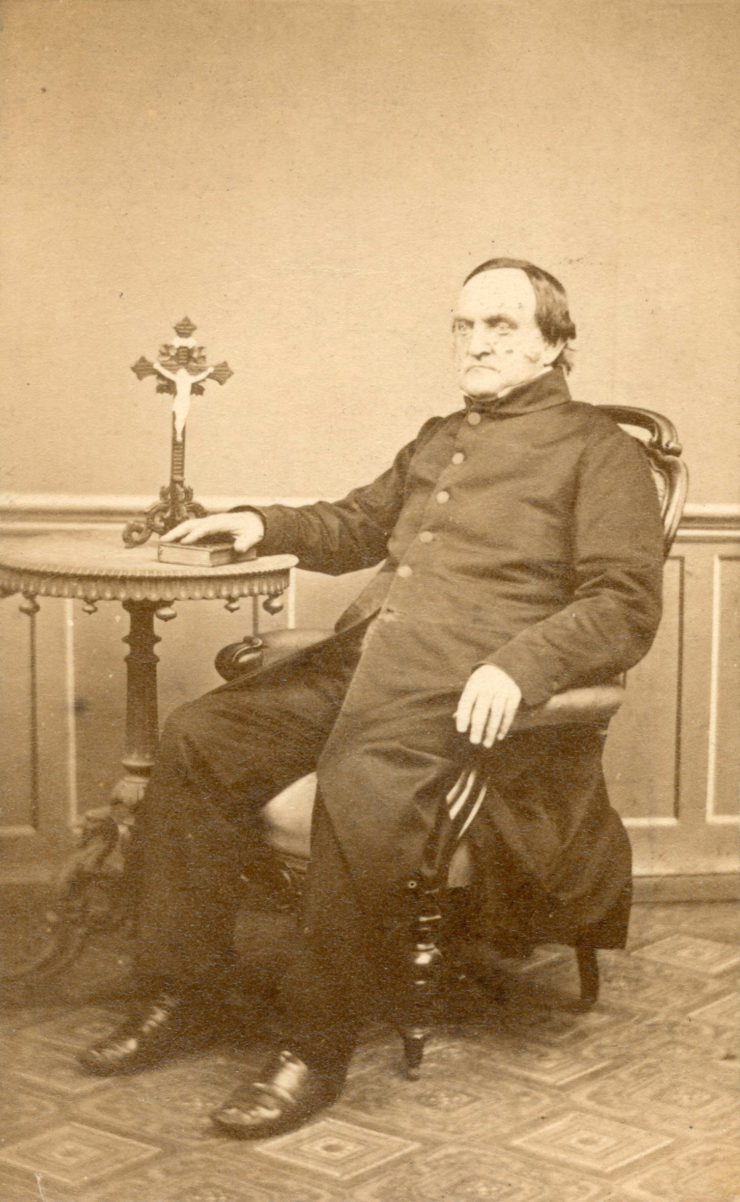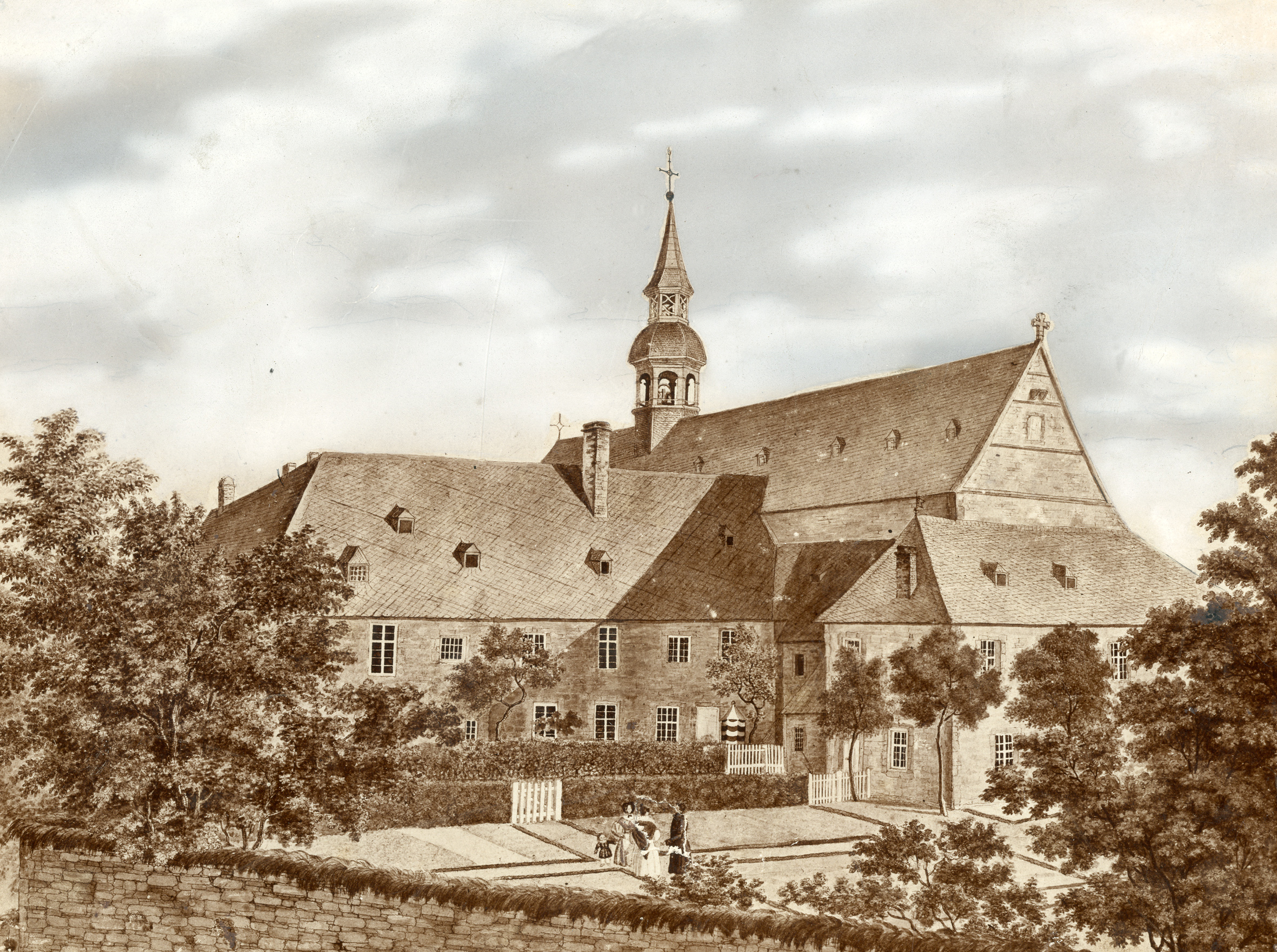 Im Herbst 1868 hatten sich Pfarrer Johann Casper Heinrich Plantholt (1802-1871) und ein Komitee von St. Jodokus an die Vorsteherin der Ordensgemeinschaft der „Armen-Schwestern vom heiligen Franziskus“, Franziska Schervier, gewandt und um Unterstützung gebeten. Franziska Schervier (1819-1876), Tochter eines Aachener Nadelfabrikanten, hatte sich schon in jungen Jahren innerhalb ihrer Kirchengemeinde engagiert: Sie half Arbeiterfamilien, unterstützte den Betrieb von Suppenküchen und pflegte Cholera- und Pockenkranke. 1844 trat sie dem „3. Orden des heiligen Franziskus“ bei und bereitete die Gründung einer eigenen Ordensgemeinschaft vor. Dem Beispiel des Heiligen Franziskus folgend, wollte sie ihr Engagement ausschließlich armen, am Rande der Gesellschaft stehenden Menschen zugutekommen lassen und forderte gleichsam von den Mitgliedern ihrer Gemeinschaft, nur mit dem Notwendigsten, in Armut zu leben. Dieser Anspruch schlug sich 1849 auch in der Namensgebung der Ordensgemeinschaft nieder: „Arme-Schwestern vom heiligen Franziskus“. Die Ordensschwestern engagierten sich nicht nur in der Armenkrankenpflege, sondern sie leisteten auch Gefangenen und Prostituierten Hilfe.