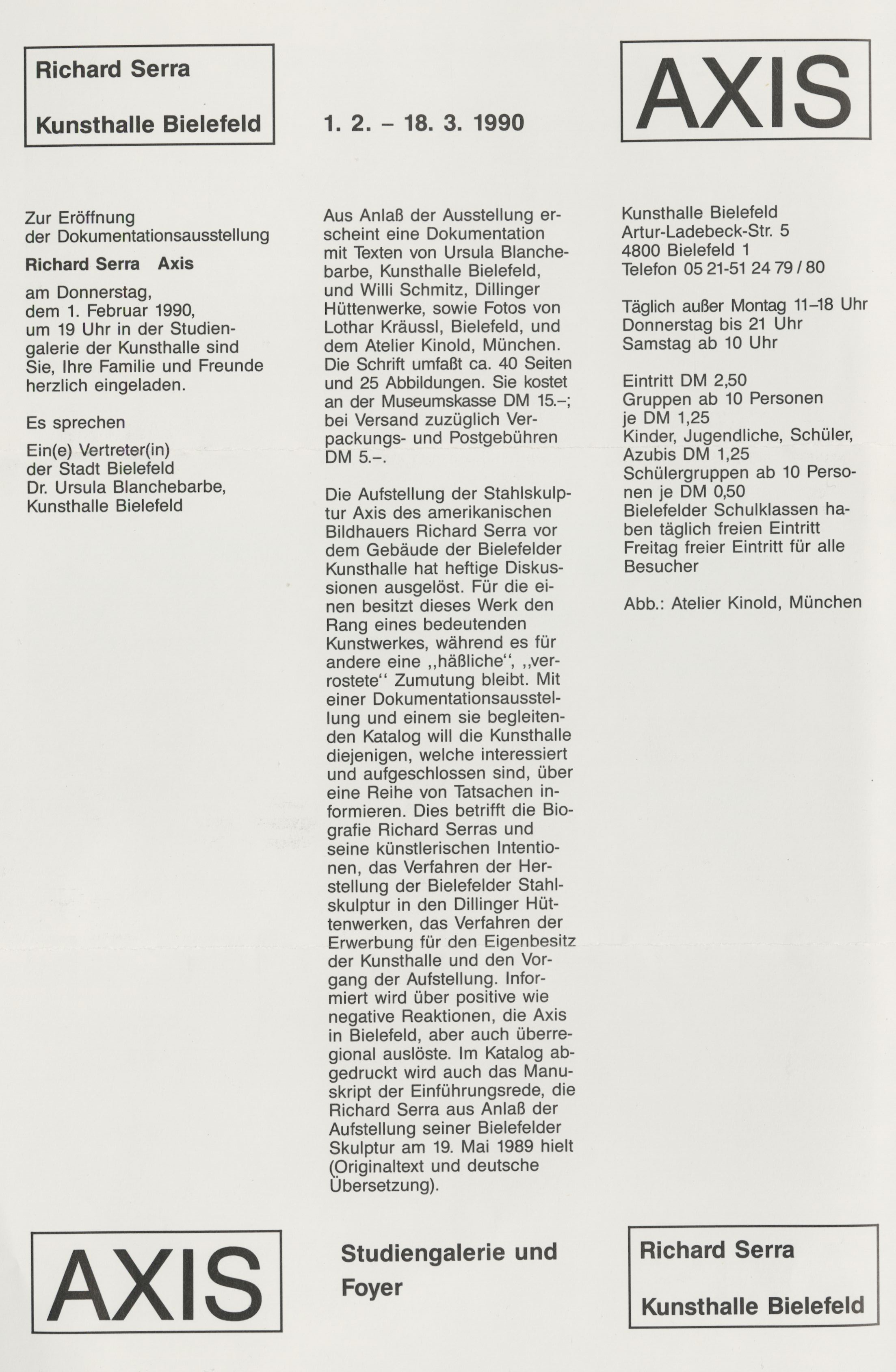 Über die Dokumentationsausstellung „Axis“, die vom 1. Februar bis 18. März 1990 in einem kleinen Teil der Kunsthalle — der Studiengalerie und dem Foyer — gezeigt worden ist, erfahren wir aus den Quellen nicht viel. An schriftlicher Überlieferung sind neben dem Programm und dem Ausstellungskatalog nur einzelne organisatorische Briefe erhalten geblieben. Üblicherweise zogen diese „kleinen Präsentationen“ eher wenig Publikum an, wie wir in einem Schreiben von Kunsthallenmitarbeiterin und Kunsthistorikerin Dr. Ursula Blanchebarbe an die Dillinger Hüttenwerke erfahren. Doch bei der Dokumentationsausstellung „Axis“ war Blanchebarbe hingegen zufrieden mit der Resonanz: Die Besucherreaktionen waren erstaunlich positiv, das Haus voll, und „vielleicht haben wir den einen oder anderen Bielefelder sogar zum Serra-Fan werden lassen“.