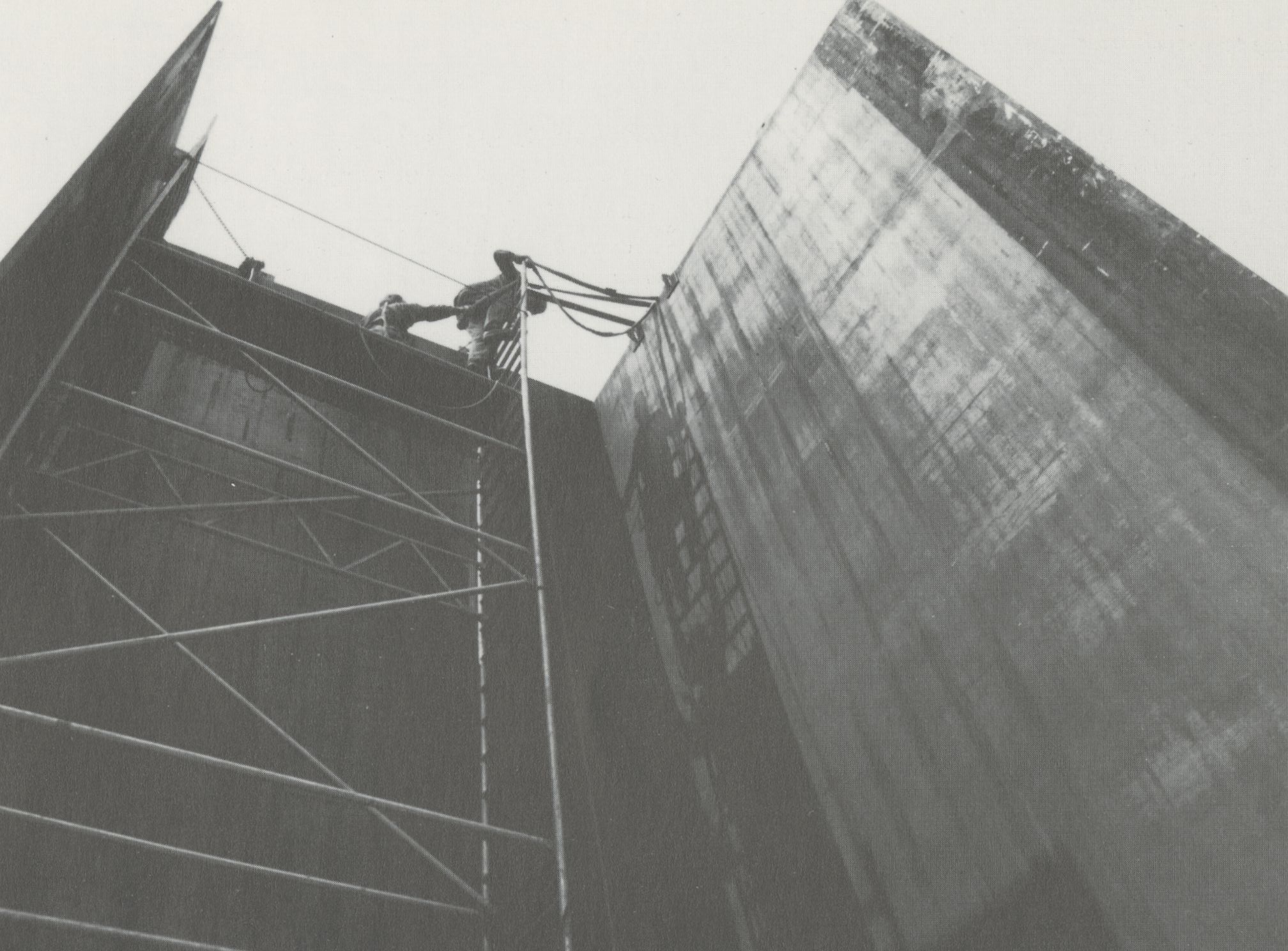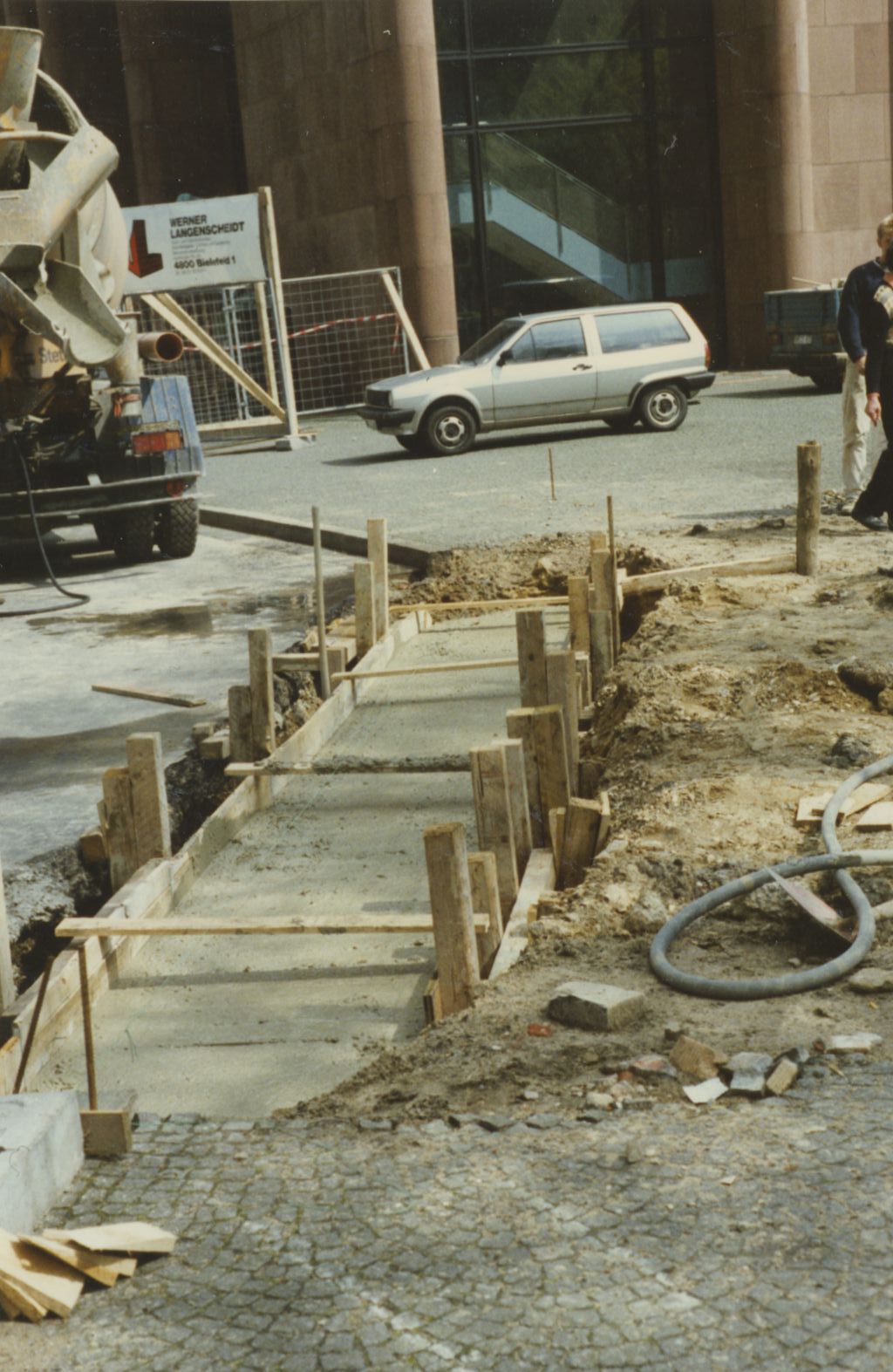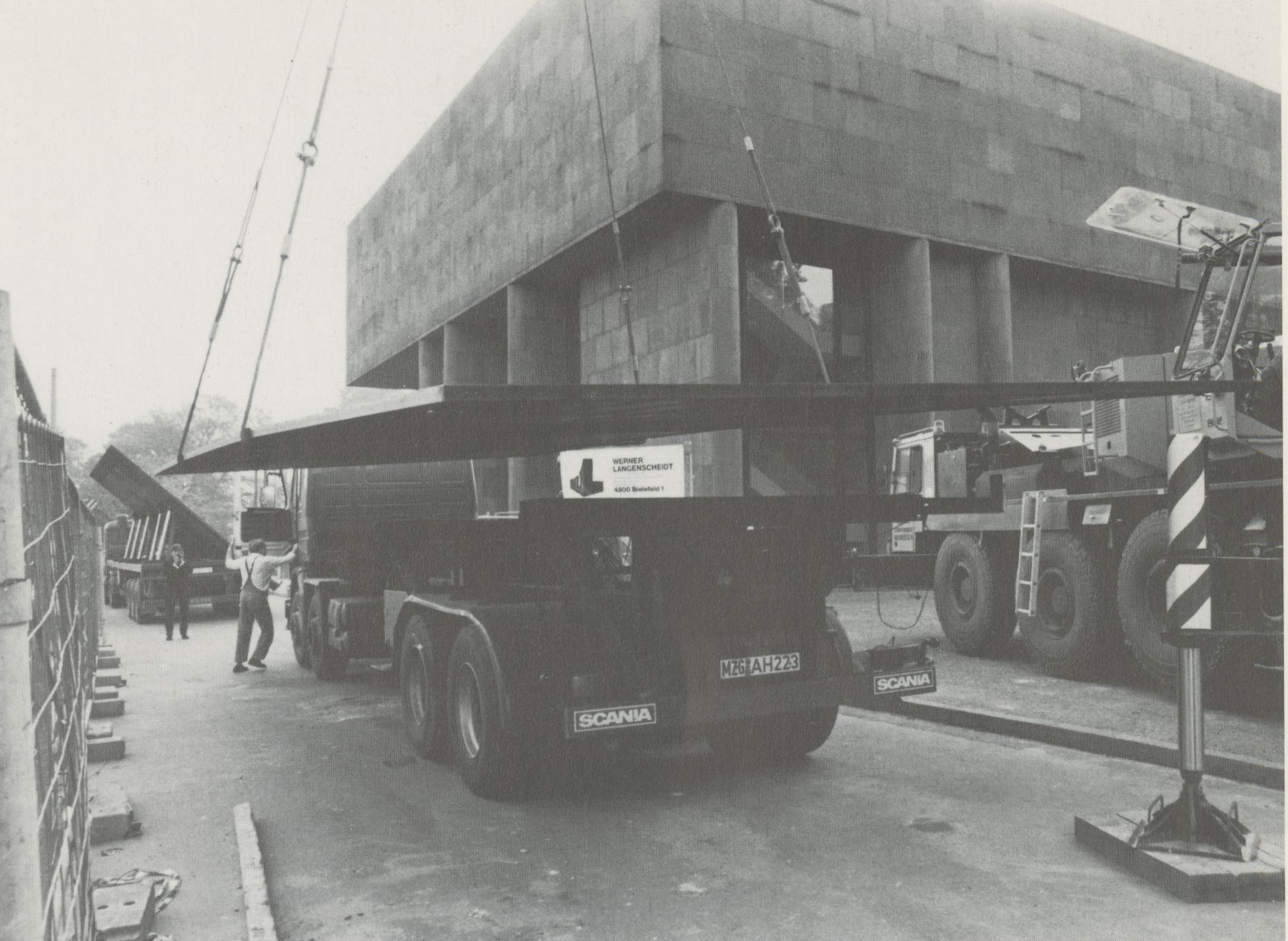 Aus dem Saarland kamen die drei Stahlplatten auf je einem Schwertransporter nachts um 2:30 Uhr am Aufstellungstag, dem 19. Mai 1989, an. Um 6 Uhr in der Frühe begann der Aufbau. Um die schweren Platten auf den Millimeter genau in Position zu bringen, bedurfte es nicht nur eines Teleskop-Krans, sondern vielmehr einer gründlichen Vorplanung und genauer Skizzen. Die Vorplanung und Aufstellung der Skulptur wurden von Ernst Fuchs, einem Bauingenieur aus Bochum sowie seiner Firma Skulpturenaufbau GmbH vorgenommen. Fuchs war ein „alter Hase“ für die Realisierung von Serras Kunstwerken — er hatte zuvor bereits über 120 davon in ganz Europa installiert. Auch die drei Stahlschlosser, die er mitgebracht hatte, waren routiniert im Aufbau von Kunstwerken und gewöhnt an eine große Zuschauermenge, die gespannt jeden Handgriff beobachtet. Nach Vorarbeiten war die erste der drei Platten gegen halb neun Uhr morgens aufgerichtet und konnte an die Stahlplatten des Betonfundaments angeschweißt werden. Dazu hielt ein Kran die Platte solange, bis sie mit zwei Stahlseilen festgespannt werden konnte. Nunmehr war der Kran frei, um die zweite Platte vom Lastwagen zu heben und in eine rechtwinklige Position zur ersten Platte zu bringen, sodass beide punktuell miteinander verschweißt werden konnten: Das Kunstwerk nahm erste Formen an.