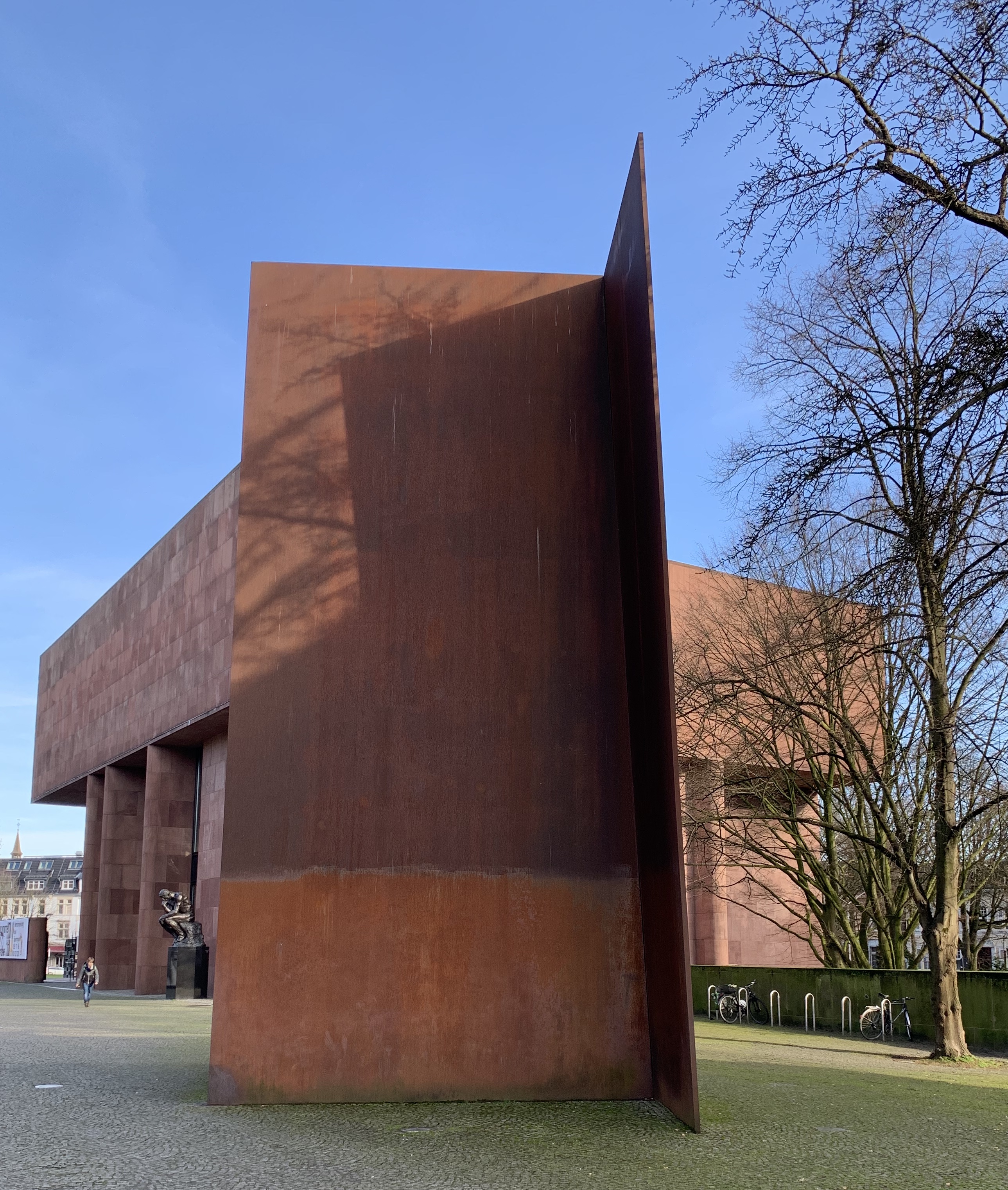 Vor der Kunsthalle in Bielefeld, direkt an der breiten Artur-Ladebeck-Straße gelegen, befindet sich eine auffällige und auffallend rostige Skulptur. Auch dem Laien ist beim Vorbeischlendern sofort bewusst, dass es sich hierbei um Kunst im öffentlichen Raum handelt. Und wie stets in derartigen Fällen, war (und ist) auch dieses Kunstwerk umstritten. Es handelt sich um die Skulptur „Axis“ des amerikanischen Bildhauers Richard Serra (*1939).