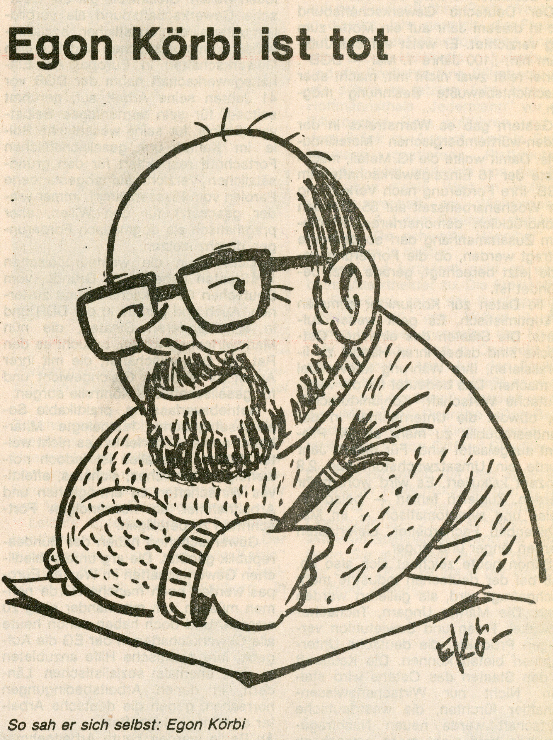 Nachrufe auf den Titelseiten der Tageszeitungen sind in der Regel nur der Prominenz aus Politik und Showbusiness vorbehalten. Am 1. Mai 1990 teilte der Chefredakteur der Neuen Westfälischen, Tim Arnold, auf der ersten Mantelseite mit, dass der langjährige und über die Stadtgrenzen hinaus bekannte NW-Karikaturist Egon Körbi am 30. April gestorben war. Zu dem Aufmacher gehörte an diesem Tag auch eine Karikatur von Körbi, wie er sich sah. In Bielefeld und in der Region war er vielen unter seinem Signum „ekö“ bekannt.