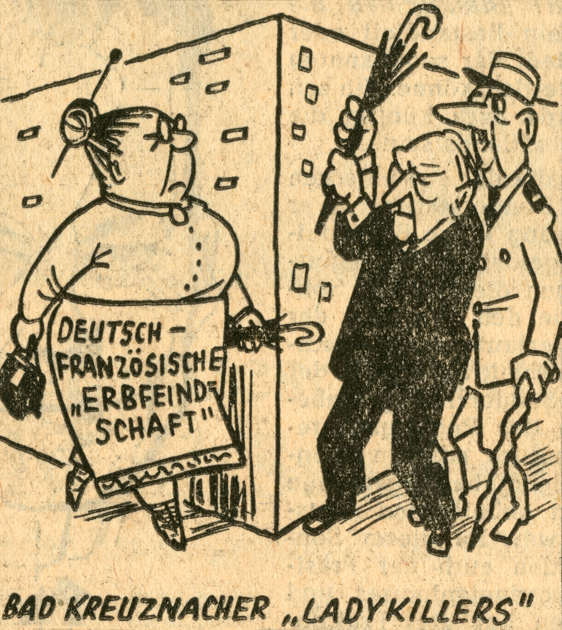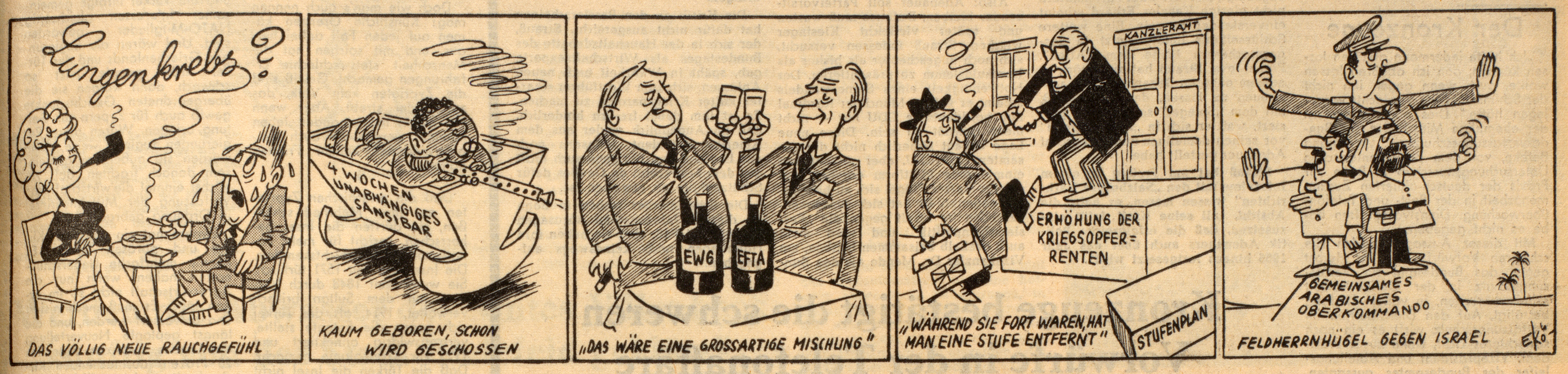 Seine zweite Karikatur war am 21. Mai 1949 bereits auf der Titelseite der Freien Presse zu sehen. Diesmal illustrierte er einen Artikel über undemokratischen „Wahlzwang“ in der SBZ, der Sowjetischen Besatzungszone. Die deutsche Teilung sollte sich bis zum „Mauerfall“ 1989 wie ein roter Faden durch seine Arbeit ziehen. Darüber wird noch zu berichten sein. In den 1950er Jahren illustrierte er Bücher, zeichnete für Gewerkschaftszeitungen, den „Demokratischen Aufbruch“ der SPD und steuerte 1962 auch eine ganze Serie von Karikaturen zum Landtagswahlkampf der Sozialdemokraten in Nordrhein-Westfalen bei. Körbi war in seinen politischen Arbeiten sicher parteiisch, spitzte zu, was auch seine Aufgabe als Karikaturist war. Die Regierung des von 1958 bis 1966 amtierenden Ministerpräsident von Nordrhein-Westfalen, Franz Meyers (CDU), wurde von Körbi genauso aufs Korn genommen wie der Bundekanzler. So zeichnete nicht nur Körbi Konrad Adenauer (1878-1967) erkennbar als „den Alten“, womit der Karikaturist auch das Gestrige meinte, was der Popularität des ersten Bundeskanzlers aber nicht schadete. Im Gegenteil: Mit seinem Wahlslogan „Keine Experimente“ gewann die CDU bei der Bundestagswahl 1957 die absolute Mehrheit.