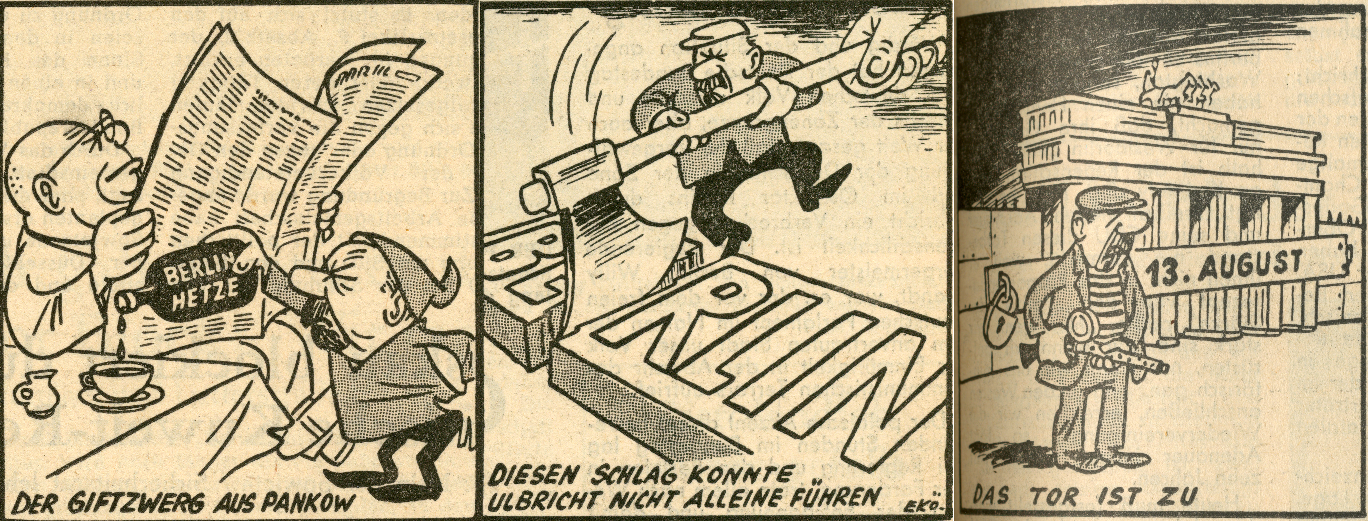 Zu einem Thema könnte ein ganzes Buch mit Körbis Karikaturen gefüllt werden: die deutsche Teilung von 1949 bis 1989/90. Körbis Karikaturen spiegelten den Zeitgeist über 40 Jahre deutsch-deutsche Geschichte wider: Der Kalte Krieg, das Trauma des Mauerbaus vom 13. August 1961, die viel zu vielen Toten an der innerdeutschen Grenze, aber auch die Hoffnung, die mit der sozialliberalen Ostpolitik verbunden wurden. Wiederkehrende Themen waren die Wahlen vom „Wahlzwang“ 1949 bis zu den vorhersehbaren Wahlen in der Ära Honecker in den 1980er Jahren, bei denen das Überraschende nur noch die Zahlen hinter dem Komma waren. Den Schwerpunkt eines Körbi-Buches zur deutsch-deutschen Geschichte würden aber sicher der Bau der Mauer 1961 und der Fall derselben 1989 bilden. Schon in den 1950er Jahren hatte sich Körbi der Figur Walter Ulbrichts (1893-1973) bedient, der von 1949 bis 1971 Staatsratsvorsitzender der DDR war. Wohl kein anderer ostdeutscher Politiker wurde mehr verachtet, mit Hohn und Spott überschüttet, ja, auch gehasst wie Walter Ulbricht. Im August 1961 karikierte ihn Körbi als einen Verbrecher im gestreiften T-Shirt, der mit einem Maschinengewehr, einer Kalaschnikow, vor dem Brandenburger Tor steht. Diese Überspitzung der Realität, die eine Karikatur sein soll, fand mit Sicherheit ungeteilten Beifall. Vorher zeigten Karikaturen ihn als „Giftzwerg aus Pankow“, der seinem Meister, Nikita Chruschtschow (1894-1971), mit „Berlin Hetze“ versorgt. Und schließlich brachte Körbi die Überzeugung aller Menschen auf den Punkt, dass Ulbricht den Mauerbau, die Teilung Berlins, nicht allein ausführte, sondern der willige Helfer sowjetischer Politik war.