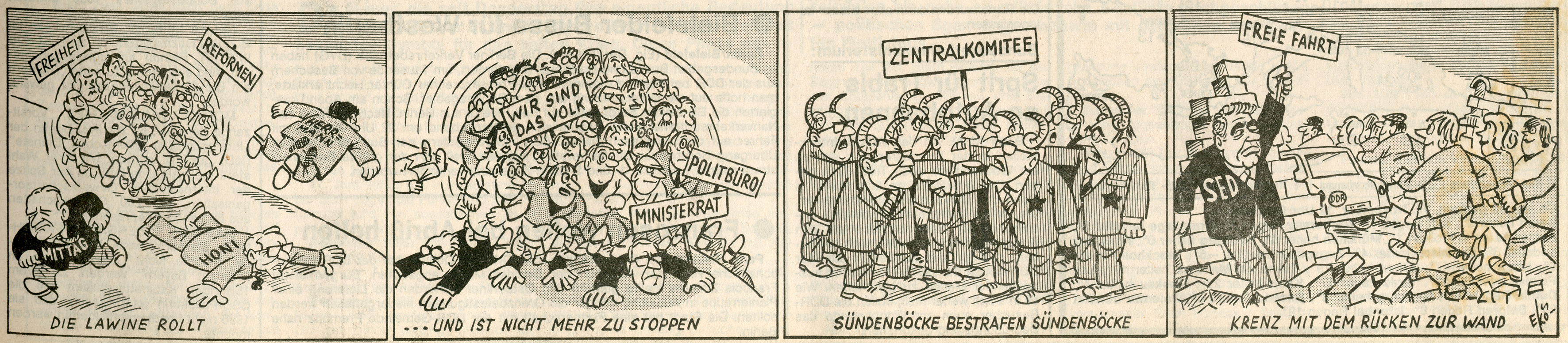 Der Fall der Berliner Mauer war im Sommer 1989 zwar noch nicht absehbar, Körbi nahm aber sehr sensibel die Veränderungen im „Ostblock“ war. Im Juli 1989 zeichnete er die KPdSU als einen Augiasstall, den Michail Gorbatschow (geb. 1931) mit der Politik der Perestroika auszumisten versucht. Für den Karikaturisten eine nur schwer zu erfüllende Aufgabe. Wenige Wochen später beschreibt eine Karikatur die Öffnung der ungarischen Grenze als ein „Sommerloch“ im Eisernen Vorhang. Im September zeichnet Körbi die Opposition in der DDR als einen Baum, der zwar von Erich Honecker (1912-1994) gefällt wird, aus dem aber immer neue Triebe wie das „Neue Forum“ sprießen. Nach Honeckers Rücktritt versprach am 4. November sein Nachfolger Egon Krenz (geb. 1937) den DDR-Bürgern, „unter bewährter Lenkung der Partei“ einen Kurswechsel des real existierenden Sozialismus. Dieser wird von Körbi als schrottreifer LKW gezeichnet, der an einem Abhang steht. Als am 9. November die Mauer geöffnet wurde, die ersten „Mauerspechte“ auf der Westseite mit Hammer und Meißel den Soundtrack zum Mauerfall lieferten, zeichnete Körbi die Bürgerbewegung als eine Lawine, die nicht mehr aufgehalten werden konnte. Das „System“ stand für den Karikaturisten mit dem Rücken zur Wand und konnte den Lauf der Geschichte nicht mehr mitbestimmen.