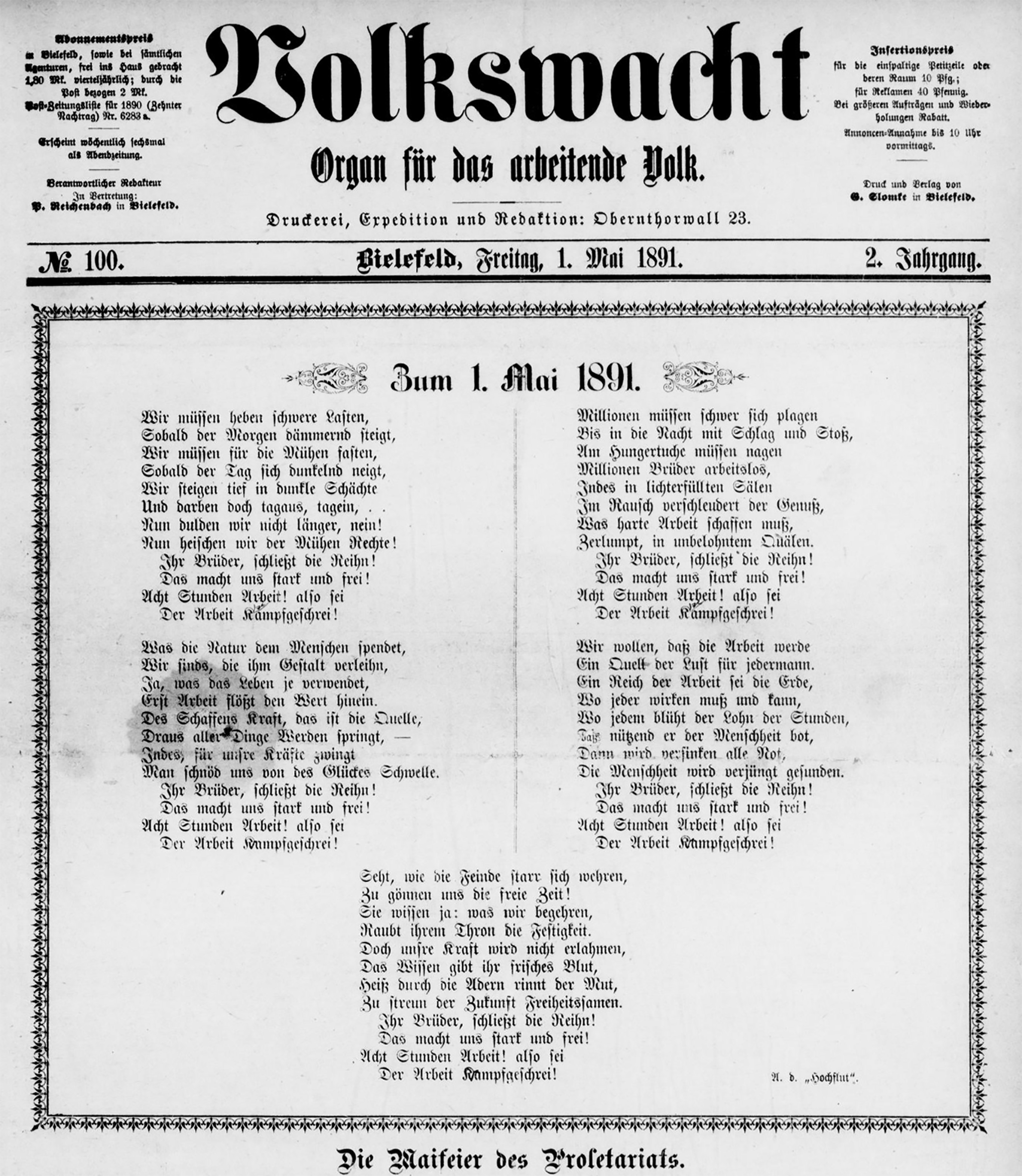 „Der 1. Mai [1890] ist hier in der Arbeiterbewegung vollkommen und ohne jede Störung verlaufen und, wenn nicht zufällig die Tischlergesellen an diesem Tag hier in den Strike eingetreten wären, so würde man Arbeiter, die feiern, gar nicht wahrgenommen haben.“ Die liberale Tageszeitung „Der Wächter“ berichtete ein wenig erleichtert über die Maifeiern in Bielefeld, die im Vorfeld im gesamten Reich für Nervosität gesorgt hatten. Denn im Juli 1889 wurde auf dem Internationalen Arbeiterkongress in Paris eine Resolution beschlossen, den 1. Mai zum „Feiertag der Arbeiter“ zu erklären, und mit der Forderung für die Einführung eines Achtstundentages verbunden. Als dann auch die Sozialdemokraten bei den Reichstagswahlen im Februar 1890 trotz des noch bestehenden Sozialistengesetzes einen großen Erfolg verbuchten, wurden die örtlichen militärischen Befehlshaber vom Kriegsministerium aufgefordert, sozialdemokratische Agitation intensiv zu überwachen und potentielle Rädelsführer vor Kriegsgerichte zu stellen. Durch „genügende Kraftentfaltung“ sollte „jeder Aufruhr im Keime erstickt“ werden, hieß es in einem Erlass.
