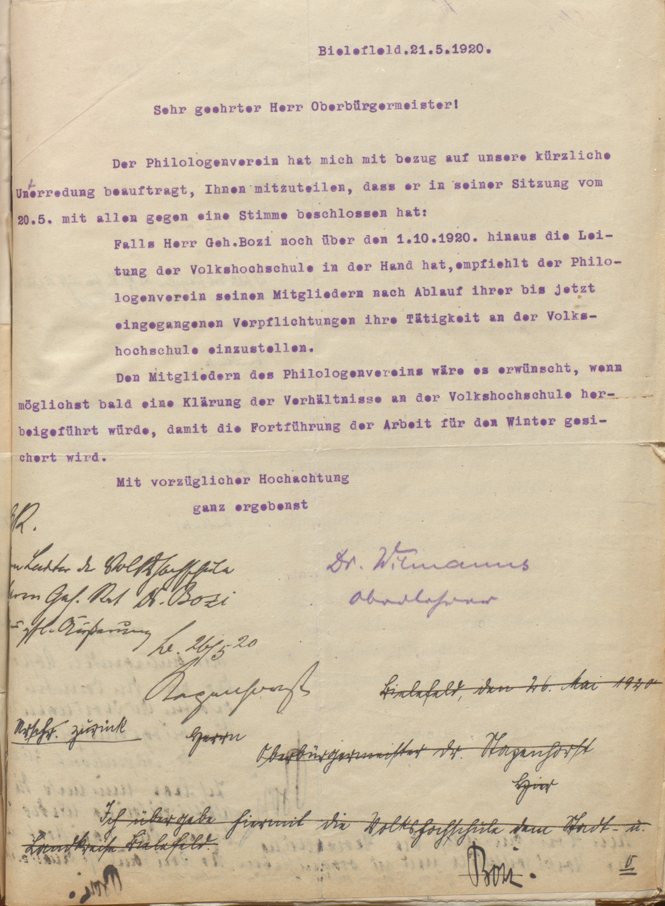 Wenige Wochen vor der Gründungsversammlung eskalierten seit längerem anhaltende Konflikte zwischen Bozi und dem von Oberlehrer Dr. Ernst Wilmanns geleiteten Philologenverein. Am 20. Mai 1920 beschloss eine Vereinsversammlung bei einer Gegenstimme, seinen Mitgliedern die Einstellung der Dozententätigkeit an der Volkshochschule zu empfehlen, falls Bozi weiterhin Leiter bliebe. Offensichtlich wollte der Verein bzw. dessen Vorstand die Einrichtung ebenfalls in die Stadtverwaltung überführen, danach aber die inhaltliche Leitung übernehmen: „Gleichzeitig sollte damit den Parteien ausschlaggebender Einfluss gesichert werden. Das aber war gerade, was ich nicht wollte. Nach meiner Einstellung musste die Volkshochschule parteipolitisch unabhängig sein. Andererseits wollte ich nicht der öffentlichen Meinung entgegentreten“, so Bozi 1937. Auf sich allein gestellt resignierte der düpierte Bozi: Am 26. Mai 1920 teilte er – offensichtlich zerknirscht – auf dem vom Oberbürgermeister urschriftlich zugeleiteten Vereins-Ultimatum mit: „Ich übergebe hiermit die Volkshochschule dem Stadt- u. Landkreise Bielefeld“. Das konnte Bozi freilich so nicht, weshalb die Passage gestrichen ist. Gleichzeitig holte er Stellungnahmen verschiedener Dozentinnen und Dozenten ein, die fast alle seine Person, aber nicht seinen Organisationsvorschlag unterstützten. Morisse, Bavink und weitere Dozenten empfahlen der Stadt eine Überleitung der VHS an die Stadt unter Bildung eines Kuratoriums mit Dozenten.