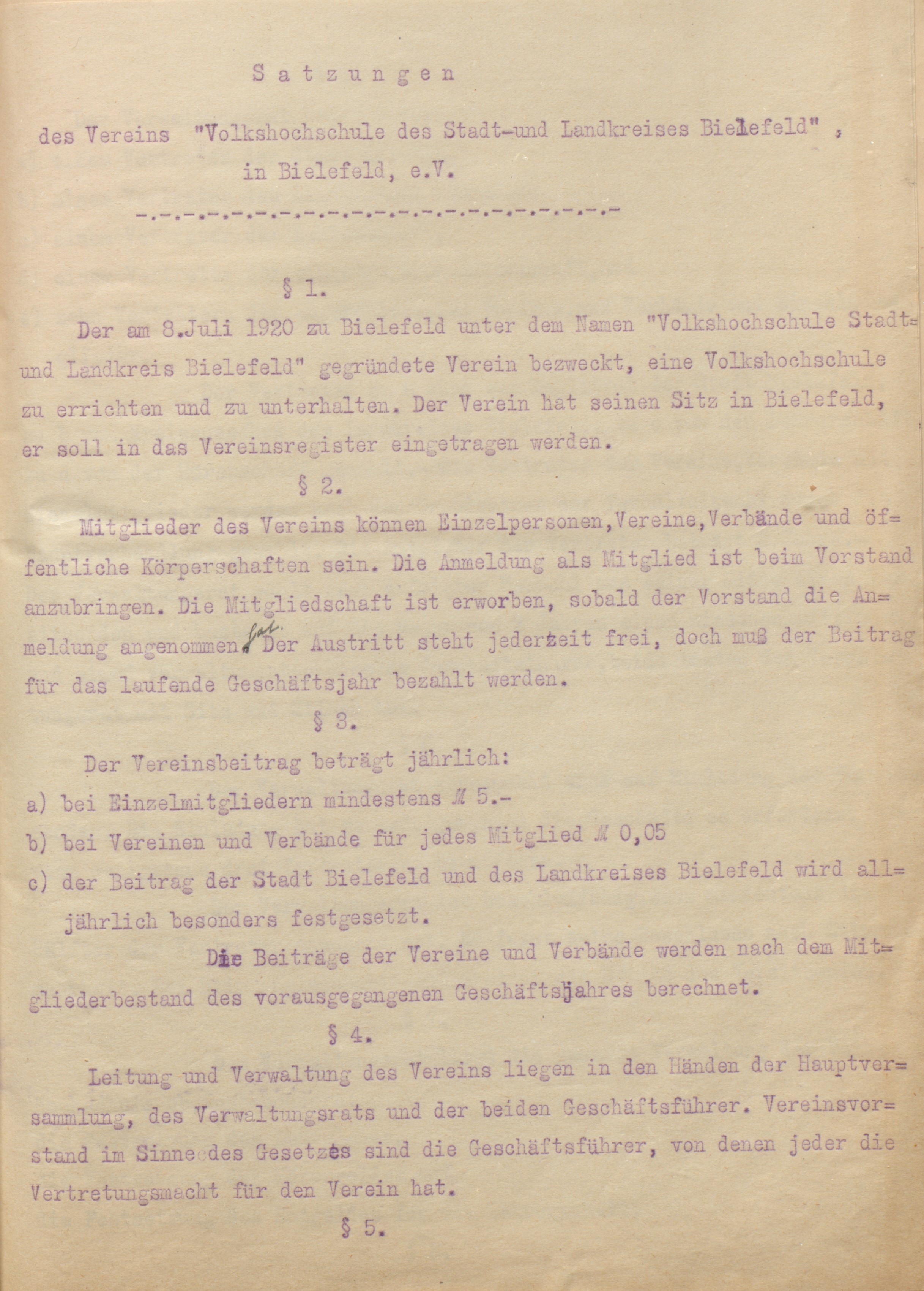 Am 8. Juli 1920 fanden sich knapp 50 Delegierte verschiedenster Gruppen zusammen. Unter dem Vorsitz des besoldeten Stadtrats und Wohlfahrtsamtsleiters Gottlob Binder (1885-1961) beschlossen sie in der Handelsfachschule die Satzungen des Vereins „Volkshochschule Stadt- und Landkreis Bielefeld“. Leitung und Verwaltung lagen bei der Hauptversammlung, dem Verwaltungsrat und zwei Geschäftsführern. Im Verwaltungsrat saßen je ein Vertreter von Stadt und Kreis sowie aus der Dozenten- und der Hörerschaft sowie zehn Vertreter der Vereinsmitglieder. Diesem Verwaltungsrat oblag die Festsetzung des Lehrplans, des Hörergelds und der Dozentenhonorare.