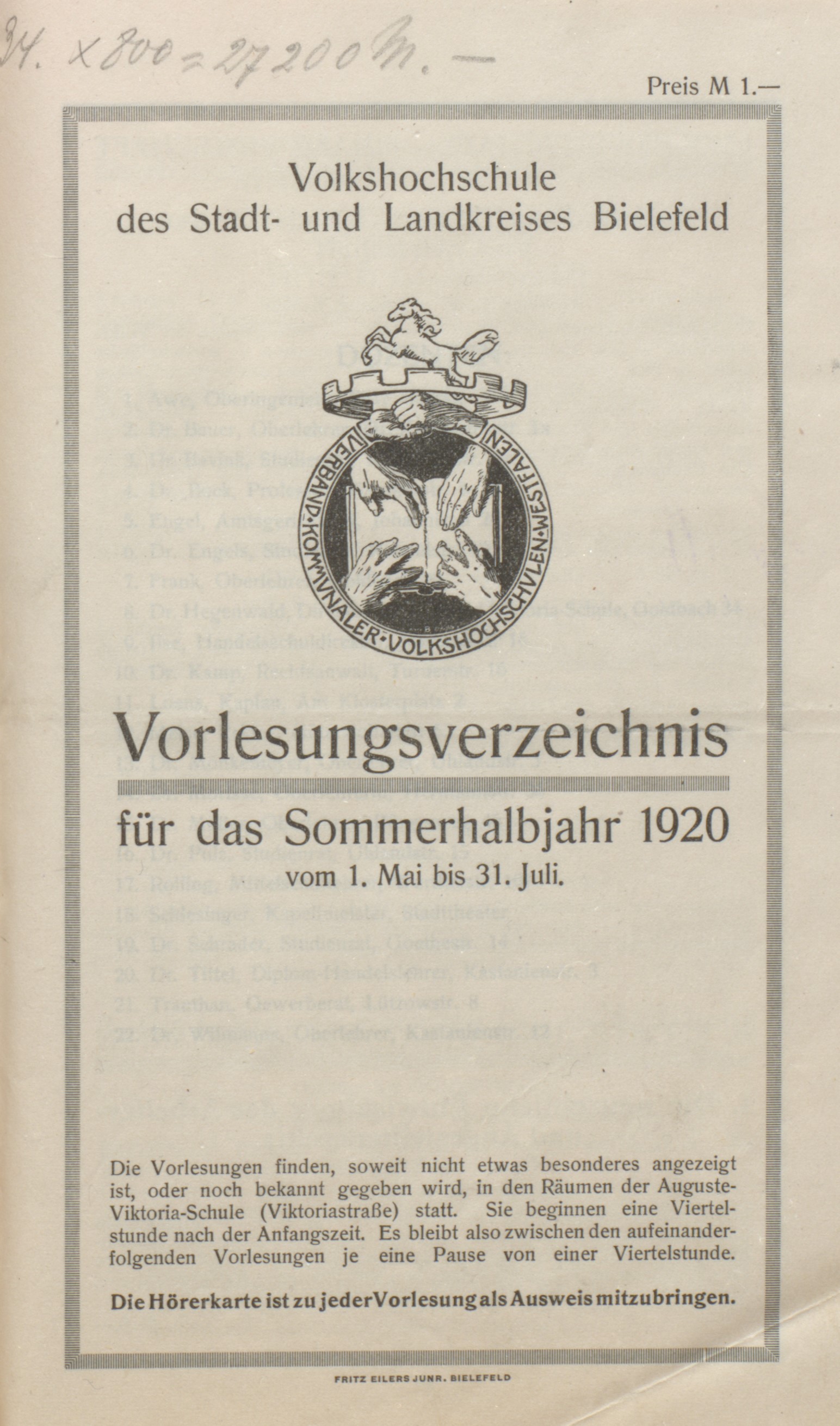 Vereinsmitglieder (natürliche Personen konnten ebenfalls beitreten) wurden zunächst die Stadt und der Kreis, das Gewerkschaftskartell, die freie Vereinigung der Angestellten, das christlich-nationale Gewerkschaftskartell, der deutsch-nationale Handlungsgehilfenverband, der Gewerkschaftsbund der Angestellten, Bielefelder Arbeitgeber-Bund, Ärzte-Verein, Bund Deutscher Architekten, Akademiker-Bund, der – so kritische – Philologen-Verein, Oberlehrerinnen-Verein, die Lehrervereine Schildesche und Brackwede, der Verein für Unterhaltung und Bildung in Senne I und der Lehrerinnen-Verein Bielefeld, das Ortskartell der Beamten-Vereine, die Vereinigung ehemaliger Mittelschüler und der Alkoholgegner-Bund. Gemeinsam vertraten die Vereine mehr als 45.000 Mitglieder, wobei es natürlich auch Doppelmitgliedschaften gab. Nachdem um August 1920 der VHS-Verwaltungsrat gewählt worden war, kam es zu einem frühen antisemitischen Anwurf gegen die Nominierung des Stadtrates Dr. Willy Katzenstein (1874-1951). Der Buchhalter und früher als Dozent tätige Heinrich Düerkopp (1882-1932) monierte die Wahl des jüdischen Rechtsanwalts als „Verhöhnung der berechtigten deutschvölkischen Bestrebungen“ und bat um die „Delegierung eines anderen Herren“. Die Stadt reagierte auf diese Einlassung in keiner Weise, sie ist jedoch ein früher Beleg für Einstellungen, die auch in Bielefeld bald Raum griffen.