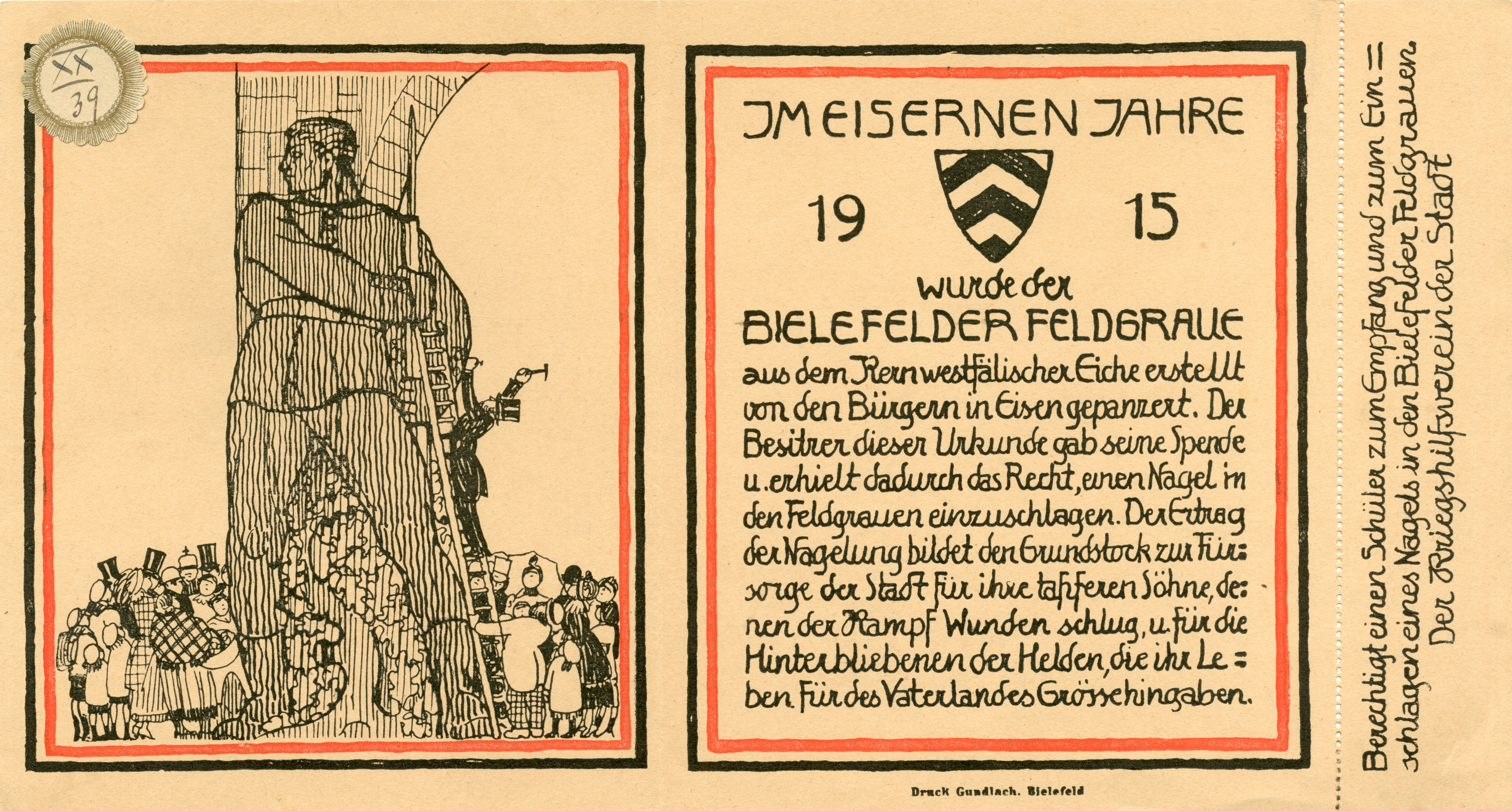 Ende Juni/Anfang Juli 1915 regte Franz Guntermann (1881-1963), Lehrer an der Handwerker- und Kunstgewerbeschule Bielefeld, bei Stadtbaurat Friedrich Schultz (1876-1945) an, „nach dem Vorgange anderer Städte ein Standbild in Holz zum Einschlagen von Eisennägeln an öffentlicher Stelle zu errichten“. Während er die Modellanfertigung und die bildhauerische Arbeit leisten wollte, sollte die Stadt die Beschaffung und Vorbearbeitung eines Holzblocks übernehmen. Guntermanns Modell fand nach Einzelbesichtigungen den Zuspruch der Magistratsmitglieder. Die stadtseitig zugebilligte Bedeutung des Vorhabens unterstrich die Tatsache, dass Oberbürgermeister Dr. Rudolf Stapenhorst (1865-1944) in der Schule nicht weniger als 28 Männer versammelte, um Details des Verkaufs von „Berechtigungskarten“, die die Kunstgewerbeschullehrerin Gertrud Kleinhempel (1875-1948) entworfen hatte, und die Lenkung der erwarteten Besuchermassen zu klären. Von dem Vorhaben, alle Schulklassen einzuladen, wurde nach einer Erhebung, die etwas mehr als 17.000 Schülerinnen und Schüler offenbarte, Abstand genommen, so dass nur die Abschlussklassen der Bürgerschulen, die beiden obersten der Mittelschulen und die drei obersten der höheren Schulen sowie vollzählig das Technische Seminar und die städtischen Fachschulen teilnehmen durften. Der Kartenvorverkauf sollte über die Schulen, Zigarrengeschäfte in der Innenstadt und über zehn „Bezirksdamen“ abgewickelt werden, deren Sprengel sich nach den Armenbezirken richtete. Immerhin gelang es den Vertreterinnen der Lokalprominenz – Kisker, Velhagen usw. – rund 7.400 von 10.400 Karten abzusetzen. Den Transport des „Feldgrauen“ sollte eine Verwundeten-Kompanie des Ersatzbataillons des Infanterieregiments 131 bewerkstelligen, das 1914 von Mörchingen im Saarland nach Bielefeld verlegt worden war und das den Ende Juni 1915 eröffneten Schauschützengraben auf der Ochsenheide angelegt hatte.