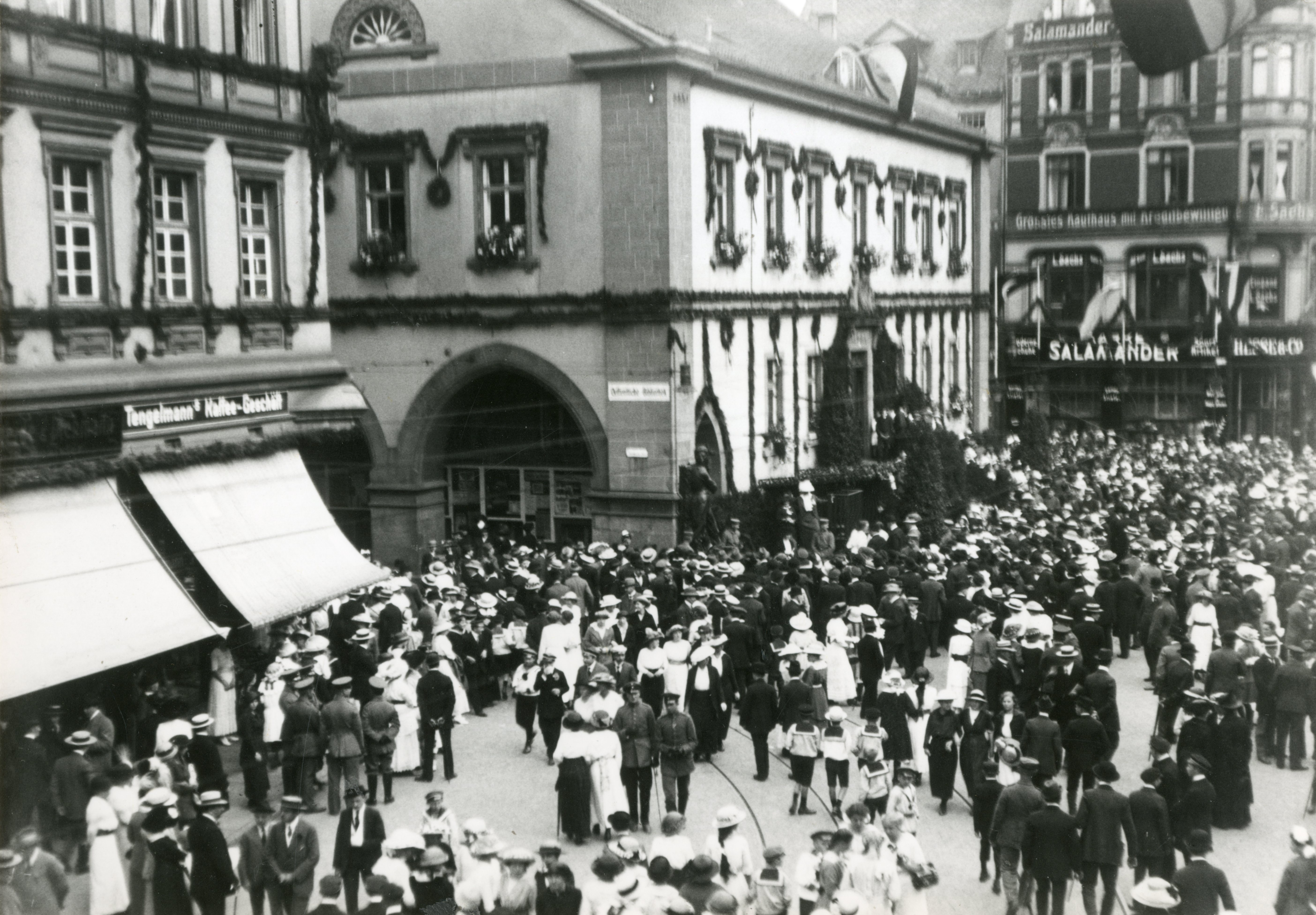 Noch während der Eröffnungsrede des Stadtverordneten Oberst a.D. Otto-Karl Niemeyer (1850-1925) enthüllten voreilige Hände die Statue und lenkten die Blicke der tausendköpfigen Menge auf dem Alten Markt auf den „Bielefelder Feldgrauen“, der zum „Eisernen Wehrmann“ werden sollte. Die Rede Niemeyers, der 1870 in den Deutsch-Französischen Krieg gezogen war, war überwiegend geprägt vom karitativen Zweck des Unternehmens für verwundete, hilfs- und pflegebedürftige Soldaten und atmete keine Kriegsbegeisterung, sondern eher eine verbreitete Entschlossenheit: „Möge dieses Denkmal uns aber auch zu einer täglichen Fürbitte für unser tapferes Heer und seine bewährten Führer anregen, und möge unsere inständige Bitte erfüllt werden, daß wir aus diesem uns aufgezwungenen und von unseren zahlreichen Feinden jahrelang vorbereiteten Kriege als Sieger so hervorgehen, daß wir uns eines langen, ehrenvollen Friedens erfreuen dürfen.“ In seiner Ansprache drückte Oberbürgermeister Stapenhorst ebenfalls seine Sorge um die Soldaten und die Hoffnung auf aktive Spendentätigkeit aus und schloss mit einem dreifachen Hoch auf die „Feldgrauen zu Lande, auf dem Wasser und in der Luft, die unerschrockenen Verteidiger der Ehre und der Größe unseres Vaterlandes“. Das anschließende „Deutschland über alles“ wird mehr ein patriotischer Ausdruck gewesen sein, als ein hegemonialer.