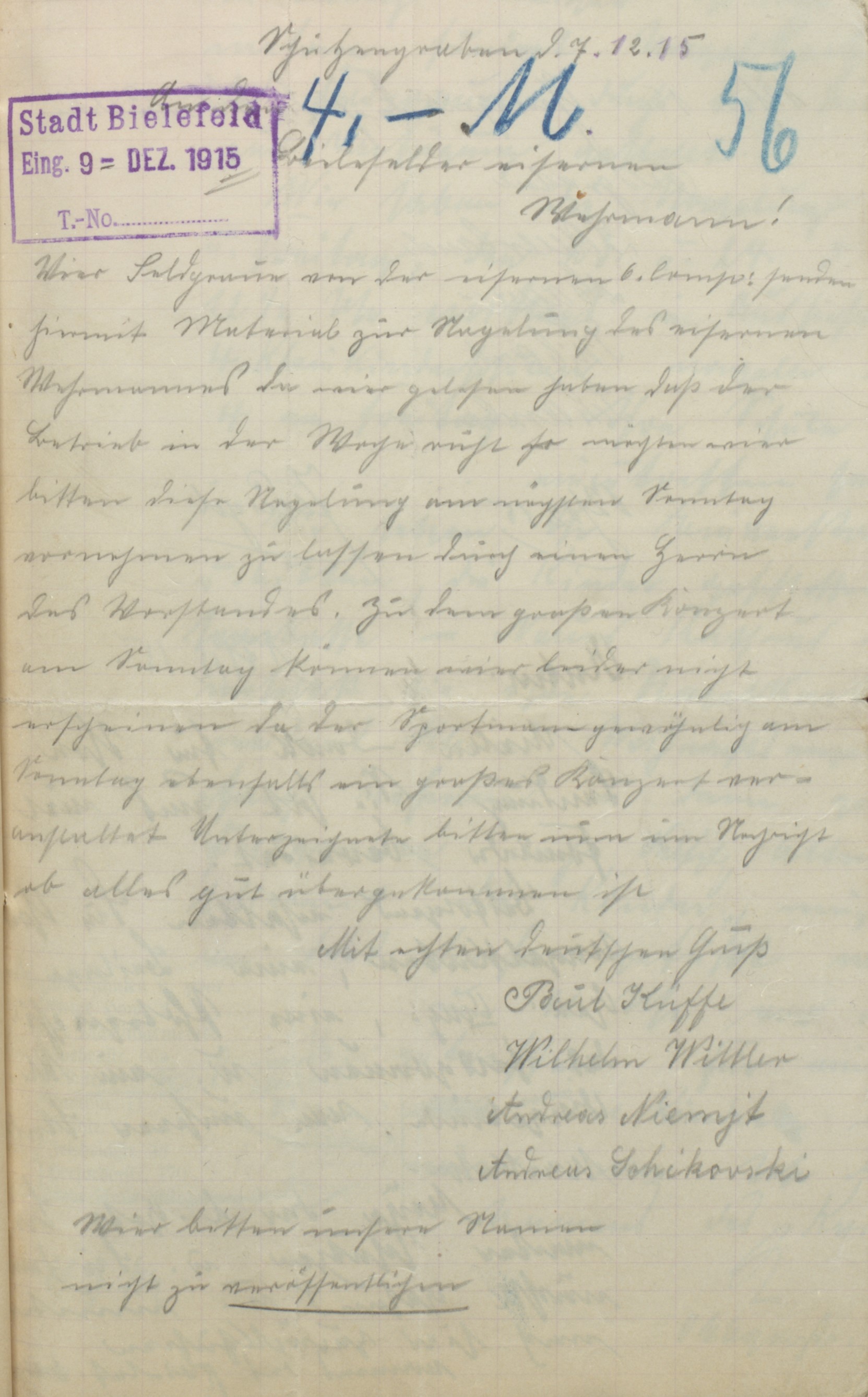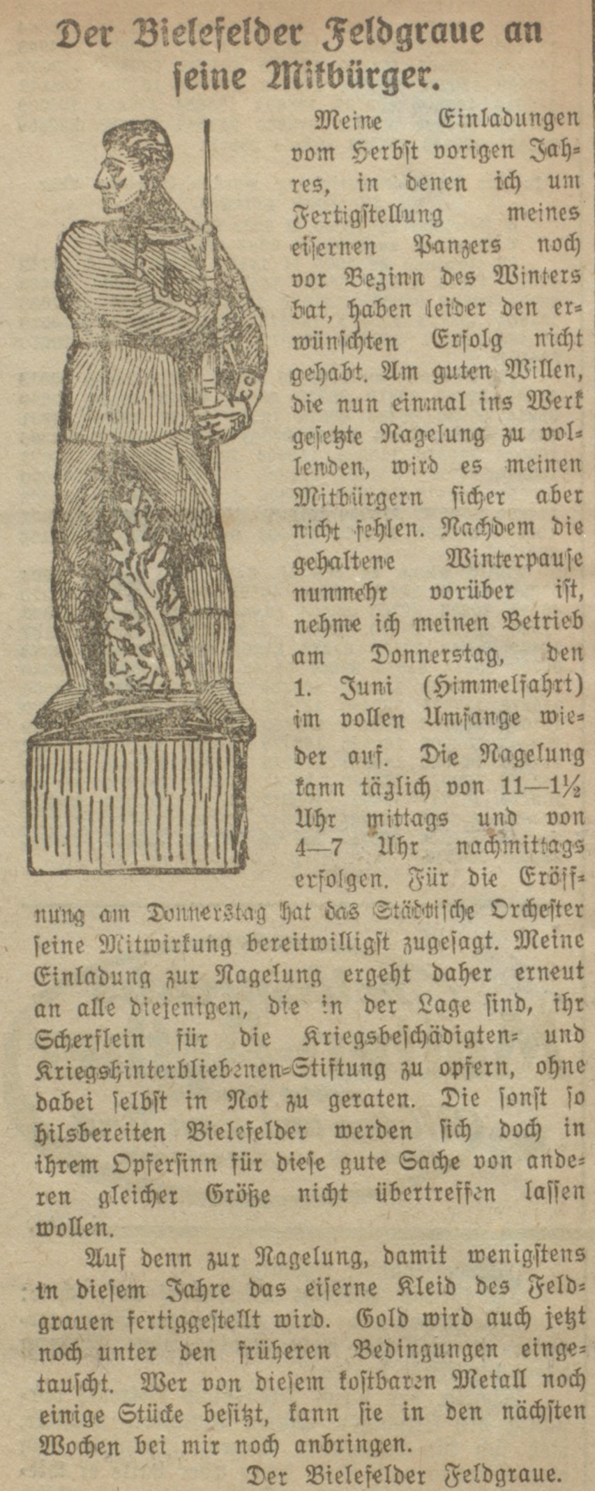 Bis Ende November hatte der Feldgraue geduldig das Eintreiben der Nägel hingenommen, jedoch nahm die Intensität ab, was der Witterung ebenso zuzuschreiben war wie einer gewissen Übersättigung und Überforderung des Publikums wegen der zahlreichen Spendenwerbungen. Persönlich formulierte Einladungen des „Bielefelder Feldgrauen“, die die Stadt in den Zeitungen veröffentlichte, fruchteten kaum, auch wenn vier Soldaten der 6. Kompanie/Infanterie-Regiment 55, die von der „Klage über meine Vernachlässigung“ gelesen hatten, aus dem Schützengraben 4 Mark spendeten. Mit dem Sarkasmus der Fronterfahrenen sagten Paul Küffe, Andreas Niemjt, der bereits zwei Mal verwundete Wilhelm Wittler und Andreas Schikowski ihre Teilnahme am nächstsonntäglichen Konzert ab, da „der Sportmann gewöhnlich am Sonntag ebenfalls ein großes Konzert veranstaltet.“ Gemeint war wohl, dass der gegenüberliegende Feind (Sportmann = Engländer?) die deutschen Stellungen regelmäßig mit Artilleriebeschuss belegte. Andreas Schikoswki fiel im Alter von 25 Jahren am 12. September 1916 an der Somme, seine drei Kameraden überlebten wohl.