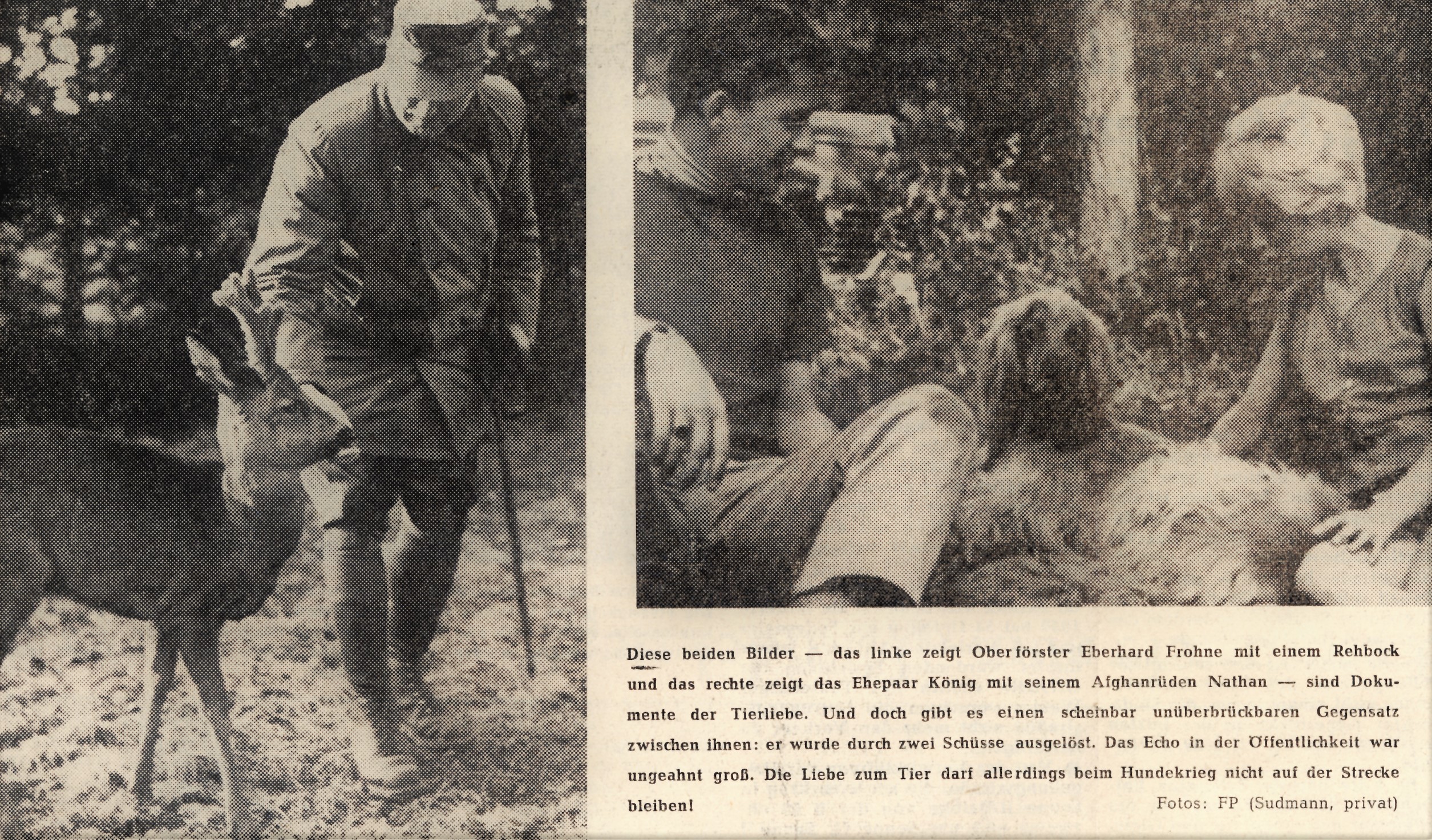 1959/60 war es in den städtischen Forsten und Liegenschaften, rund um den Tierpark Olderdissen und in ihm immer wieder zu Vorfällen mit wildernden Hunden gekommen. Am 12. Januar 1960 hatte ein Schäferhund auf dem Teich im Bürgerpark eine Ente gerissen, war dabei aber selbst ertrunken. Am Folgetag luden Gartendirektor Dr. Hans Ulrich Schmidt (1912-2006) und Stadtoberförster Frohne Pressevertreter in das Rathaus ein, um über die Lage gerade in Notzeiten mit Frost und Schnee zu orientieren. Die Liste der Verluste durch Hunderisse in den sechs Monaten seit August 1959 war nämlich deutlich länger: vier Rehe, darüber hinaus allein in Olderdissen ein Schwarzstorch, ein Weißstorch, eine Höckergans und eine Blessgans sowie jeweils zwei Kanadagänse und Brandenten sowie drei Wildenten und sieben Türkenenten. Dr. Schmidt erwähnte, dass jeder Hund bei sich bietender Gelegenheit wildere. Frohne ergänzte Beispiele aus Olderdissen und betonte, dass ein Hund ein Reh nicht per Kehlbiss töte, „sondern es langsam zu Tode hetzt und quält“. Westfalen-Blatt, Westfälische Zeitung und Freie Presse berichteten am 14. Januar 1961 auch über die Konflikte mit Hundehaltern im Stadtgebiet, die für ihre Vierbeiner weitgehende Auslaufrechte zu Lasten der Wildtiere beanspruchten.