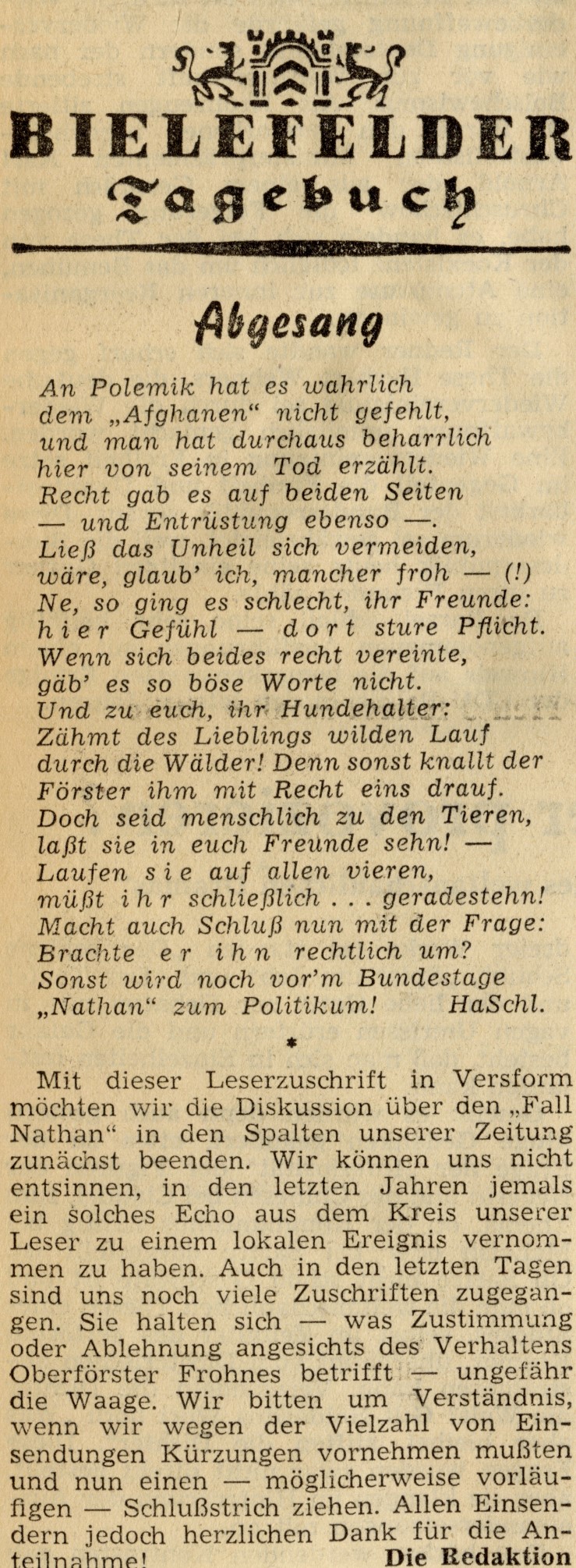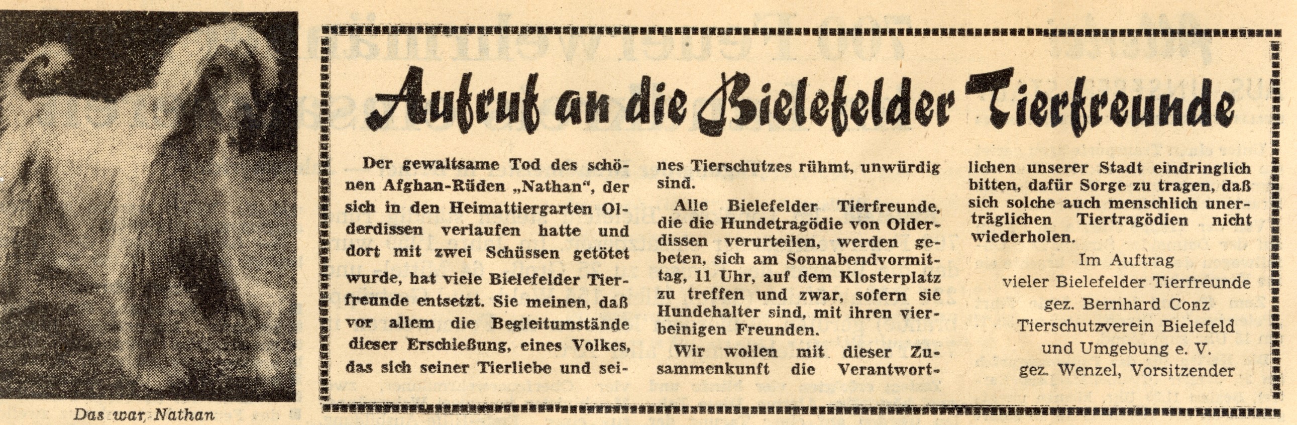 Am Vormittag des 21. Januar 1960 hallten kurz hintereinander Schüsse durch den Tierpark Olderdissen. Es war wenig Publikum unterwegs, als der Afghanenrüde Nathan am Rehwildgehege tot in das Herbstlaub sank und Oberförster Eberhard Frohne seiner Bockdoppelflinte zwei qualmende Patronenhülsen entnahm. Um die Rechtmäßigkeit und Notwendigkeit der Schüsse, aber auch und vor allem um die Begleiterscheinungen entwickelte sich für mehr als ein Jahr der „Bielefelder Hundekrieg“. Er bescherte der Stadt nach einer Demonstration von mehr als 1.000 Hundefreunden auf dem Klosterplatz eine bundesweite Aufmerksamkeit. Möglicherweise hatte er nach Hunde-Abschüssen und Kritik daran schon früher unerklärt begonnen, beendet wurden dagegen seine Nachwehen erst am 15. Februar 1961.