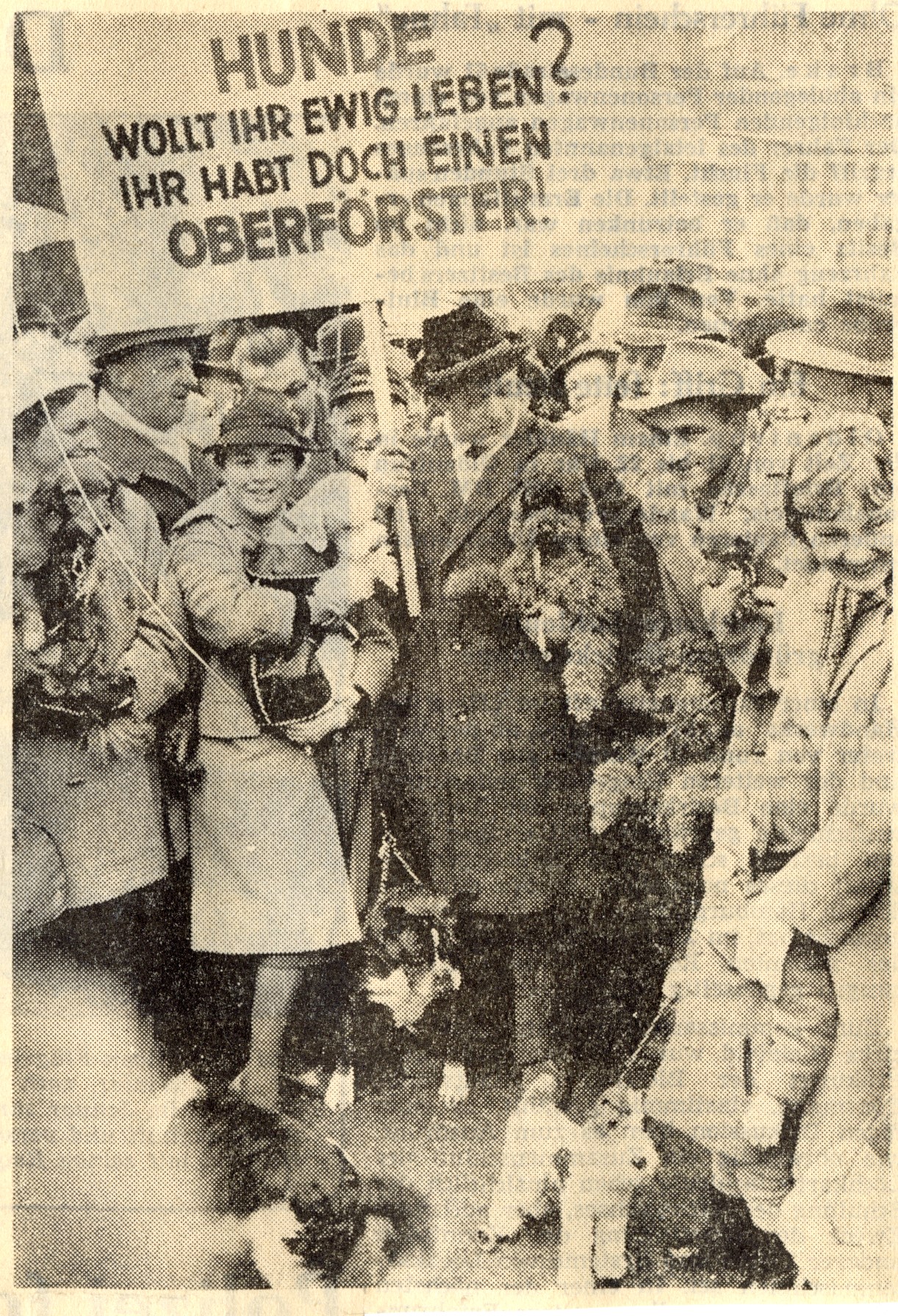 Zur Kundgebung am 30. Januar 1960 kamen mehr als 1.000 dieser Tierfreunde, um gegen den Abschuss zu protestieren. Auch viele Vierbeiner waren zum Klosterplatz gekommen, darunter ein Stoffhündchen, das artig an der Leine eines kleinen Mädchens hing. Die Demonstration fand ein bundesweites Medienecho: „Die Welt“, die „Bild-Zeitung“ und auch die „Frankfurter Allgemeine“ berichteten anschließend ebenso wie beispielsweise auch der Ostholsteiner Anzeiger, die Nürtinger Kreisnachrichten, die Norderneyer Badezeitung oder der „Bote aus den 6 Ämtern“ aus Wunsiedel – insgesamt rund 100 Zeitungen. Regelmäßig erschien dabei der Text eines von Conz empor gehaltenen Schildes auf Fotos oder in der Schlagzeile: „Hunde wollt ihr ewig leben? Ihr habt doch einen Oberförster!“ Die erste Zeile war dem zwei Jahre zuvor erschienenen Stalingrad-Roman von Fritz Wöss (1920-2004) entlehnt, der schon 1959 verfilmt wurde. Dieses Plakat sollte ein Nachspiel haben.