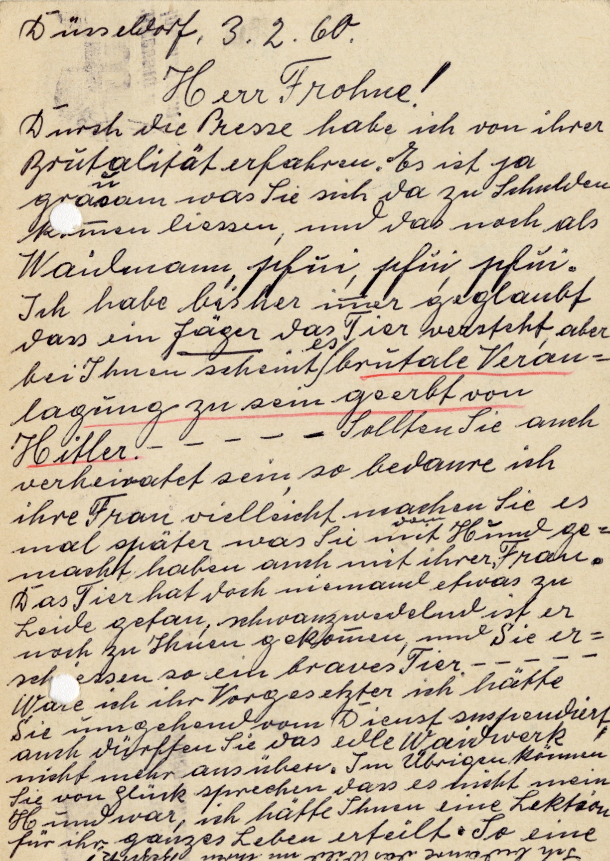 Der Protest fand aber nicht nur in Leserbriefen und auf der Straße statt, er erreichte auch die Briefkästen Frohnes und der Verwaltung. Eine erkennbar verzweifelte Gertrud Frohne gab ihrem Mann regelrechte Drohbriefe nicht zur Kenntnis. Sie monierte, dass er durch „planmäßige Verhetzung und Sensationsgier bestimmter Kreise zum Verbrecher“ gestempelt werde, schließlich sei er ein Mann, „der nur seine Pflicht kennt, sich im Leben nie fürchtete“ und im Zweiten Weltkrieg für Tapferkeit mit dem Eisernen Kreuz ausgezeichnet worden sei. Dieser einmalige Zusatz war in der Debatte weder nötig noch hilfreich. Insgesamt waren 50 Einsendungen verzeichnet worden, davon 30 grob beleidigend ausgefallen, von denen wiederum 18 anonym gehalten waren. Wegen des einen Dutzend als besonders beleidigend empfundener Schmähbriefe erbat die Stadtverwaltung in Düsseldorf, Essen, Köln, Kiel, Hamburg, Lünen, Erlangen und Hannover Amtshilfe bei der Adressermittlung der Absender. Alle ließen sich zu einer Entschuldigung bewegen, die sie mit einer irreführenden Berichterstattung in den Zeitungen, vor allem in der „Bild“ begründeten. Eine inzwischen verunsicherte Einsenderin aus Kiel bat gar Dr. Bernhard Grzimek (1909-1987) um eine Einschätzung. Der damalige Direktor des Frankfurter Zoos riet ihr zu einer Entschuldigung, lehnte aber eine inhaltliche Stellungnahme, ob der Oberförster „mit einem gewissen Übermut gehandelt hat“, nur aufgrund der Presseberichte ab: „Wenn Rehe und Hirsche von Hunden gehetzt, verwundet und zerrissen werden, muss unter Umständen scharf durchgegriffen werden.“