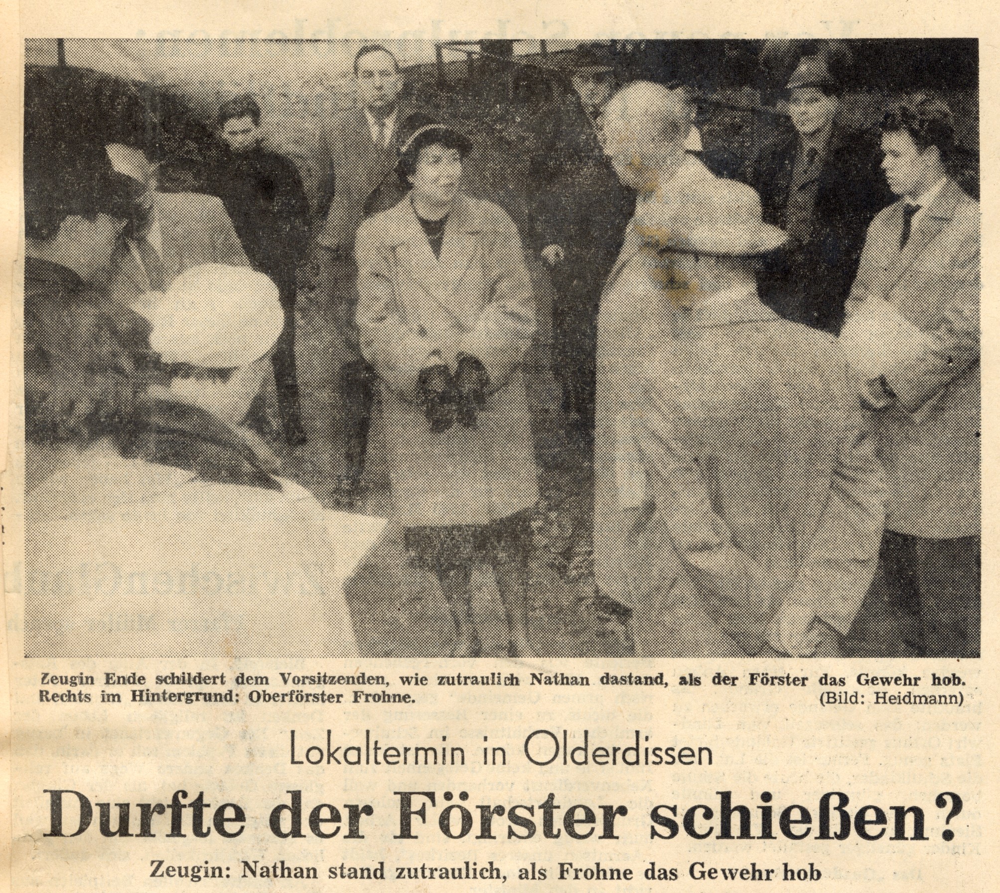 Ortstermin: Auf Veranlassung des Landgerichts fanden sich am 19. Oktober 1960 neben den Richtern, Anwälten, städtischen Vertretern, Prozessbeobachtern, Medien auch die wenigen Zeugen für eine mündliche Verhandlung in Olderdissen ein, bei der der Tatort in Augenschein genommen und vermessen wurde. Die Hauptzeugin Ilse Ende zog dabei ihre frühere und von der Presse wiederholt aufgenommene und ausgebreitete Aussage zurück, wonach Nathan „Männchen“ gemacht habe. Auch der angebliche Nervenschock der Kinder habe sich nicht bewahrheitet. Den Zeugenaussagen mehrerer Tierpark-Mitarbeiter zufolge „sprangen die Rehe in ihrer Angst im Rehgehege wild umher“. Im Termin ließen die Vertreter des Landgerichts bereits durchblicken, dass die Klage abgewiesen werde.