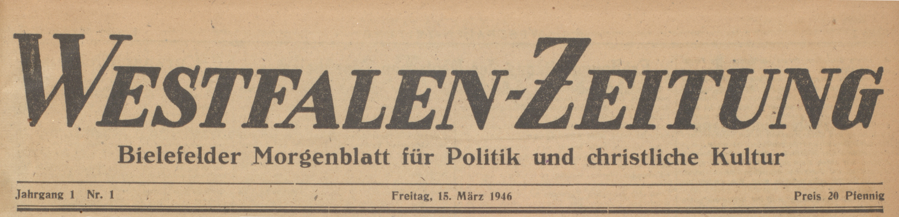 „Mit dem heutigen Tage […] übergeben wir die erste Nummer der Westfalen-Zeitung der Öffentlichkeit. In diesen Märztagen sind in der britischen Zone eine Anzahl von Zeitungen erschienen oder werden in Kürze erscheinen, die als deutsche Zeitungen berufen sind, zu ihrem Teil an der künftigen politischen Willensbildung unseres Volkes verantwortlich mitzuarbeiten. Eine neue Phase auf dem Weg zur Selbständigkeit der deutschen Presse ist damit erreicht.“ In einem mit großem Pathos geschriebenen Leitartikel stellten die Herausgeber am 15. März 1946 die programmatische Zielsetzung der „WZ“ vor. Wenige Tage zuvor hatte die britische Militärverwaltung den Verlegern Alfred Hausknecht (1891-1958) und Prof. Dr. Dieter Lauenstein (1914-1990) eine für die Herausgabe von Tageszeitungen notwendige Lizenz erteilt. Die Vorgaben der Besatzungsbehörde waren unmissverständlich: Zeitungen war die Verbreitung von nationalsozialistischem Gedankengut verboten, sie durften nicht rassistisch sein und sollten das demokratische politische Spektrum abbilden. Die „blutige Dämonie des Hitlerismus“, die zwölf Jahre lang Deutschland und seit 1939 die Welt ins Unheil gestürzt hätten, waren für die Herausgeber der WZ ein Beweis dafür, dass „die Abkehr von den ewigen Gesetzen Gottes ins Verderben führt.“ Vor diesem Hintergrund kündigten sie an, jene demokratischen Kräfte unterstützen zu wollen, „die aus dem persönlichen Erleben des Christentums eine kulturelle und soziale Verpflichtung gegenüber der Menschheit ableiten.“