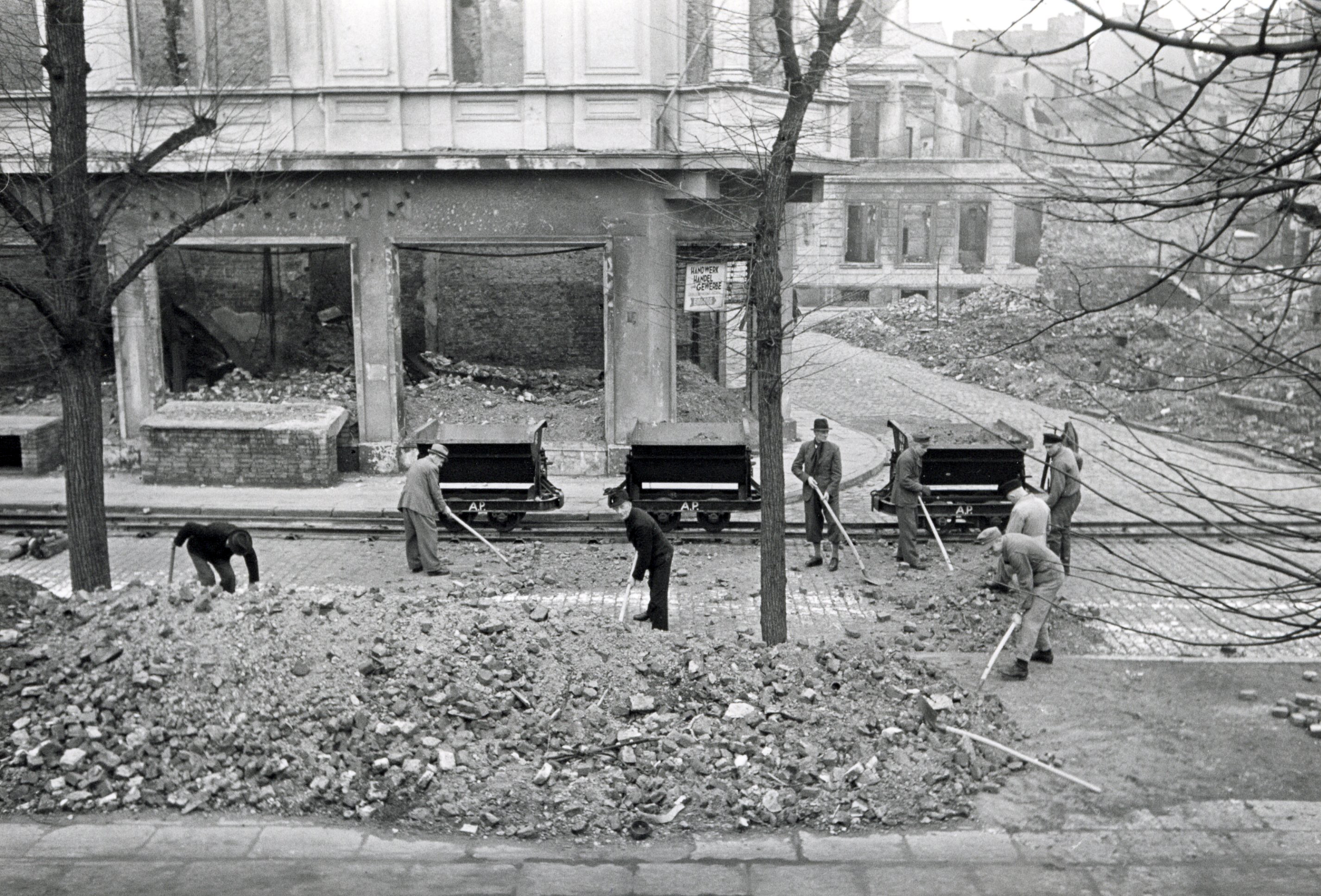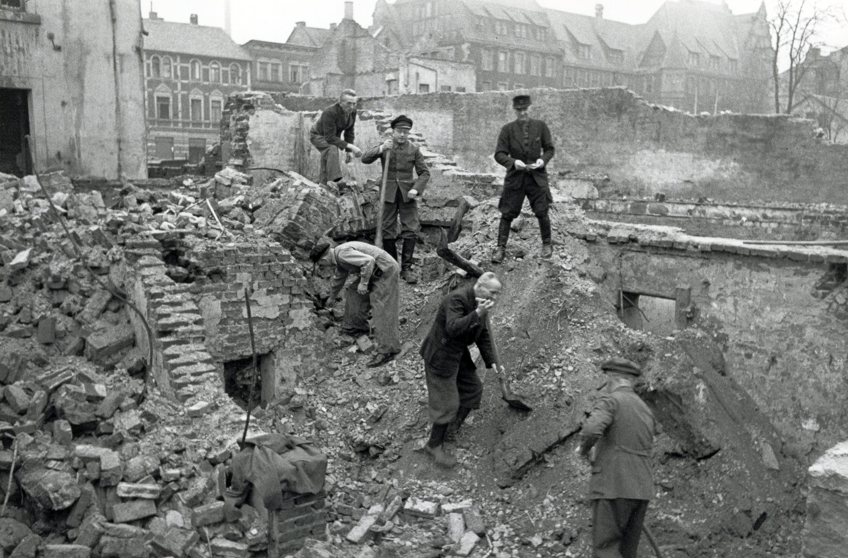 Die Nachkriegsjahre werden in der populärwissenschaftlichen Rückschau häufig als eine Zeit beschrieben, in der die Ärmel hochgekrempelt wurden und sogenannte Trümmerfrauen den Schutt des Krieges wegräumten. In Bielefeld waren alle Menschen, die einen Spaten halten konnten, an der Trümmerbeseitigung nach den Luftangriffen beteiligt. Oft freiwillig, nicht selten aber auch von der britischen Besatzungsbehörde dazu gezwungen. Höchste Priorität hatten Bürgersteige und „Fahrdämme“ in der stark zerstörten Altstadt, aber auch die das Hufeisen umgebenden „militärischen Vorrangstraßen und Hauptverkehrsstraßen“. Der Abtransport der Schuttmassen zu einem Ziegeleigelände im Osten der Stadt erfolgte bereits 1945 mit einer Feldbahn, deren Fahrt jedoch oft tagelang unterbrochen wurde. Kraftstoffe für Diesellokomotiven standen gar nicht zur Verfügung und auch an Kohlen, mit denen Dampflokomotiven betrieben wurden, sollte es noch jahrelang mangeln. Im Oktober 1945 waren schon etliche, im Krieg zerstörte Vorflutkanäle, so in Gadderbaum, an der Stapenhorst- und Sudbrackstraße, wieder instandgesetzt, während die Pflasterung von Straßen stockte, weil die Steinbrüche ihre Produktion noch nicht aufgenommen hatten. Im Dezember 1945 waren von den zerstörten oder beschädigten Wohnungen bereits mehr als 2.100 Wohnungen wiederhergestellt, bei weiteren 1.800 instandgesetzten Wohnungen fehlten aber noch die Glasscheiben.