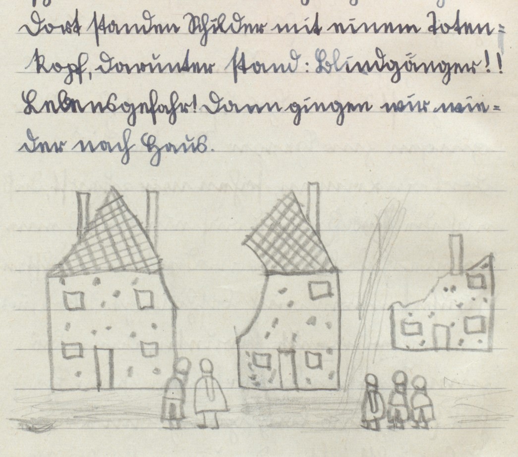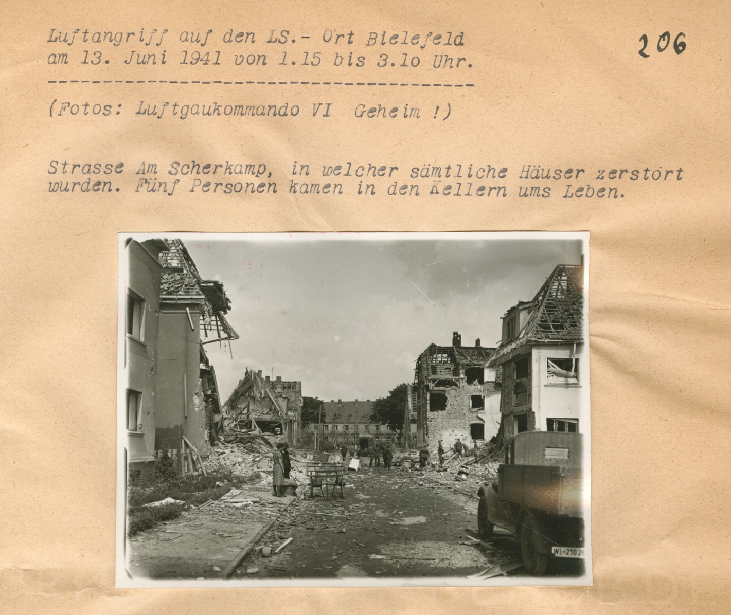 Museumsleiter Eduard Schoneweg (1886-1969), der seit 1939 die städtische Kriegschronik führte, besichtigte in den Tagen nach dem Angriff die Orte der Zerstörung im Stadtgebiet. Am Scherkamp angekommen, „wo verhältnismäßig die meisten Toten unter den Trümmern lagen“, stellte er sein Fahrrad ab, mischte sich unter die Schaulustigen und tat anschließend seiner Chronistenpflicht genüge: „Dieses Durcheinander von Gesteinsmassen, Dachsparren, Möbelteilen, Matratzen, Betten, Kleiderstücken, Küchengeschirr lässt sich nicht beschreiben.“ Von der Herforder Straße hatte sich eine Familie auf eine Besichtigungstour gemacht, wie die neunjährige Tochter anschließend in einem kleinen, mit einer kindlichen Zeichnung ergänzten Aufsatz an der Stadtheiderschule berichtete: „Am Sonntag, den 15. Juni, nachmittags nach dem Kaffeetrinken gingen meine Eltern, mein Bruder und ich spazieren. Wir wollten uns die zerstörten Häuser ansehen. […] Wir gingen die Brückenstraße herunter, dann bis zum Scherkamp. Dort war kein Haus heil. Ein Haus lag ganz am Boden. Das nächste stand nur halb. Wir gingen weiter […].“