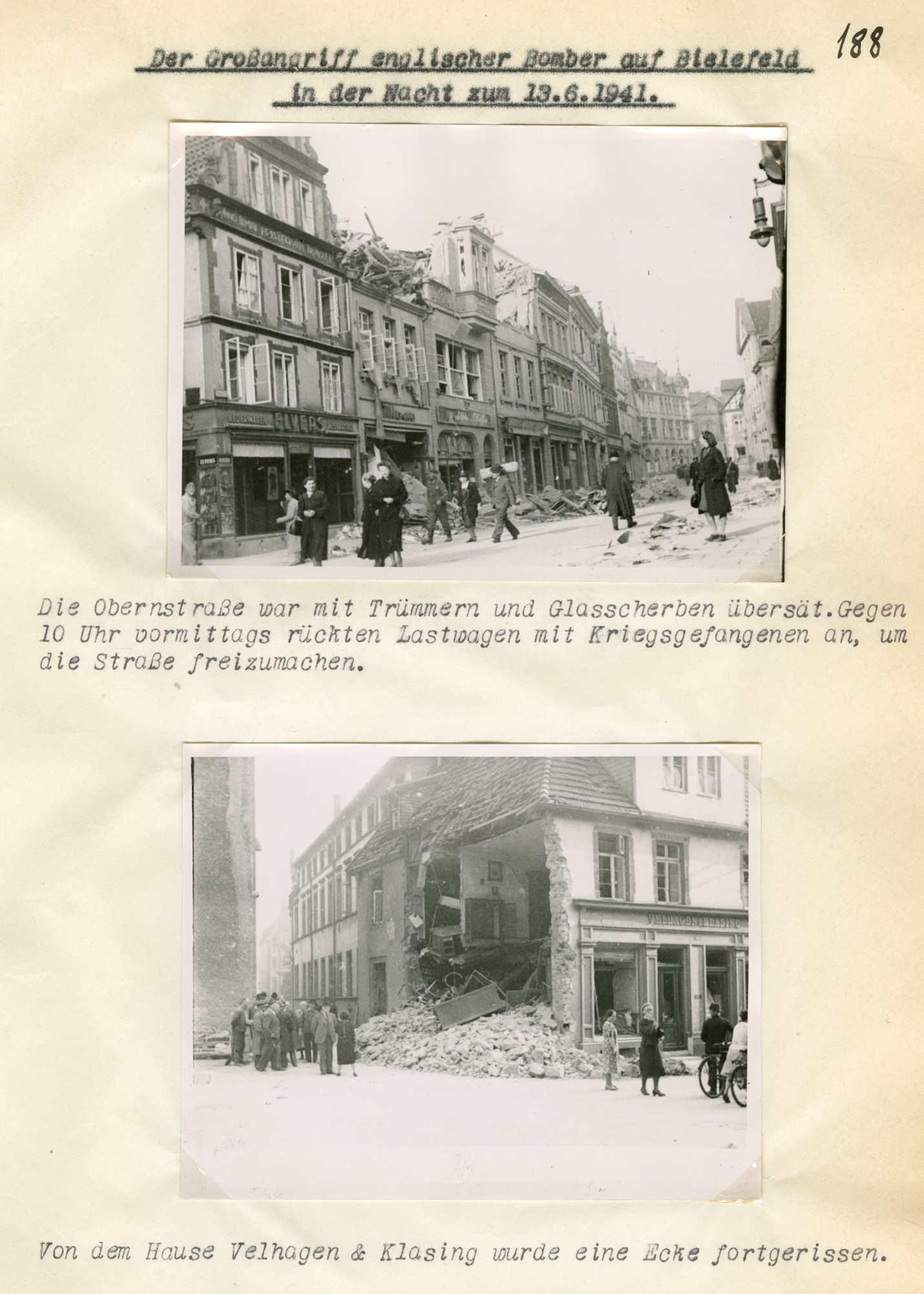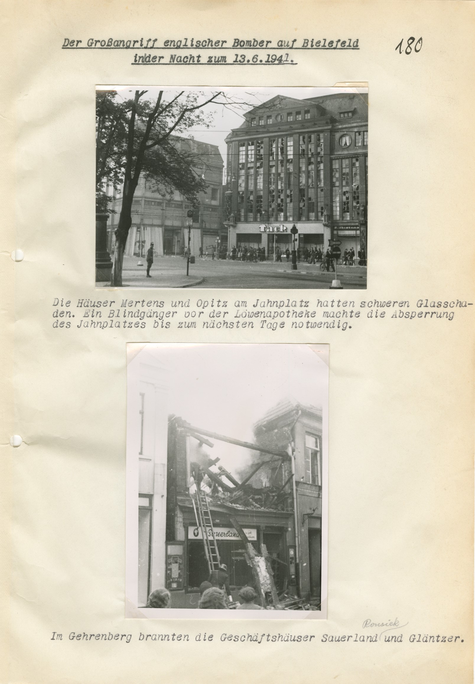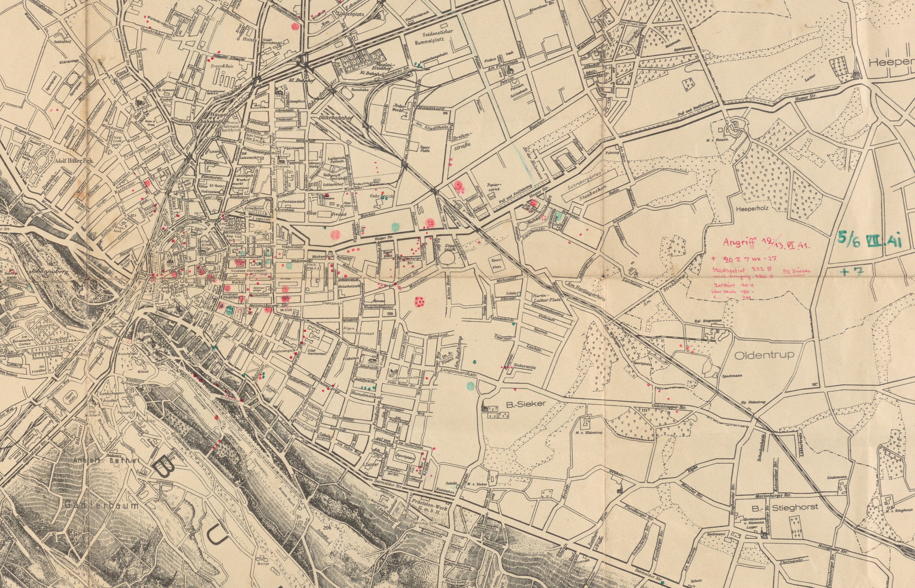 Neben 2.000 Brandbomben gingen am 13. Juni 1941 mindestens 237 Sprengbomben auf Bielefeld nieder, weitere 56 auf Dornberg, Babenhausen, Vilsendorf und Bethel. Um 0.52 Uhr hatte der Luftangriff begonnen, gegen 2.00 Uhr endete er, erst um 3.50 Uhr wurde Entwarnung gegeben. 40 Gebäude wurden vollständig zerstört, 180 schwer beschädigt, 900 leicht. Allein in den Dürkopp-Werken I bis III brannten knapp 3.900 qm Fläche, am eng bebauten Gehrenberg insgesamt 13 Häuser und an der Einschlagstelle Heeper Straße 35, wo der 66-jährige Kassenbote Adalbert Mirus starb, ein 1.200 qm großes Lagerhaus der Ravensberger Spinnerei. Akribisch dokumentierte die Feuerwehr anschließend 52 Großschadensstellen mit Zerstörungsgrad und Vermerken über eingesetztes Personal und Material, kartierte die Einschläge der Sprengbomben und örtliche Verteilung der Todesopfer im Stadtgebiet.