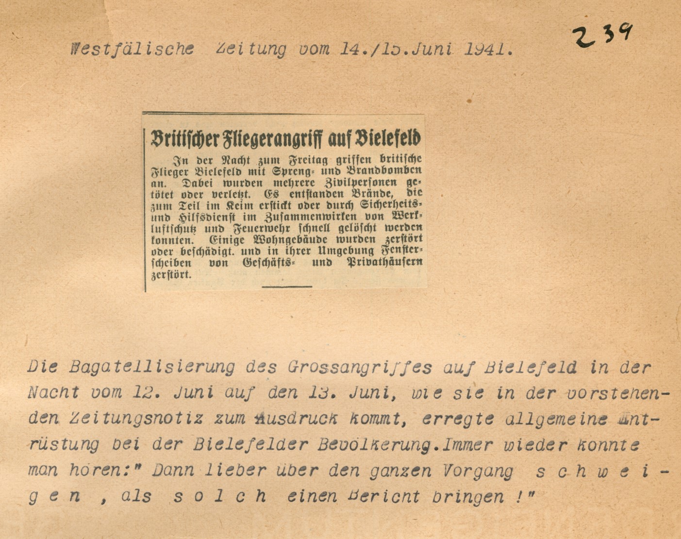 Geises Anmerkung deutet auf eine weitgehende Nachrichtensperre nach dem Luftangriff. Tatsächlich war die Presseberichterstattung über die Folgen des Bombardements vergleichsweise dünn und durchweg unbebildert, lediglich die propagandistisch aufgeladenen Artikel über die Beisetzungsfeiern nahmen wenige Tage später breiten Raum ein. Die Westfälischen Neuesten Nachrichten hatten am 14. Juni 1941 in 25 Zeilen sehr allgemein über Todesopfer und Schäden berichtet und eine Rache-Ankündigung angehängt, die niemandem etwas nützte: „Auch dieser britische Nachtangriff auf Bielefelder Heimstätten gehört in die Reihe jener Taten, auf die die deutsche Luftwaffe die gebührende Antwort geben wird.“ Überlagert wurde der Artikel durch einen umfänglichen und bebilderten Bericht über Flak-Soldaten, der merkwürdig deplatziert wirkt, da er keinerlei Bielefeld-Bezug aufwies und allenfalls als verspätetes Versprechen eines zukünftig verbesserten Luftschutzes und einer erfolgreichen Luftabwehr verstanden werden konnte. Die Westfälische Zeitung kam sogar mit elf dürren Zeilen aus. Auch der Mantelteil der Westfälischen Neuesten Nachrichten v. 16. Juni 1941 mit den Meldungen des Oberkommandos der Wehrmacht lieferte kaum weitere Erkenntnisse: „Der Feind warf in der letzten Nacht an einigen Stellen in Westdeutschland Spreng- und Brandbomben. Die Zivilbevölkerung hatte Verluste an Toten und Verletzten. Militärischer oder wehrwirtschaftliche Schaden entstand nirgends. Flakartillerie schoß zwei der angreifenden britischen Flugzeuge ab.“ Angesichts der allein für Bielefeld registrierten Opfer und Schäden nahm sich der Erfolg der deutschen Luftabwehr bescheiden aus.