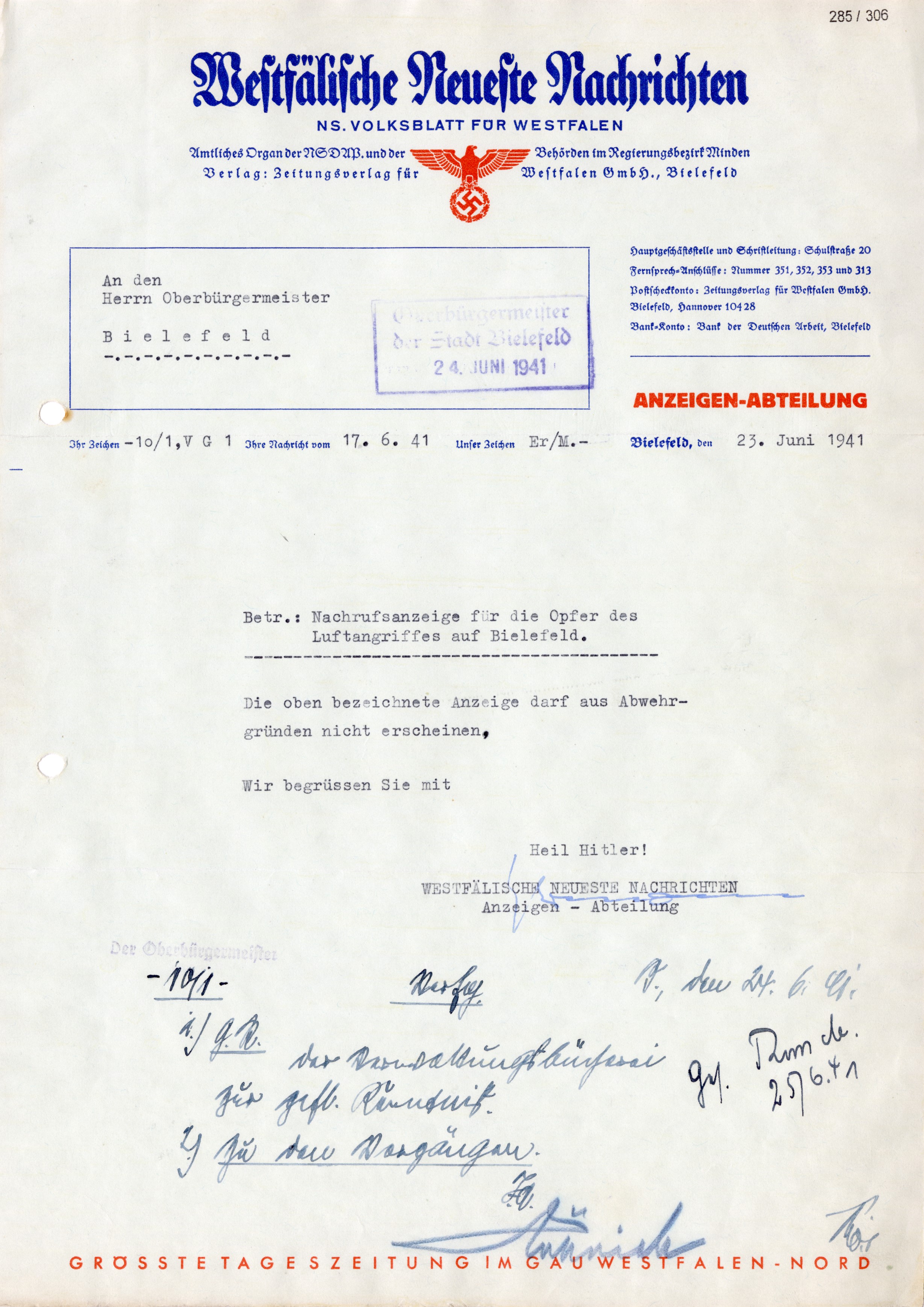 Wie weit die Propaganda- und Geheimhaltungsmaschinerie gehen konnte, zeigte sich anhand des von Oberbürgermeister Fritz Budde (1895-1956) bereits am 17. Juni 1941 an die Presse gegebenen Nachrufs der Stadt für die bis dahin bekannten 19 Todesopfer, die „ihr Leben im Kampf für Grossdeutschlands Freiheit“ gegeben hätten. Die Anzeigen-Abteilung der WNN beschied den OB recht lapidar mit einer ohne Anrede eingeleiteten Mitteilung: „Die oben bezeichnete Anzeige darf aus Abwehrgründen nicht erscheinen“. In den WNN am 16. Juni 1941 erschienene Todesanzeigen von Familie, NSDAP und Reichsbahn für den Lokomotivführer und Parteigenossen Georg Nolte, der in der Ravensberger Straße 27 gestorben war, hatten seinen Tod gar als Folge eines „Unglücksfalls“ getarnt.