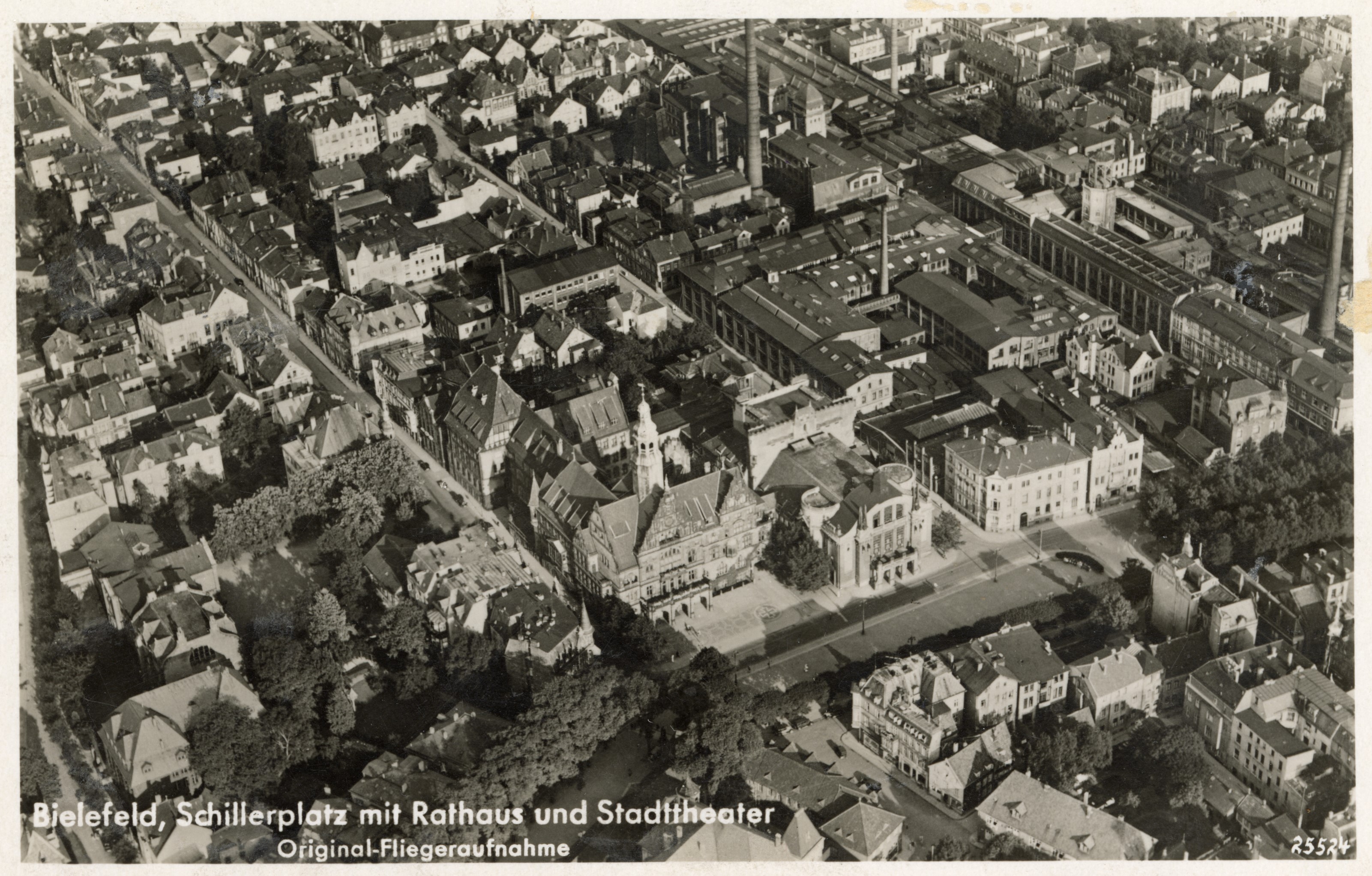 Schoneweg besichtigte am Folgetag die Innenstadt: Gehrenberg, das Crüwellhaus mit intaktem Treppengiebel, aber zerstörtem Hinterhaus, das Rathaus am Alten Markt und die Krummachersche Apotheke. Der Jahnplatz war „völlig menschenleer. Das Haus der Technik, Jahnplatz 5, das Haus Woolworth, Jahnplatz 4, und die Loewen-Apotheke schienen besonders mitgenommen zu sein.“ Die berühmte Jahnplatz-Uhr war um 2.27 Uhr stehen geblieben. Die Druckwelle einer im Rathausinnenhof explodierten Sprengbombe zerstörte die 1904 installierten farbigen Glasfenster mit Darstellungen Bielefelder Industrie und Handels: „Ein grosser Verlust ist das nicht; sie waren Kinder ihrer Zeit und werden leicht durch bessere zu ersetzen sein.“ Selbst unter diesen Umständen kehrte der Museumsleiter eine kunsthistorische Expertise heraus, die er schon vor der NS-Zeit meinungsstark und rassistisch aufgeladen vertreten hatte, als er beispielsweise ein Werk Karl Mugglys (1884-1957) kritisiert hatte.