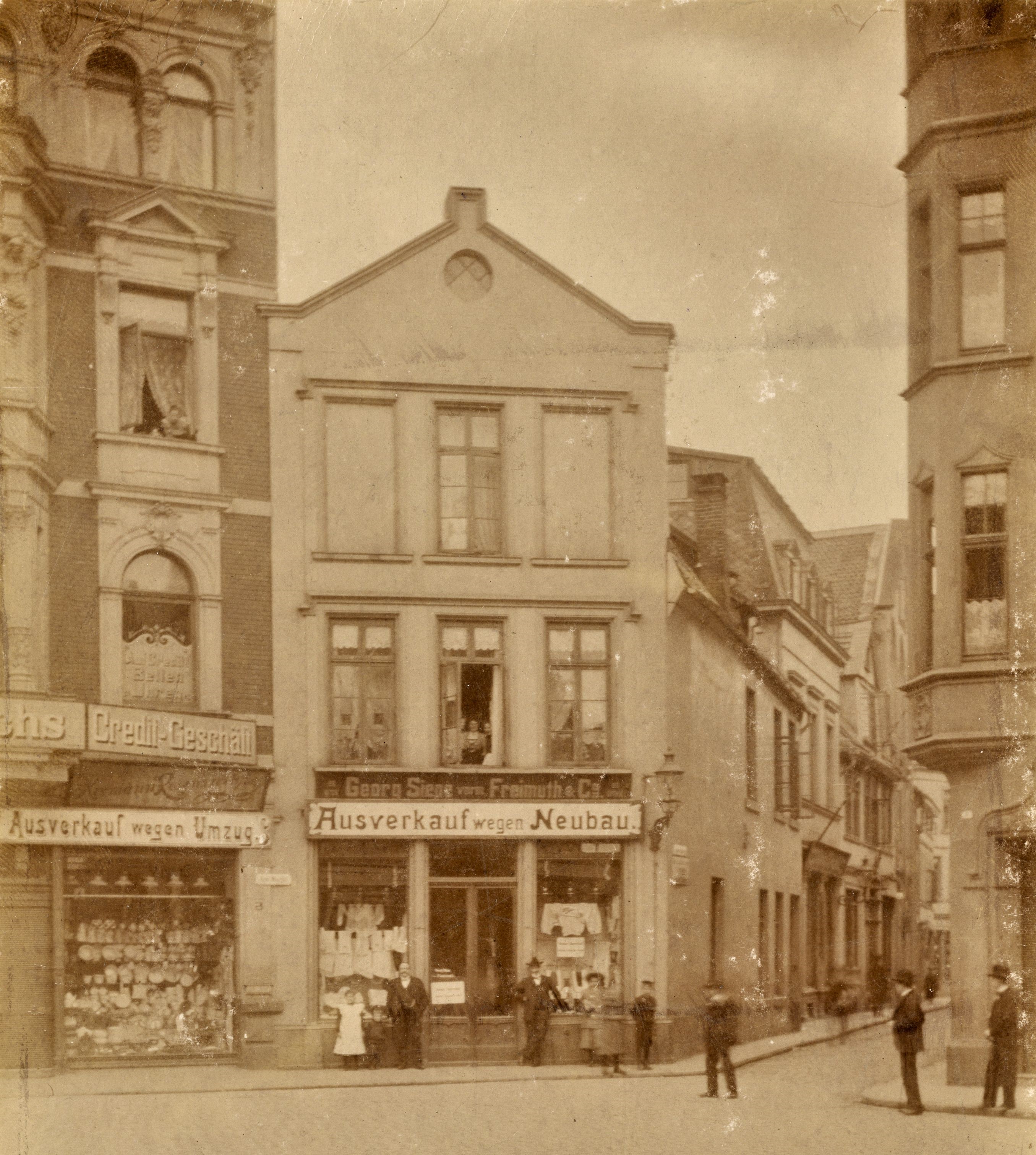 Das Haus Am Markt 7 (vormals Am Markt 60) um das Jahr 1902. Hier befanden sich im Juni 1872 die Garnhandlung H. Kade und die Buchhandlung von Moritz Pfeffer. Das links zu sehende Gebäude Rathausstraße 2/4 (vormals Am Markt 8, heute Alter Markt 8) war 1894 als Neubau entstanden. Auch an der Adresse Am Markt 7 (später Alter Markt 7) wurde kurz nach Entstehung dieser Aufnahme ein 1903 fertiggestellter Neubau errichtet. (Stadtarchiv Bielefeld, Bestand 400,3/Fotosammlung, Nr. 11-44-37)