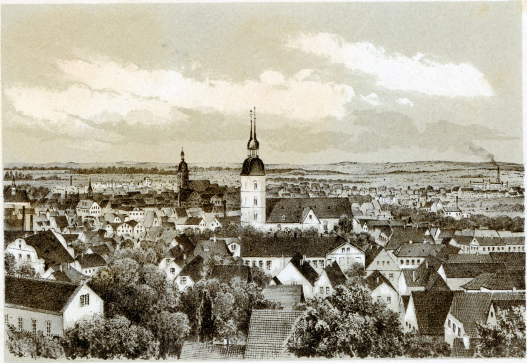 Blick vom Ausflugslokal „Berglust“ am Sparrenberg auf Bielefeld; Lithographie von Robert Geissler (Berlin) aus dem Sortiment der Pfefferschen Buchhandlung (Stadtarchiv Bielefeld, Bestand 400,3/Fotosammlung, Nr. 12-2-26)