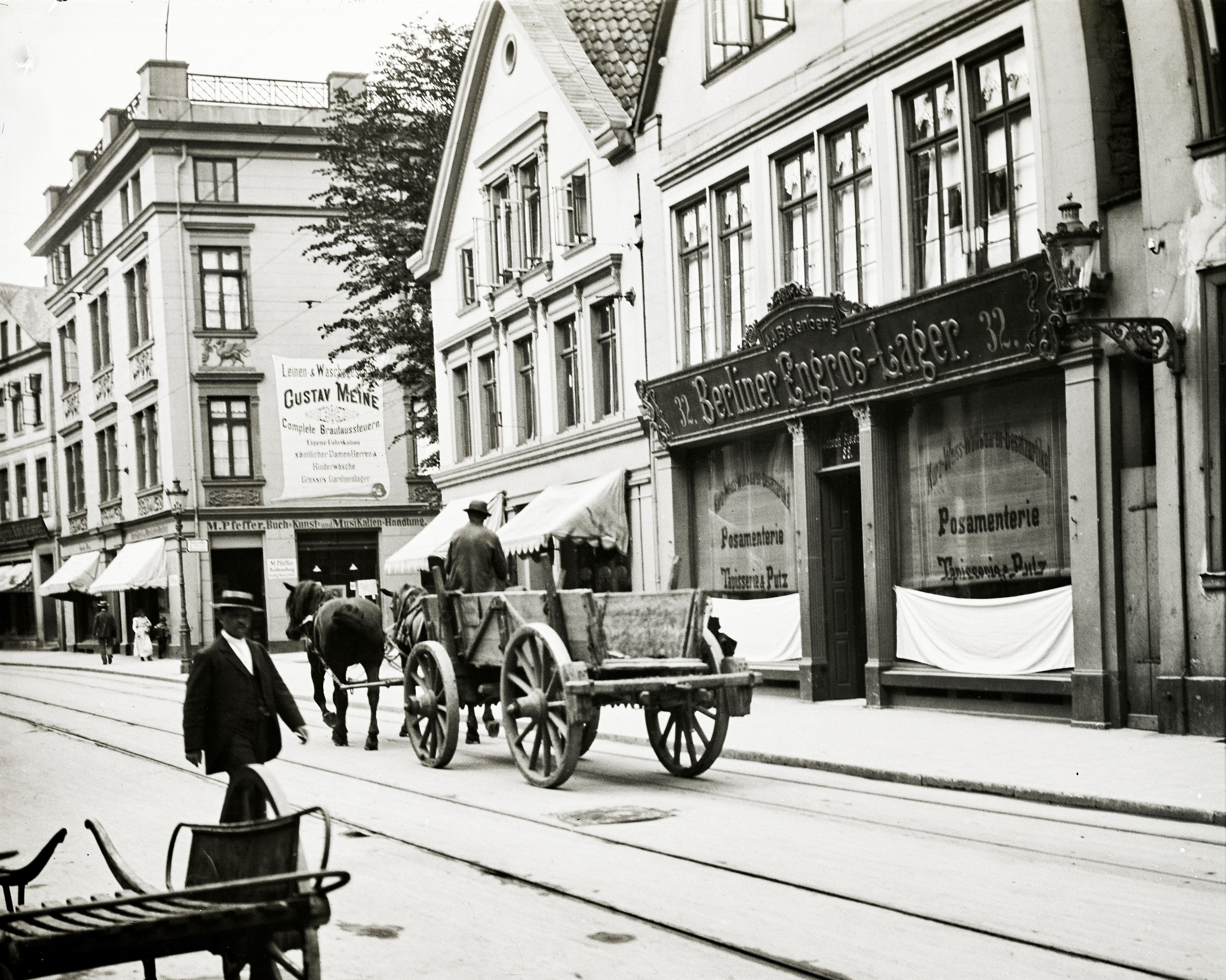 Die Obernstraße im Jahr 1902. Im Hintergrund links ist das Gebäude Obernstraße 36 mit der Pfefferschen Buchhandlung im Erdgeschoss zu erkennen (Stadtarchiv Bielefeld, Bestand 200,158/Bildarchiv Hermann Albrecht Insinger, Nr. 139d_4)