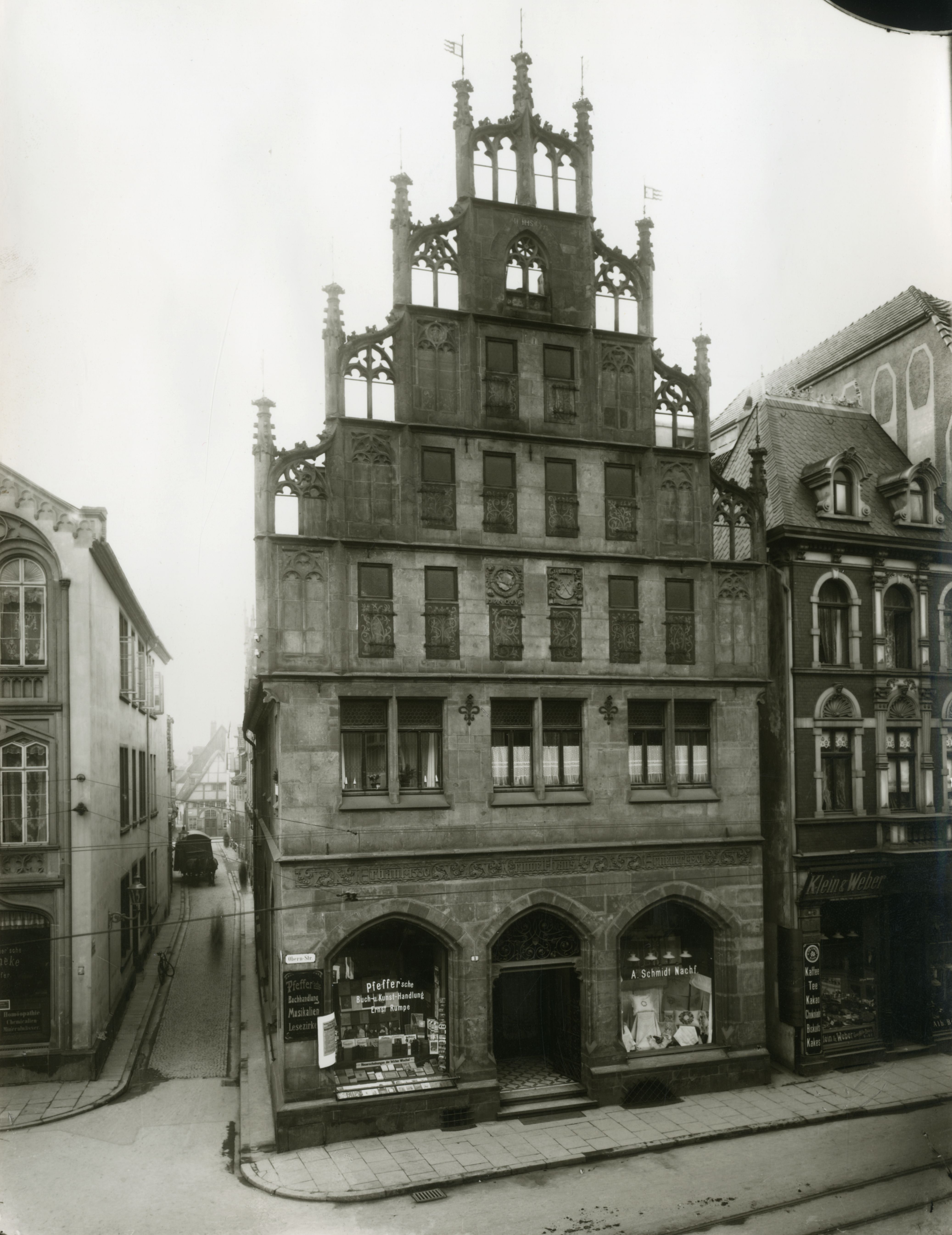 Das Crüwellhaus in der Obernstraße 1 um 1920. Im Erdgeschoss links die Pfeffersche Buchhandlung (Stadtarchiv Bielefeld, Bestand 400,3/Fotosammlung, Nr. 11-1554-78)