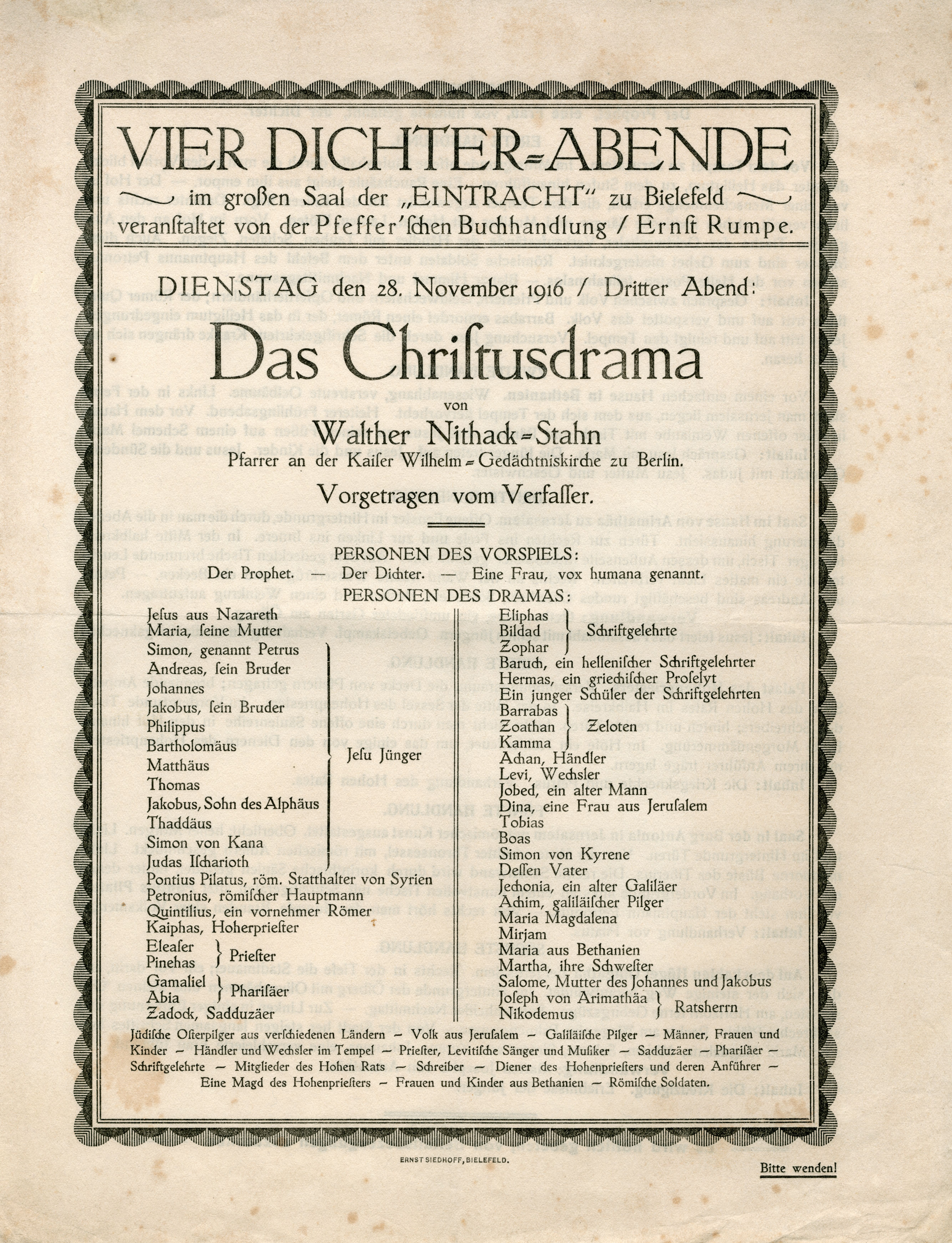 Anzeige zu einem Dichterabend der Pfefferschen Buchhandlung am 28.11.1916 (Stadtarchiv Bielefeld, Bestand 400,10/Zeitgeschichtliche Sammlung, Nr. 6083)