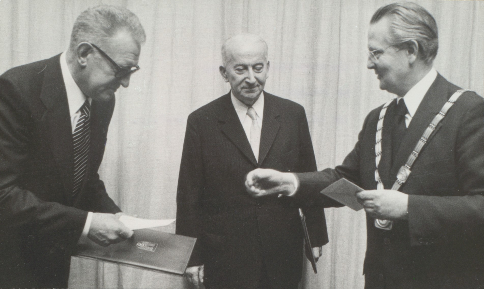Gustav Werk (Mitte) erhält zusammen mit Rolf Dircksen (links) von OB Herbert Hinnendahl den Kulturpreis der Stadt Bielefeld (Stadtarchiv Bielefeld, Bestand 200,96/NL Herbert Hinnendahl, Nr. 63)