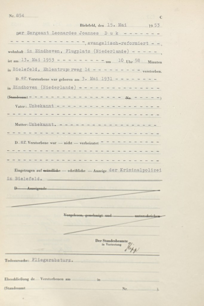 Wie sich nach einer gewissen Zeit herausstellte, hatte der 22-jährige Pilot Leonardus Joannes Duk, Sergeant der niederländischen Luftwaffe, während eines in Eindhoven gestarteten Navigationsflugs aus Richtung Osnabrück kommend, die Kontrolle über seine Maschine „F-84G Thunderjet“ verloren und war mit dem Militärflugzeug um 10.58 Uhr direkt in den Bereich der Nummern 14 und 16 am Ehlentruper Weg gestürzt. Dabei durchschlug er die Nr. 14, ein dreistöckiges Wohnhaus. Die Maschine bohrte sich etwa drei Meter tief in das Erdreich, was die Wucht des Einschlags deutlich macht. Duk war vermutlich gebürtig aus Eindhoven, andere Quellen wiederum nennen den kleinen Ort Badhoevedorp als Herkunftsort, in Sichtweite des Amsterdamer Flughafens Schiphol gelegen. Der Pilot hatte bei dem Absturz keine Chance: Abgesehen von unwesentlichen Fragmenten war der größte Teil seines Körpers vermutlich direkt „atomisiert“ worden.
