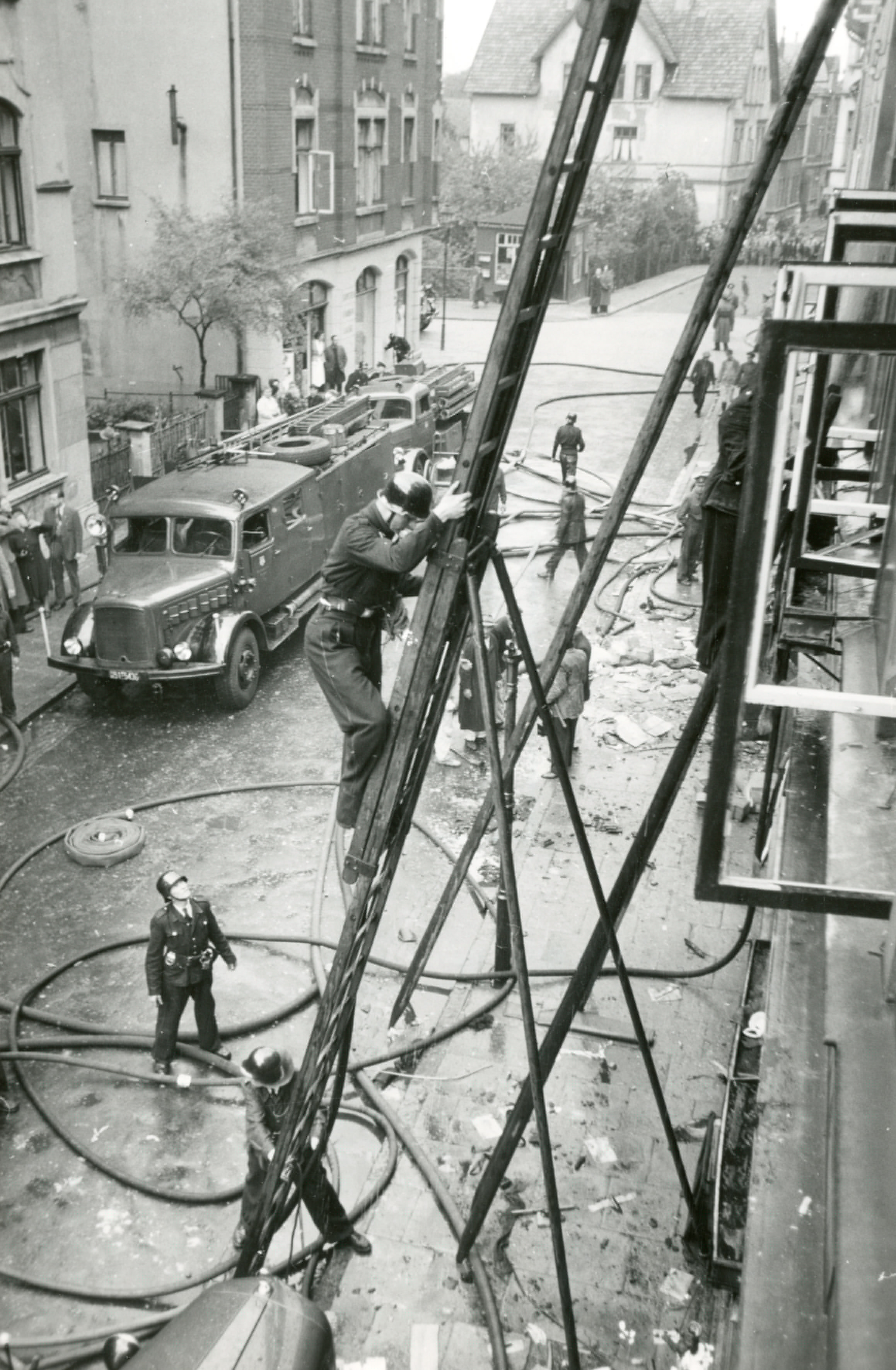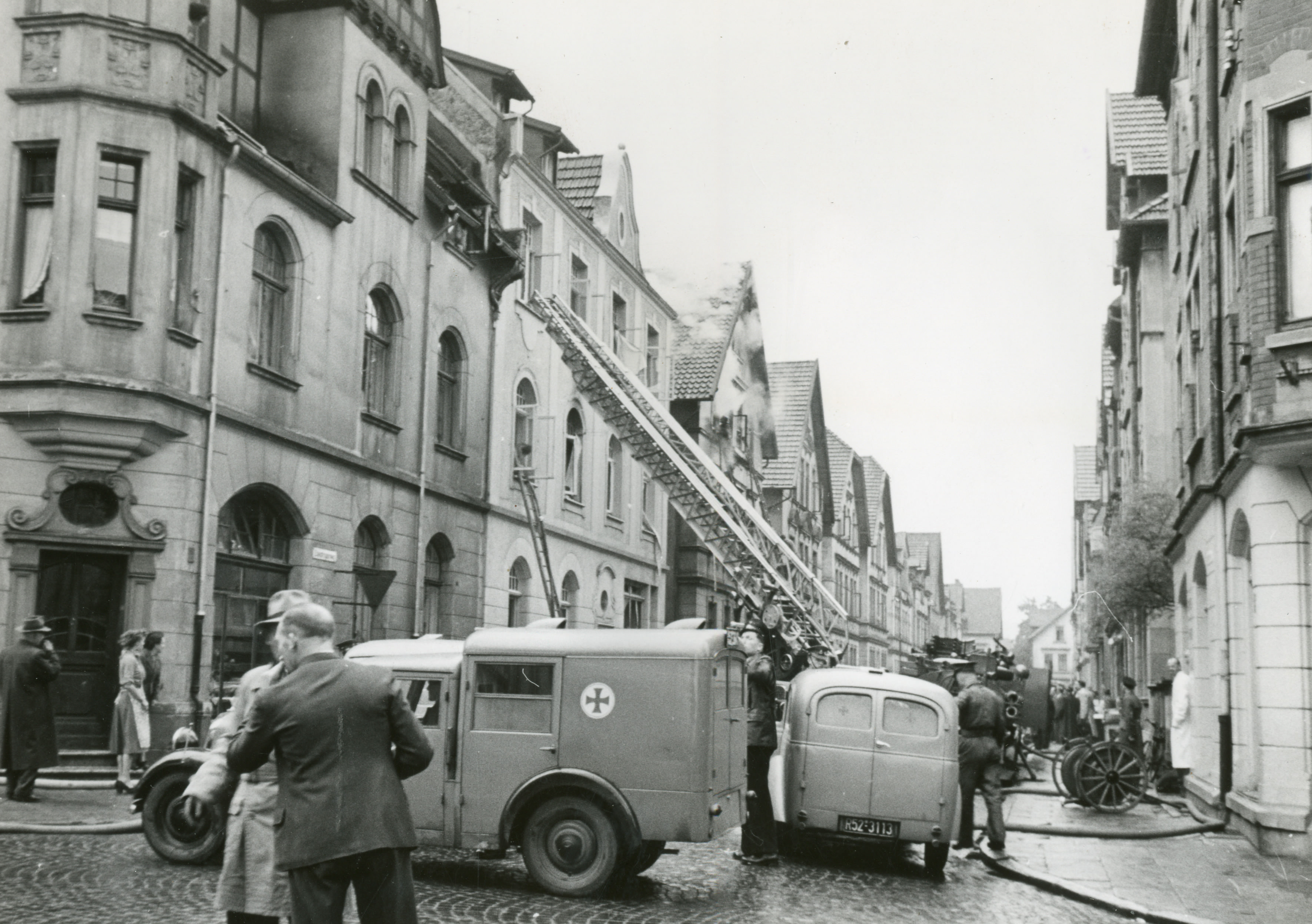 Um 11.01 Uhr ging der erste Notruf bei der Bielefelder Feuerwehr ein, um 11.09 Uhr wurde die Alarmstufe 5 ausgegeben – womit den beteiligten städtischen Einsatzkräften endgültig klar wurde, dass es sich um einen Großeinsatz handelte. Dementsprechend eilten alle einsatzbereiten Löschgruppen und potentiellen medizinischen Helfer an den Unfallort. Eine Minute später wurde das Deutsche Rote Kreuz alarmiert, gleichzeitig auch sämtliche verfügbare Krankenwagen des Landkreises angefordert. Aus den umliegenden Straßen war schnell eine große Menge Schaulustiger an den Ort des Geschehens geeilt, was den Rettungsmannschaften das Erreichen der Unglücksstelle teilweise erschwerte. Über der Einsturzstelle stand eine etwa 100 Meter hohe Rauchsäule, da beide Häuser sofort in Flammen gestanden hatten. Augenzeugen berichteten, wie aus den Fenstern laut um Hilfe geschrien wurde. Hausbewohner konnten die brennenden Gebäude nicht eigenständig verlassen, da das Feuer die Treppenhäuser unpassierbar machte. Mit Hilfe der Feuerwehr wurden jedoch alle gerettet, viele über Leitern. Zehn Personen waren verletzt worden, darunter drei schwer. 17 Familien, über 50 Personen, hatten ihre Unterkunft verloren.