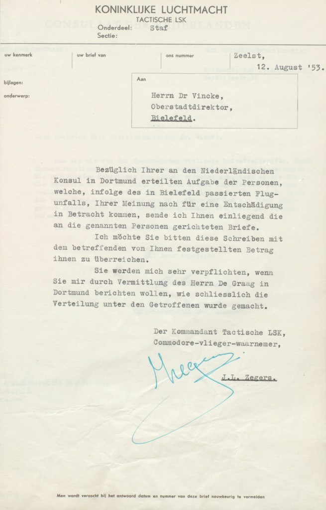 Am 15. Mai meldete sich erstmals ein Vertreter der Niederlande bei den städtischen Behörden. Konsul de Graag mit Sitz in Dortmund, der telefonisch beim Oberstadtdirektor Dr. Eberhard Vincke (1896-1977) vorstellig wurde, bat in seinem und im Namen der Regierung, der Stadt und den betroffenen Familien die „herzliche Teilnahme“ zu übermitteln. Er teilte auch mit, dass die Entschädigungsfrage schnell geregelt werden solle. Folglich trafen auch bald danach Angehörige der Niederländischen Luftwaffe in Bielefeld ein, um die weiteren Modalitäten zu verfügen. Der Hauptausschuss legte am 20. Mai auf Antrag Vinckes fest, dass städtische Dienstkräfte als Vermittler zwischen den geschädigten Bürgerinnen und Bürgern sowie der Niederländischen Regierung auftreten sollten. Um schnelle Hilfe leisten zu können, war bis zur endgültigen Zusicherung der vollständigen Übernahme aller Kosten durch die Niederländer die Stadt eingetreten und hatte in diesem Zuge eine Soforthilfe von insgesamt 30.000 Deutschen Mark zur Verfügung gestellt.