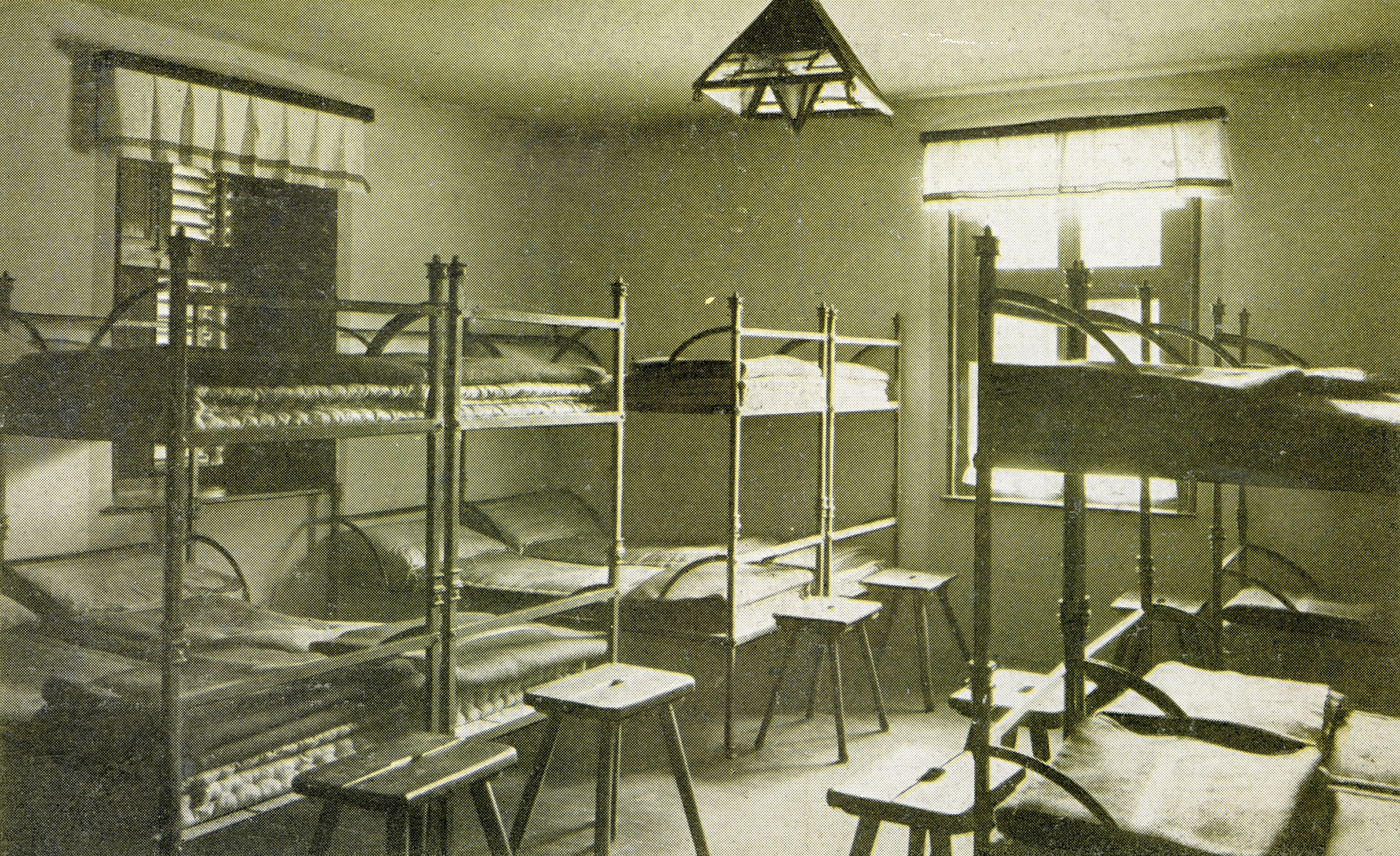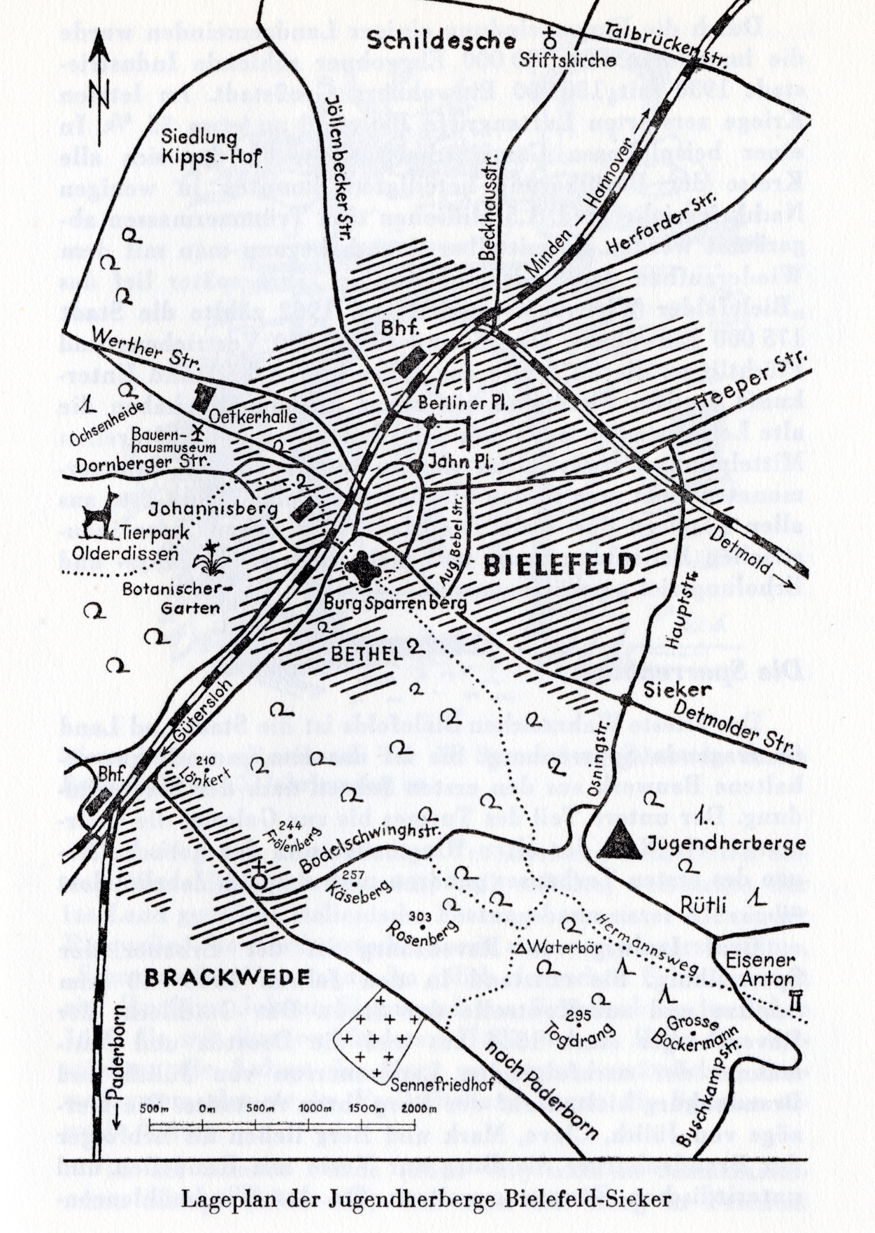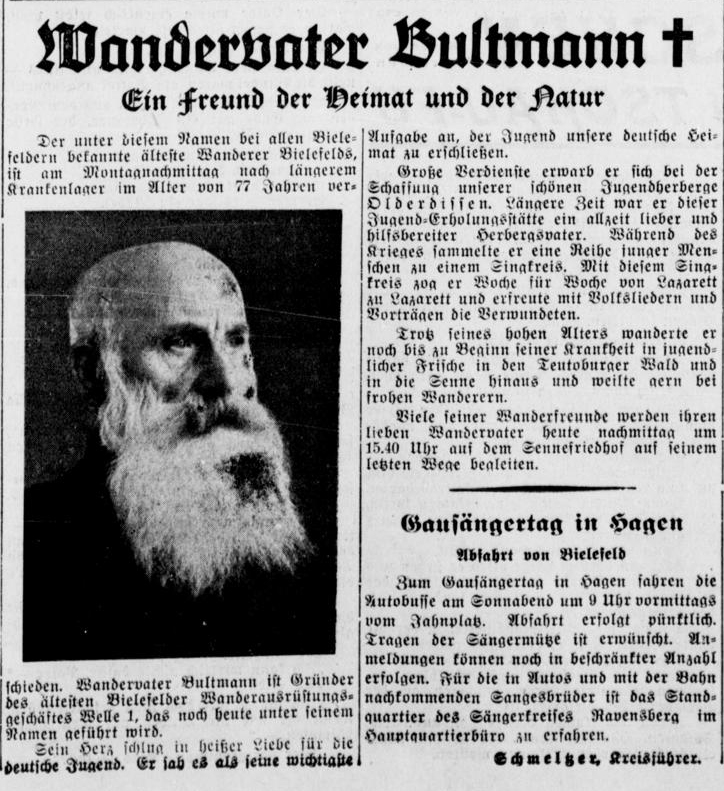 Zehn Jahre später, 1921, richtete die Stadt Bielefeld in Zusammenarbeit mit dem als „Wandervater“ bekannten Heinrich Bultmann (1857-1934) zunächst eine behelfsmäßige Wanderherberge auf dem ehemaligen ‚Besselschen Grundstück‘ in der Breiten Straße ein. Der begeisterte Wanderer Bultmann betrieb am Schillerplatz 23 ein Geschäft für Wanderausrüstungen, ebenso leitete er Wander- und Singkreise und engagierte sich im Zweigausschuss Oberweser des Jugendherbergsverbands. Im Zuge der Bereitstellung einer Baracke durch die Stadt kümmerte er sich um die Betreuung der Unterkunft. Diese erste frühe Herberge für Wanderer verfügte über zwei Schlafräume mit 32 Militärbetten, in denen Gäste auf Strohsäcken die Nacht verbringen konnten, wobei eine Übernachtung mit 50 Pfennig zu Buche schlug.