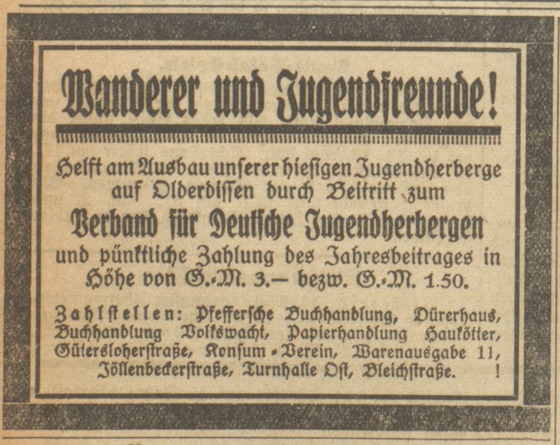 In den Westfälischen Neuesten Nachrichten vom 20. April 1921 wird die Einrichtung der Jugendherberge in der Breiten Straße genannt: „Hier im Ravensberger Land arbeitet der Zweigausschuß Oberweser des Verbandes Deutscher Jugendherbergen, in dem besonders der Wandervater Bultmann-Bielefeld seine selbstlose Arbeit entfaltet. Unter seiner Leitung ist jetzt auf dem früher Besselschen Grundstück an der Breiten Straße eine Wander-Jugendherberge eingerichtet worden. Die Stadt Bielefeld hat zu diesem Zwecke eine Baracke zur Verfügung gestellt (…).“ Der Zeitungsartikel ist auch unter dem Beitrag verlinkt.