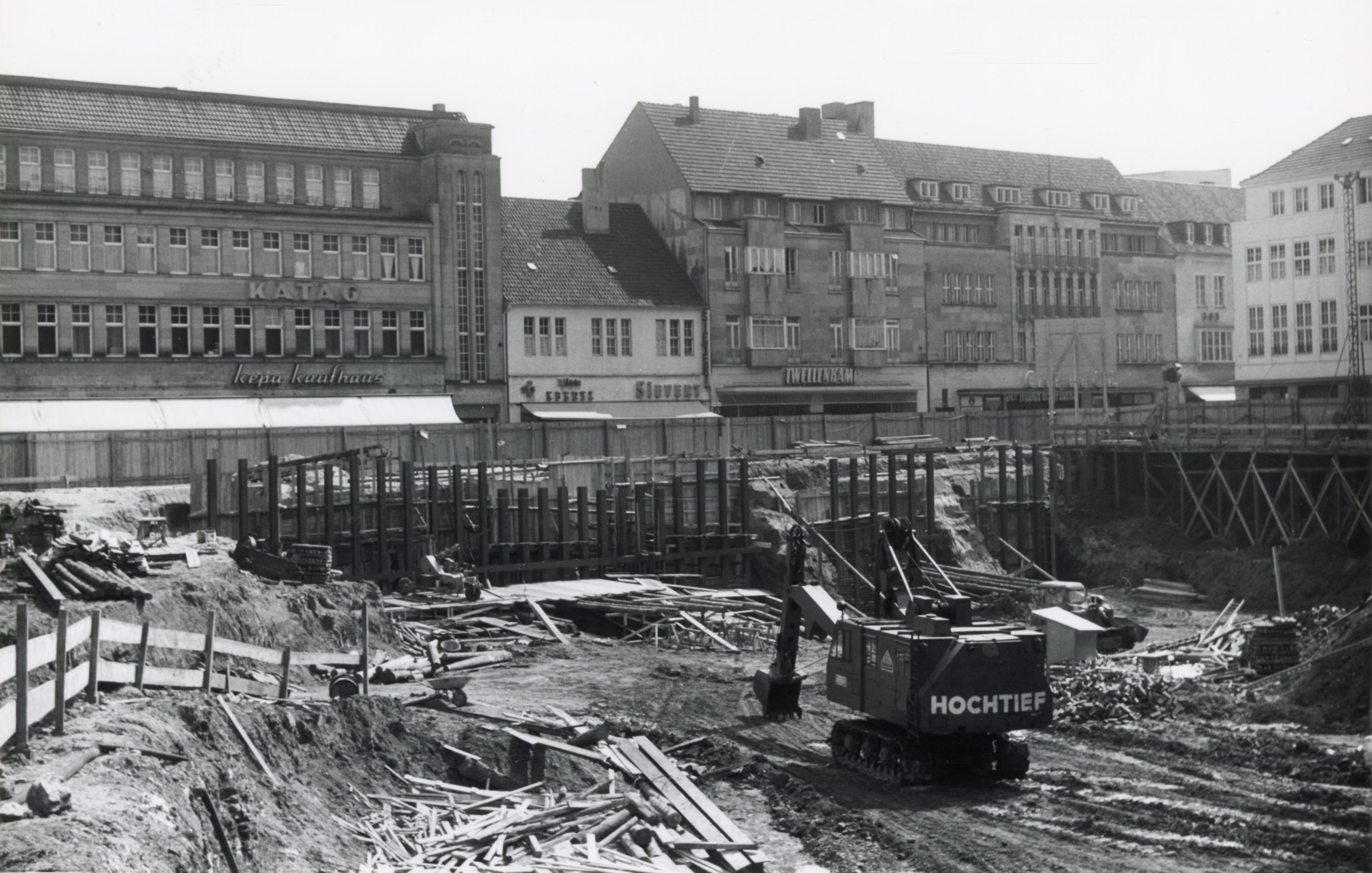 Trotz der schnellen Abbrucharbeiten lag die sich nunmehr als riesige Baugrube präsentierende Großbaustelle im Frühjahr 1962 allerdings für einige Wochen brach, da das städtische Bauordnungsamt den geänderten Durchführungsplan erst am 21. Mai 1962 – einen Tag vor Beschluss eines Bauverbotsgesetzes durch den Bundestag – genehmigte. Einen Monat später konnte mit den Bauvorbereitungen begonnen werden. Um bei den nun durchzuführenden und bis zu 11 Meter Tiefe reichenden Ausschachtungen das Einstürzen der aus bröckligem Schieferton bestehenden Erdmassen zu verhindern, wurde eine sogenannte Berliner Wand aus senkrechten Stahlträgern und querliegenden Füllhölzern errichtet, wie sie beim Bau der U-Bahnen in Berlin in den 1930er-Jahren zum Einsatz gekommen war. Die auch als Berliner Verbau bezeichnete Berliner Wand wurde wiederum durch Betonanker mit vorgespanntem Stahl gestützt. Der eigentliche Bau der Karstadt-Filiale setzte jedoch erst nach dem im Januar 1963 erfolgten Abbruch des verbliebenen Gebäudes Bahnhofstraße 19a ein.