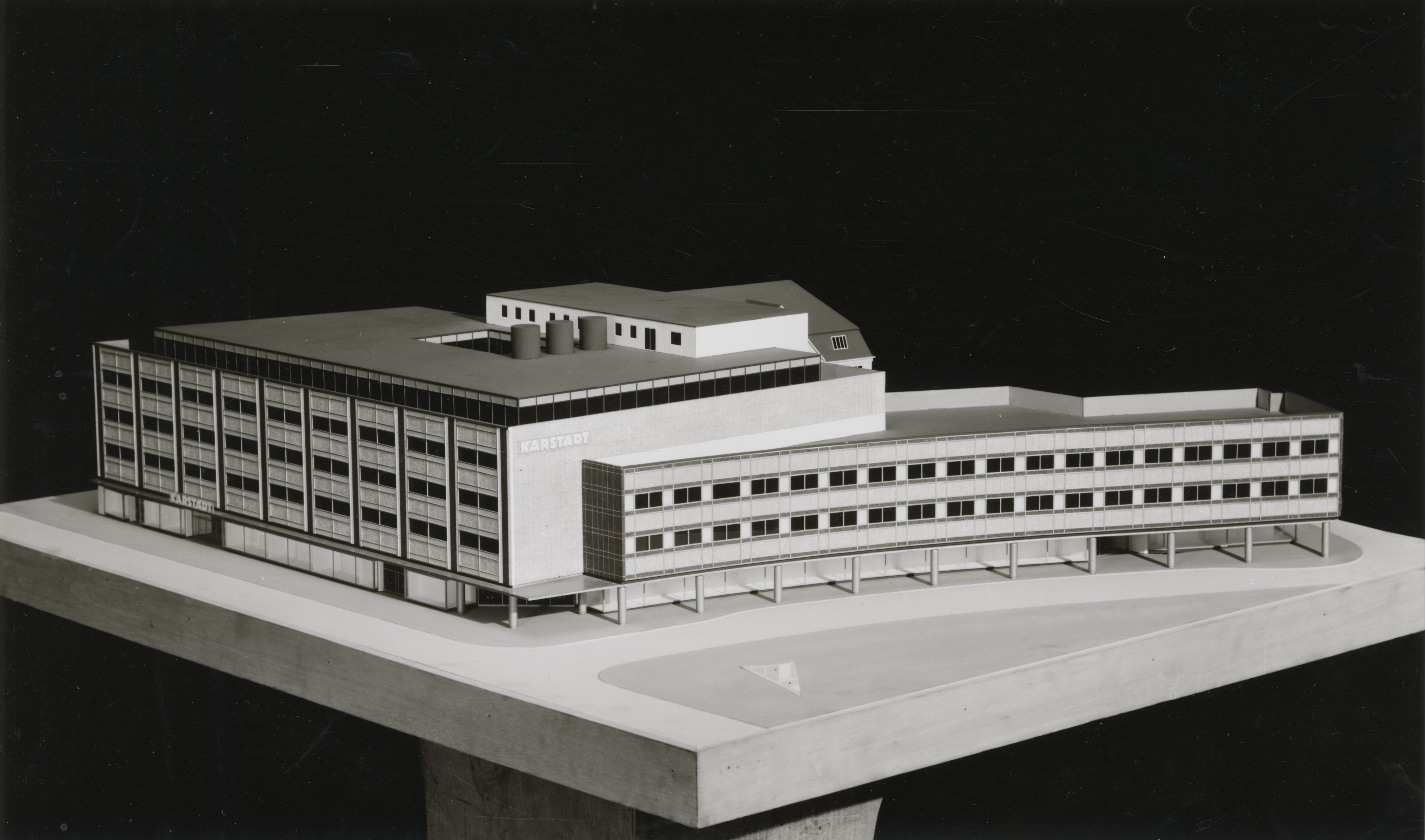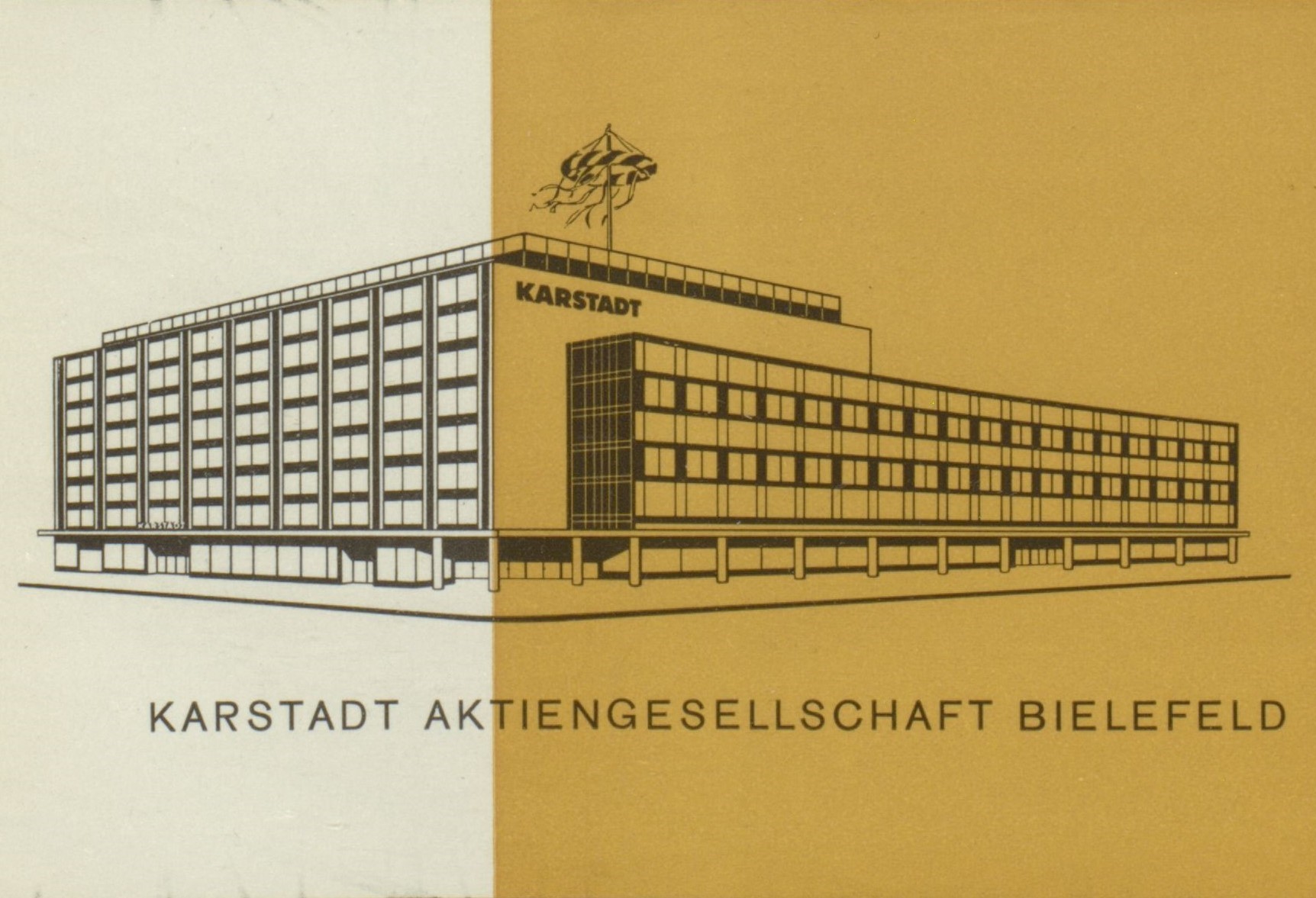 Am 19. November 1963 fand um 11 Uhr in der Gaststätte Die Insel am Klosterplatz 9 eine Pressekonferenz statt, in deren Rahmen das Modell des Bielefelder Karstadt-Hauses eingehend erläutert wurde. Vier Stunden später folgte das Richtfest für den weit fortgeschrittenen Neubau, das mit einem im Haus des Handwerks abgehaltenen Festessen endete, bei dem die geladenen Gäste neben dem Hauptgang mit Bier, Korn, Zigarren, Zigaretten und Schokolade verköstigt wurden. Bis März 1964 war die bundesweit 54. Karstadt-Filiale – eine der zehn größten ihrer Art in der Bundesrepublik – schließlich fertiggestellt: Das von der Karstadt-Bauabteilung in Zusammenarbeit mit dem Bielefelder Architekten Karl Obbelode (1897-1971) entworfene und für 25 Millionen DM errichtete Gebäude umfasste einen umbauten Raum von 110.946 m3, eine Nutzfläche von 24.756 m2 und eine Verkaufsfläche von 12.518,20 m2. An der Bahnhofstraße war ein viergeschossiger Hauptbau mit einem zusätzlichen Staffelgeschoss und einem drei Meter weiten Kragdach, entlang der Arndtstraße wiederum ein dreigeschossiger Flügel mit Arkaden entstanden. Für die Verkleidung des Warenhauses, dessen Fassadengestaltung auf einen Entwurf des Architekten Hanns Dustmann (1902-1979) zurückging, waren die Natursteine Labrador, Lasa und Rauchkristall verwendet worden, während die Fenster und Schaufenster aus Leichtmetall bestanden. „Nun, wo man in geographischen Großraumplänen denkt, da muß man auch mit Großraummaßstäben bauen. Hier ist es geschehen“, lobte das Westfalen-Blatt am 11. März 1964 das neue Aushängeschild der Bahnhofstraße.