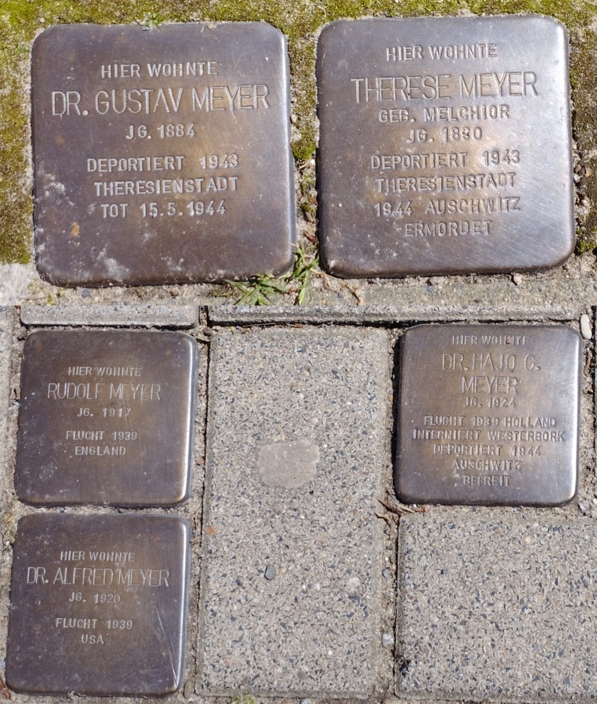 Die Stolpersteine in Bielefeld für Dr. Gustav, Therese, Rolf und Alfred Meyer wurden schon 2013 vor dem Haus in der Kavalleriestraße 14 gelegt, in dem die Familie zwischen 1922 und 1936 lebte. Der Ort gilt als letzter freiwilliger Wohnsitz, bevor sie 1936 zunächst in die Niedernstraße 43 zogen und Gustav und Therese 1942 in das „Judenhaus“ Lützowstraße 10 (heute: Karl-Eilers-Straße) eingewiesen wurden. Bei der ersten Verlegung der Stolpersteine 2013 war Hajo selbst zugegen. Nach seinem Tod ein Jahr später folgte auch für ihn die Verlegung eines Stolpersteins in der Kavalleriestraße 14. Damit liegen nun fünf Stolpersteine für die fünf geflüchteten und ermordeten Mitglieder der Familie Meyer und erinnern an ihr Leben mitten in Bielefeld. Die Namen von Dr. Gustav und Therese Meyer sind ebenfalls auf dem Mahnmal am Bielefelder Hauptbahnhof „Jede ermordete, jeder ermordete hat einen Namen“ eingraviert.