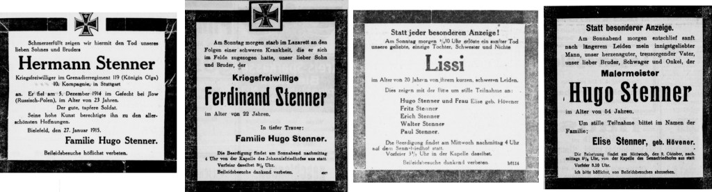 Hugo und Elise Stenner mussten um den vermissten Sohn Hermann bangen, gleichzeitig kämpfte ihr Sohn Hugo in einem Lazarett um sein Leben. Nach dem Tod Hugo Stenners müssen die Eltern Ende Januar vom Tod Hermann Stenners erfahren haben. Seine Todesanzeige erschien am 28. Januar 1915 in der Westfälischen Zeitung wie auch im Bielefelder General-Anzeiger. Mit Ferdinand Stenner starb am 20. Mai 1917 der dritte Sohn der Stenners in Lübeck im Königlichen Reservelazarett III an den unmittelbaren Folgen seines Kriegseinsatzes. Am 23.Juni 1918 verstarb nach kurzer Krankheit die Tochter „Lissi“ Stenner, wenige Monate später, am 5. Oktober 1918, Hugo Stenner sen., der seit Sommer 1913 an Diabetes erkrankt war.